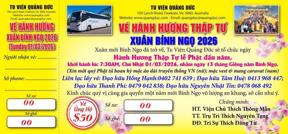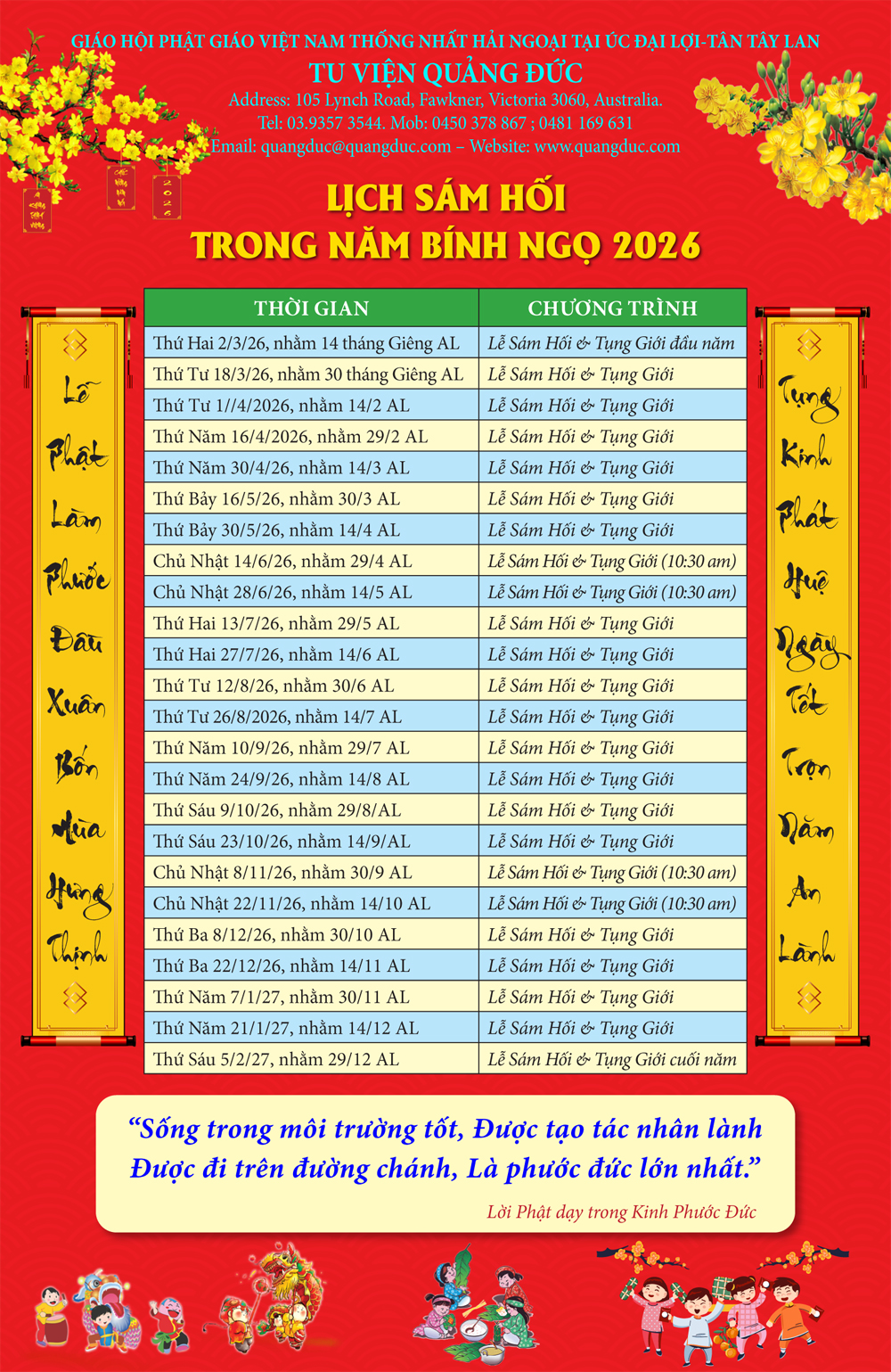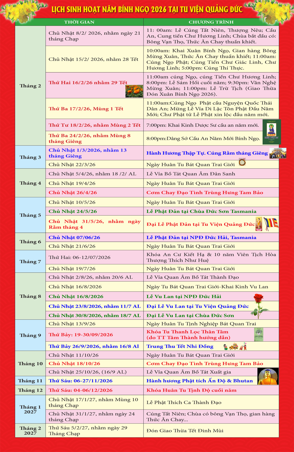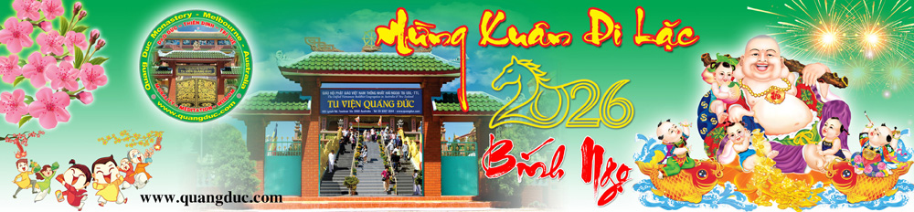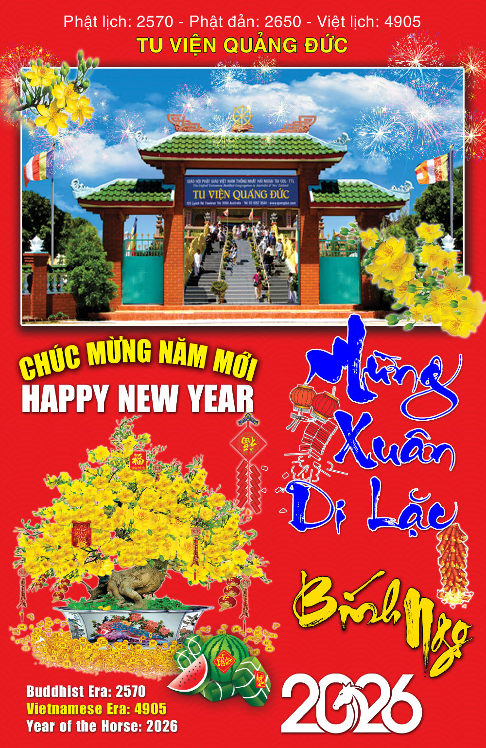 Quang Duc Monastery Lunar New Year Program 2026 ✻ Sunday, 08 February 2026: (21st day of the 12th Lunar Month) 11:00 am: Year-End Thanksgiving Ceremony and Raising of the New Year Pole; Prayers for Peace and Well-being; Offering to Ancestral Spirits. Marigold flowers and pure vegetarian food will be available at the Monastery. (For vegetarian food orders, please contact: Ms. Nguyên Như – 0451 603 248; Ms. Quảng Hạnh – 0431 179 568) ✻ Monday, 16 February 2026: (29th day of the Lunar Year) 11:00 am: Midday Offering to the Buddha; Offering to Enlightened Spirits and Ancestors. 5:00 pm: Offering Ceremony for Wandering Spirits. 8:00 pm: Year-End Repentance Ceremony. 9:30 pm: Lunar New Year Cultural Performance. 11:00 pm: New Year’s Eve Ceremony – Welcoming the Year of the Horse 2026. ✻ Tuesday, 17 February 2026: (1st Day of the Lunar New Year) 11:00 am: Midday Offering to the Buddha; Prayers for National Peace and Prosperity; Celebration of Maitreya Buddha’s Day; Devotees r