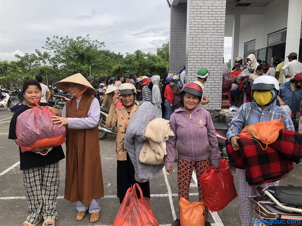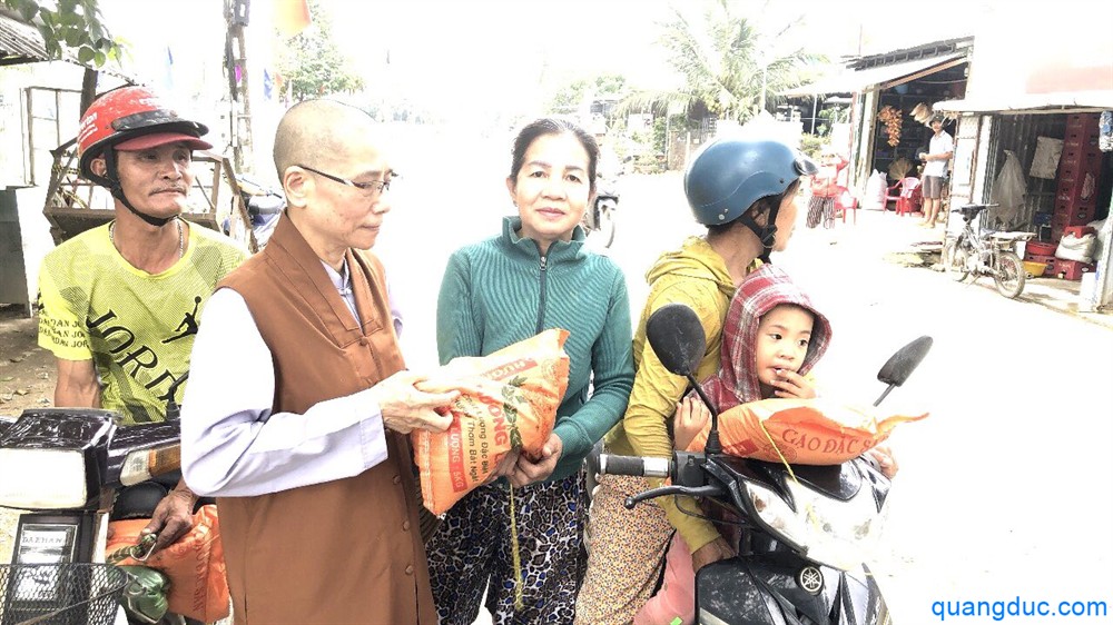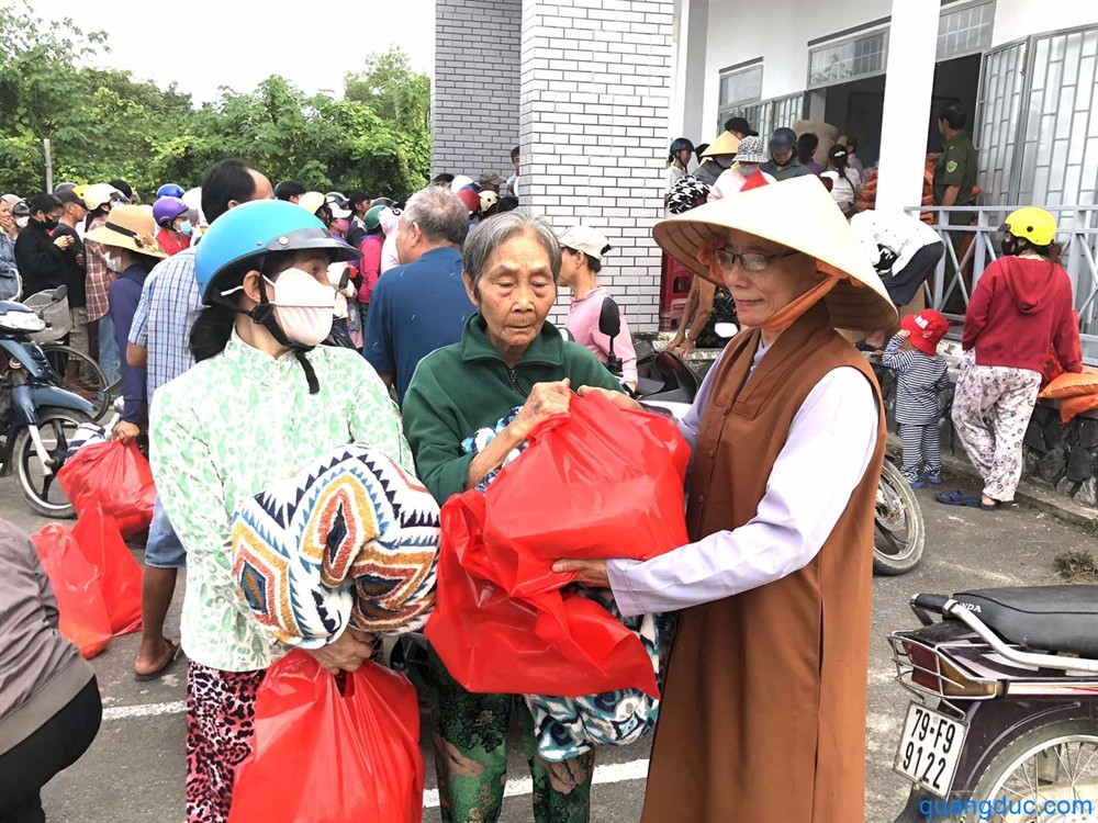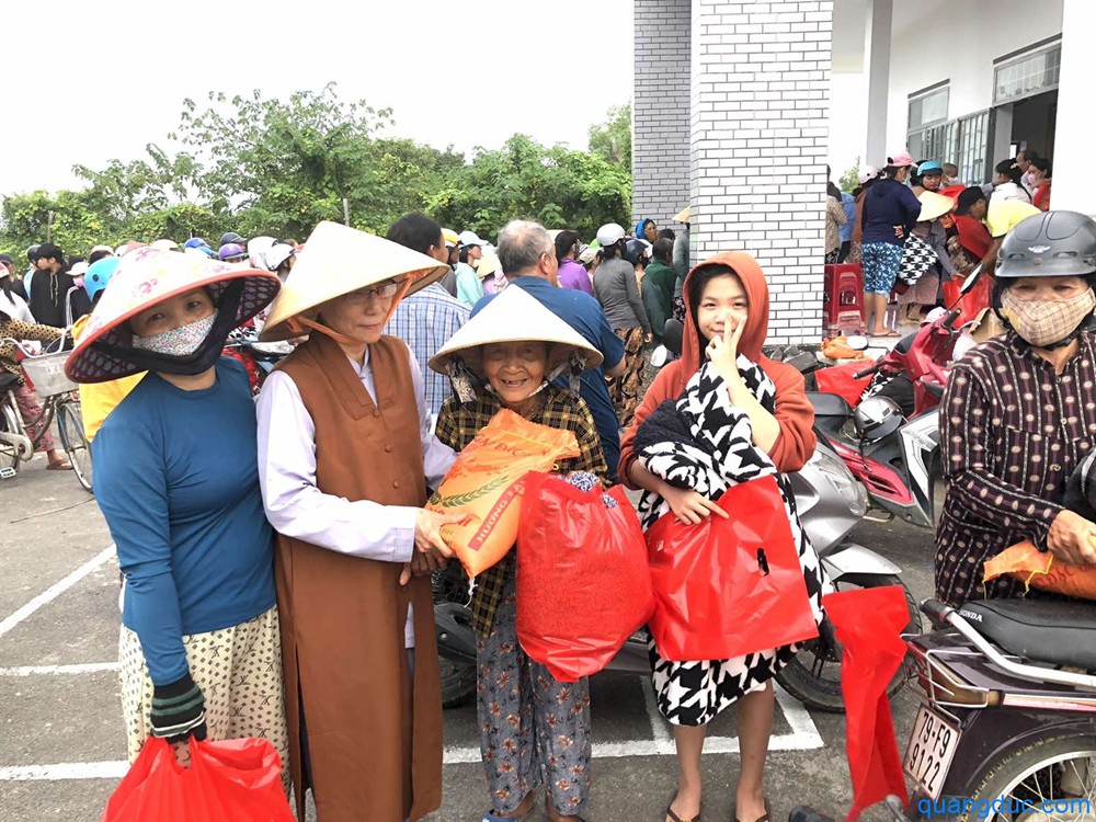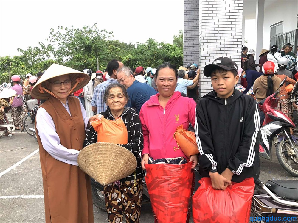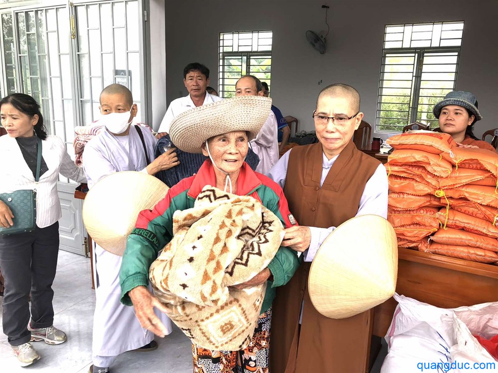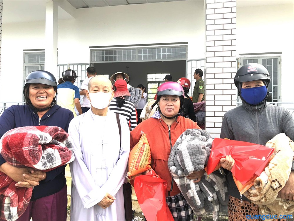 Tại mỗi địa điểm, Ni Sư và Phật tử đi cùng đã ân cần thăm hỏi, động viên tinh thần người dân, đồng thời gửi tặng 700 phần quà tình thương, gồm 1 bao gạo và tấm chăn, giúp bà con tạm ổn định đời sống sau thiên tai.