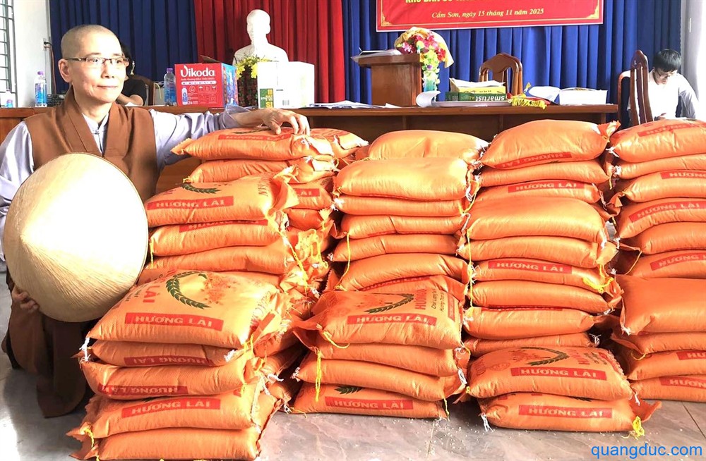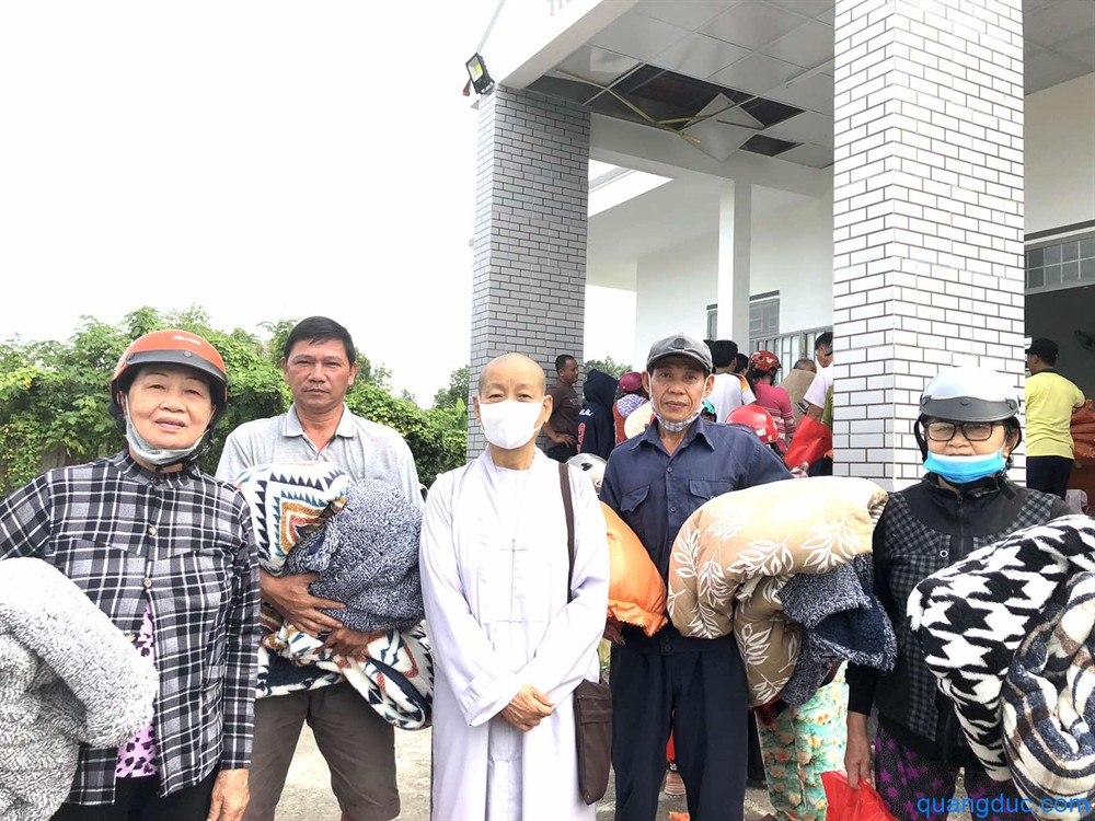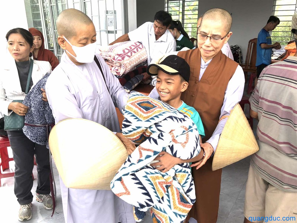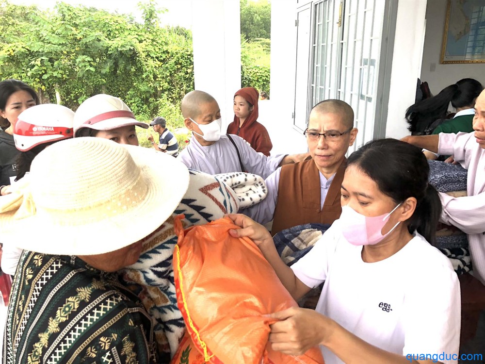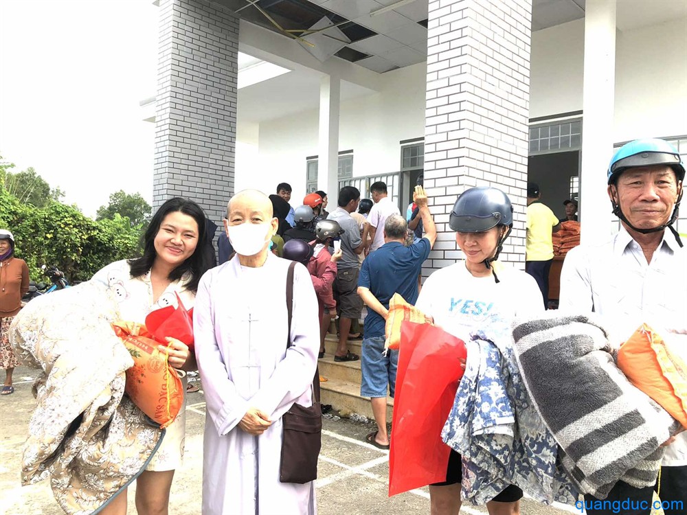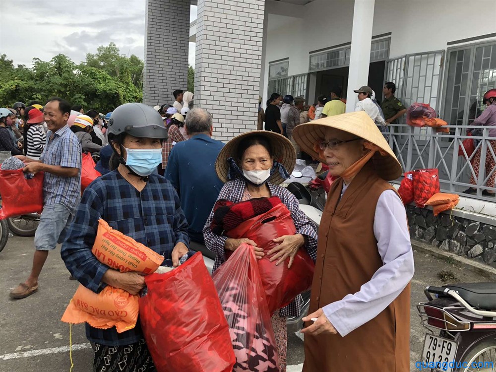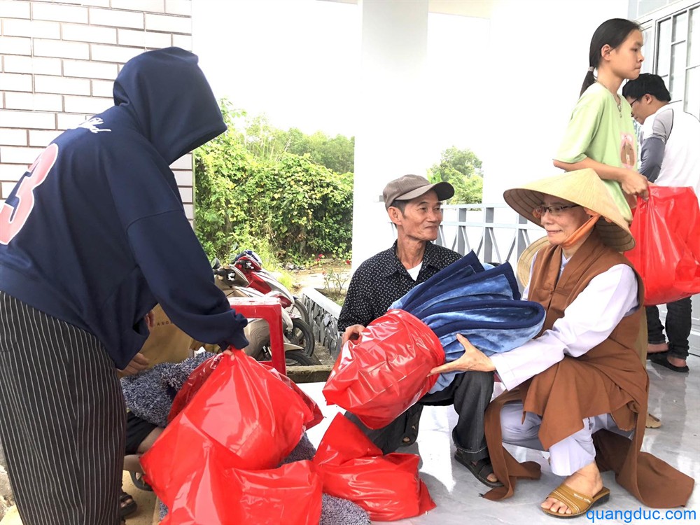 Tại mỗi địa điểm, Ni Sư và Phật tử đi cùng đã ân cần thăm hỏi, động viên tinh thần người dân, đồng thời gửi tặng 700 phần quà tình thương, gồm 1 bao gạo và tấm chăn, giúp bà con tạm ổn định đời sống sau thiên tai.