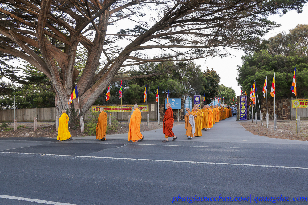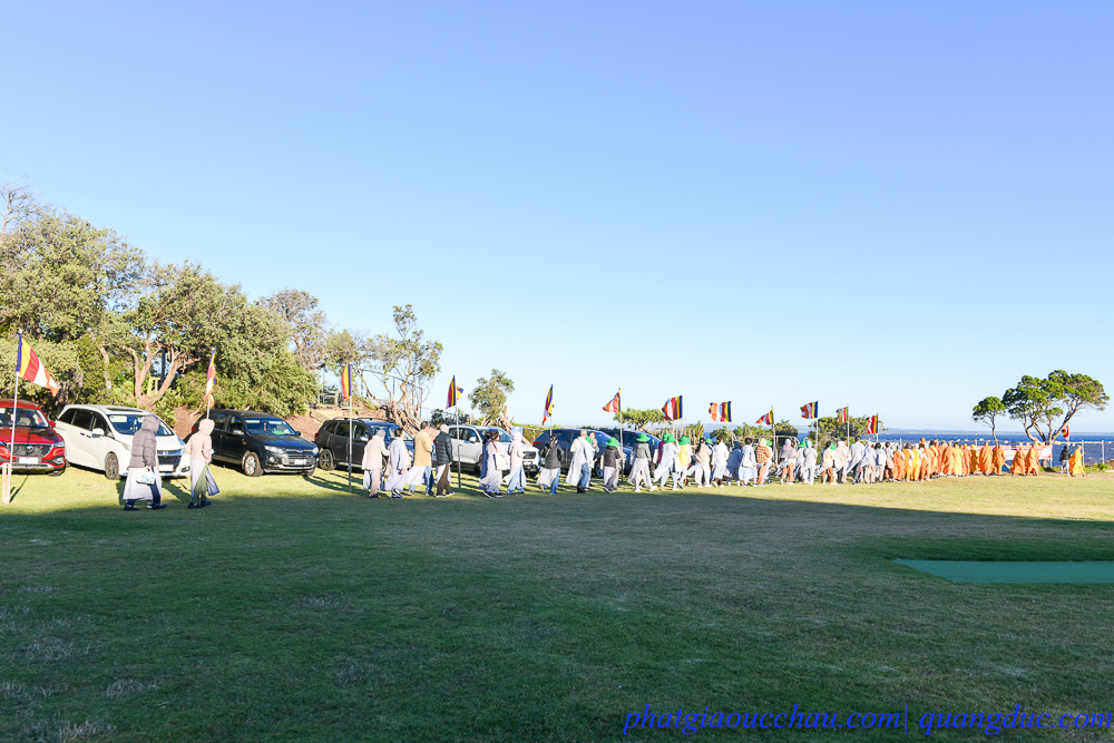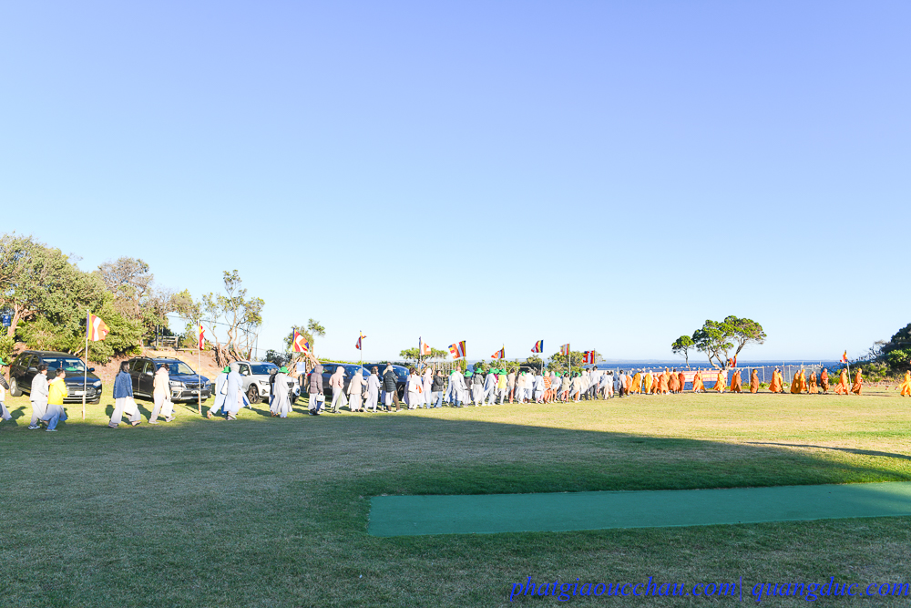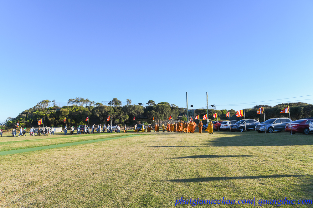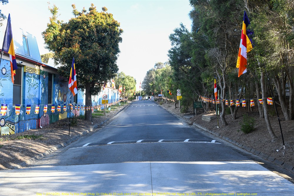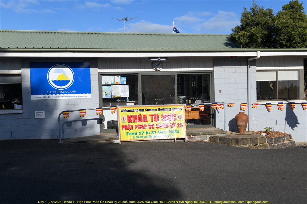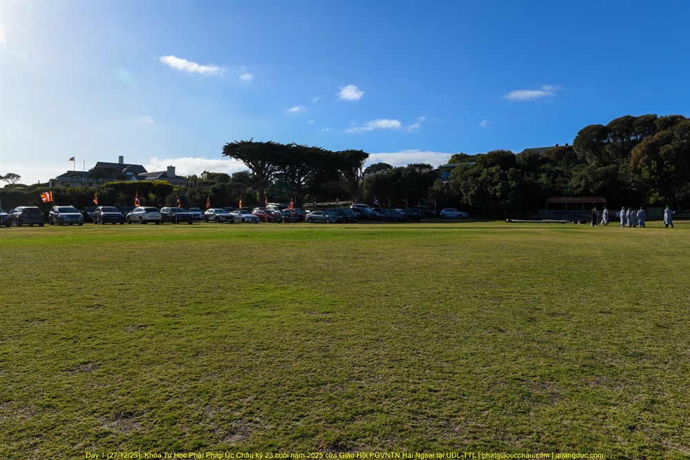 Khi đến nơi đất trại, chứng kiến sự rực rỡ của màu cờ ngũ sắc Phật giáo bay phất phới cộng thêm nhiều băng rôn song ngữ in kinh Pháp Cú và Kinh Chân Hạnh Phúc treo khắp nơi từ dọc đường, báo hiệu gần đến nơi, từ ngoài đường vào đến khu trại và đường xuống Carpark (sân vận động) 2 bên cờ cắm trang trọng một cách hoành tráng, vào Chánh Điện và Trai Đường rồi các phòng làm việc, phòng nghỉ, nhà bếp… các tiện nghi phục vụ ăn, ở cho người Tu và Học được an tâm và phấn khởi. Tất cả đều chuẩn bị chu đáo, sẵn sàng cho Lễ Khai Mạc vào Khoá Tu Học trong 5 ngày, thật đúng là một sự chuẩn bị nhiều công sức và đầy tâm huyết.