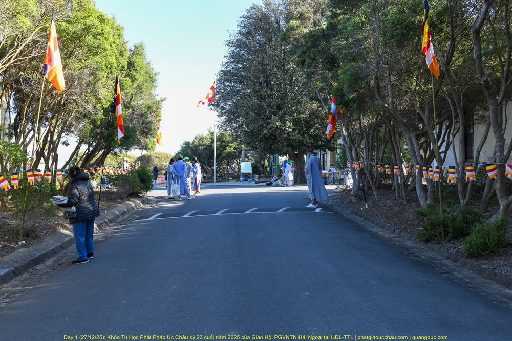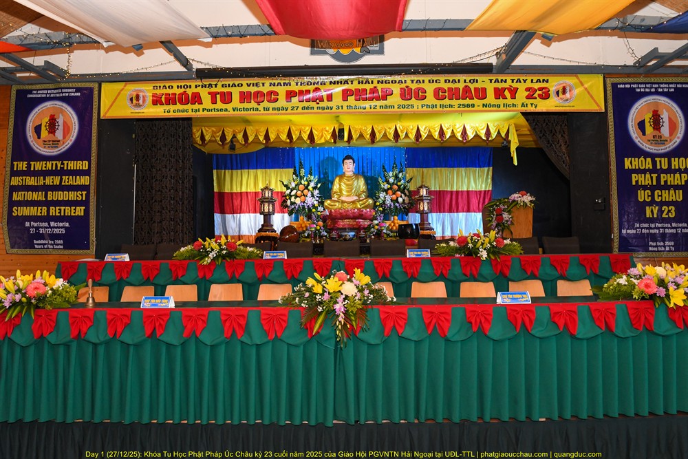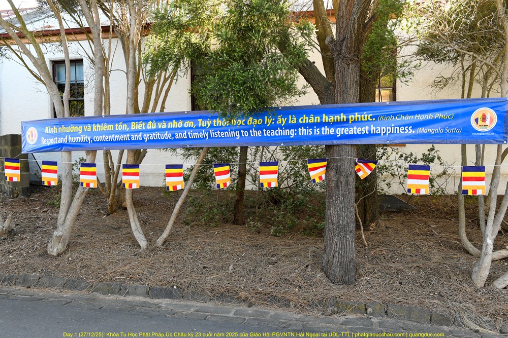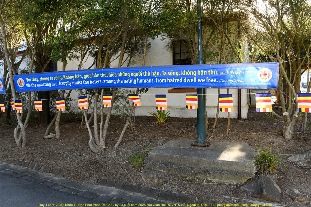 Chiều 26/12/2025 CTĐ và những HV PT tại các tiểu bang khác đã vân tập đầy đủ nên ban thiết trí, vận chuyển và ban cư trú đã phải chuẩn bị từ 2 ngày trước, rất là bận rộn và nhọc nhằn, các ban khác cũng đều phải tất bật để lo chuẩn bị cho phần hành của mình. Nói chung tất cả đều phải nỗ lực và phấn đấu cao, chấp nhận nhiều hy sinh, chia sẻ … với tâm nguyện phụng sự, chuẩn bị đầy đủ các băng rôn, biểu ngữ, treo đầy khắp các nơi từ Chánh điện, đến trai đường, phòng học và ngoài cổng, dọc đường đi ngay cả carpark, nhằm nhắc nhở HV trong tu học, có được kiến thức và tư lương để cũng cố niềm tin tiến đến giải thoát, giác ngộ. Từ đây có được một đạo tràng thật trang nghiêm, không kém phần hoành tráng. Chắc rằng với khí thế và năng lượng này sẽ hộ trì cho Khoá THPPUC kỳ 23 thành tựu viên mãn.