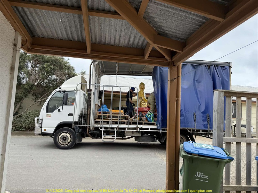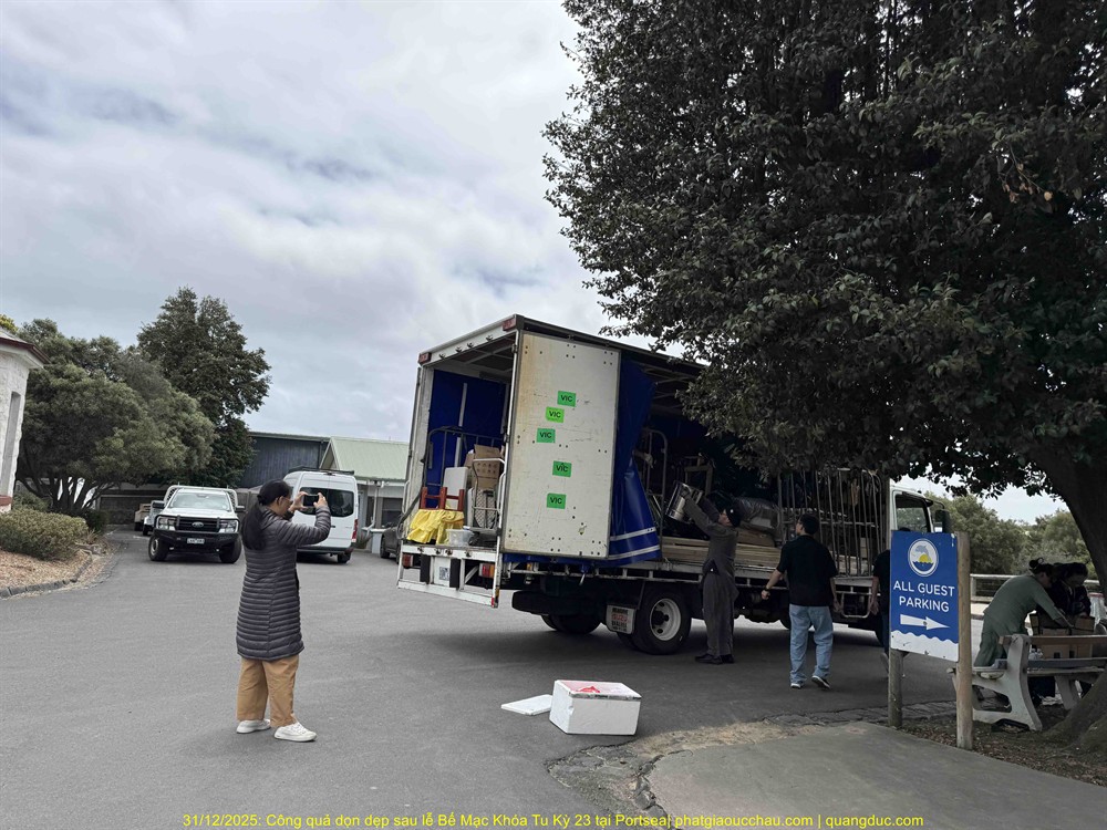 Vào lúc 5 giờ chiều cùng ngày, hai xe truck chở vật dụng từ Portsea đã lần lượt về đến Tu Viện Quảng Đức. Trong không khí hoan hỷ và ấm áp đạo tình, Hòa Thượng Viện Chủ Thích Thông Mẫn đã đích thân điều khiển xe forklift để chuyển toàn bộ vật dụng xuống xe, thể hiện tinh thần nêu gương phụng sự, cùng làm với đại chúng, không phân biệt vai trò hay chức vị. Đặc biệt, TT Thích Thường Tín và TT Thích Giác Nghĩa (2 vị khách tăng từ quê nhà VN) cũng đã xăn tay áo, trực tiếp phụ khiêng, sắp xếp và đưa vật dụng vào kho, hòa mình trọn vẹn trong dòng sinh hoạt công quả chung. Hình ảnh chư Tôn Đức cùng quý Phật tử vai kề vai, tay chung tay, mồ hôi hòa niềm vui, đã tạo nên một khung cảnh lục hòa sống động và đầy cảm xúc. Tất cả mọi người đều hoan hỷ chung tay góp sức, không ai nề hà nặng nhẹ, bởi trong lòng mỗi người đều chung một niềm vui: Khóa Tu Học Phật Pháp Úc Châu kỳ 23 vừa được thành tựu viên mãn. Chính tinh thần đoàn kết, khiêm cung và phụng sự ấy đã khép lại trọn vẹn hành trình năm ngày tu học, để lại dấu ấn đẹp khó phai trong lòng những người có mặt.