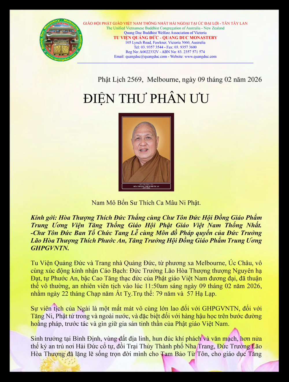 - Điện Thư Phân Ưu Tang Lễ Đức Trưởng Lão Hòa Thượng Thích Phước An (1947-2026)