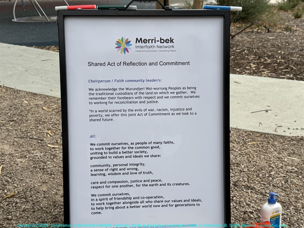 Trong phần Hành Động Chung về Suy Niệm và Cam Kết, đại diện các tôn giáo đã cùng nhau kính nhận và tri ân người Thổ Dân Úc Wurundjeri Woi-wurrung, những chủ nhân truyền thống của vùng đất nơi buổi lễ diễn ra; đồng thời tưởng nhớ tổ tiên của họ với lòng tôn kính sâu sắc và khẳng định cam kết chung trong công cuộc hòa giải và xây dựng công bằng xã hội.