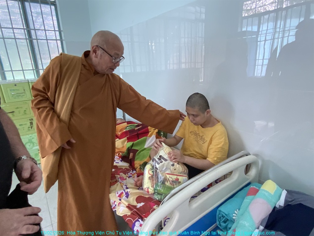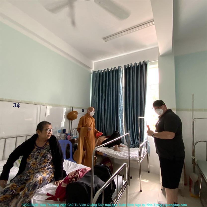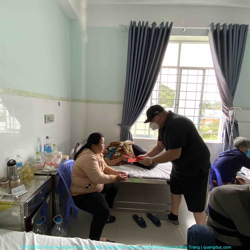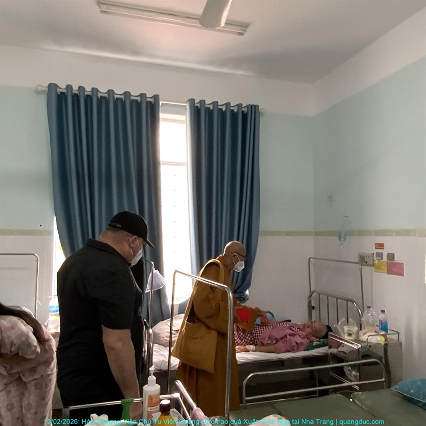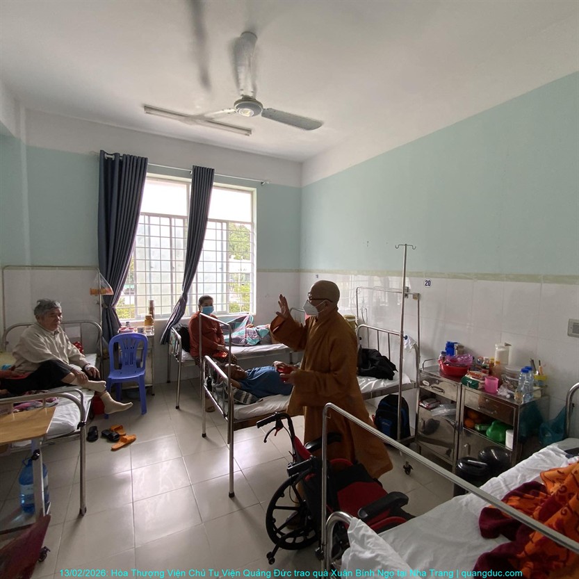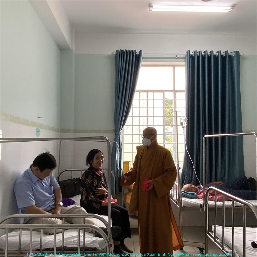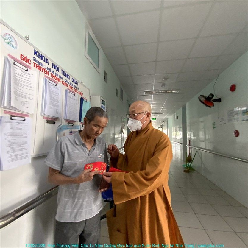 Hôm nay, ngày 26 tháng Tết (13/2/2026), Hòa Thượng Viện Chủ Tu Viện Quảng Đức, Hòa Thượng Thích Thông Mẫn, đã thân lâm Bệnh viện Ung Bướu tỉnh Khánh Hòa để thăm hỏi và trao tặng 100 phần quà Xuân đến các bệnh nhân cùng thân nhân đang ngày đêm túc trực chăm sóc. Mỗi phần quà tuy đơn sơ gồm bánh và 200.000 đồng tiền mặt, nhưng chất chứa trong đó là tấm lòng sẻ chia và lời chúc an lành đầu năm mới. Giữa những ngày giáp Tết, khi nỗi lo bệnh tật còn nặng trĩu, sự hiện diện ân cần của Hòa Thượng cùng những món quà nghĩa tình đã phần nào sưởi ấm lòng người, mang đến niềm động viên và hy vọng.