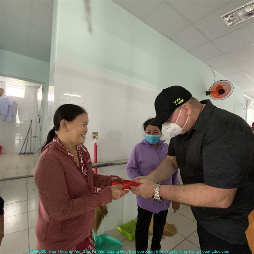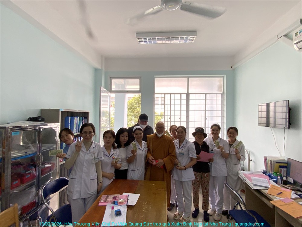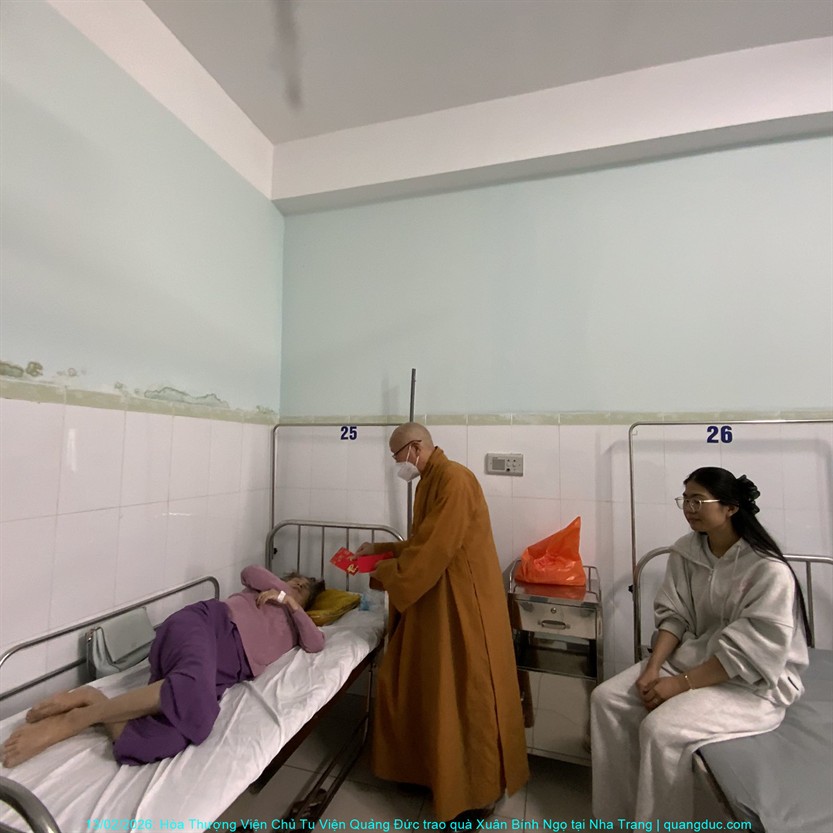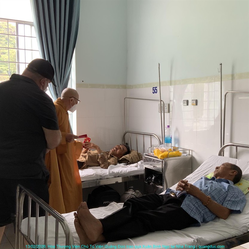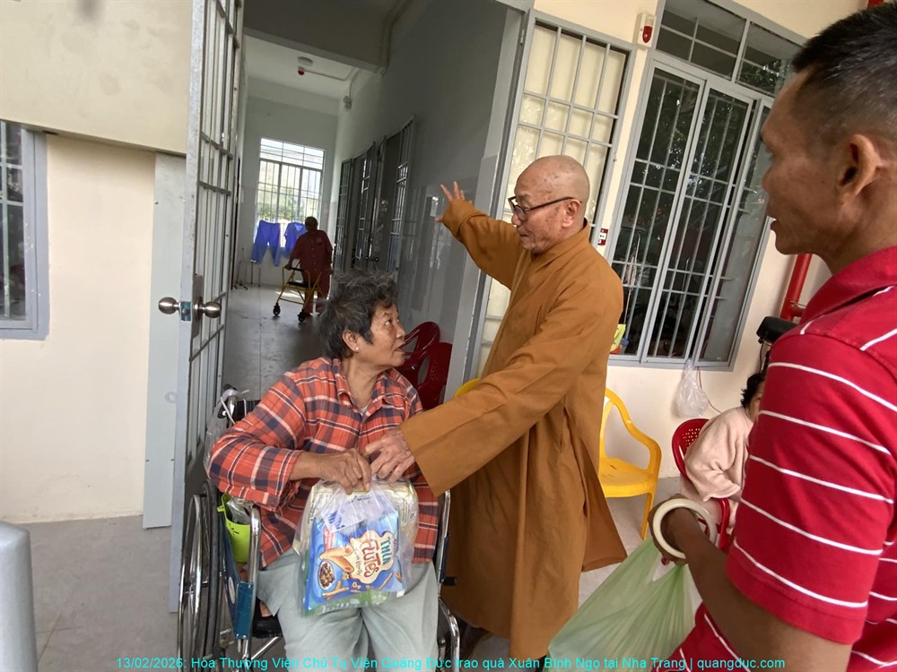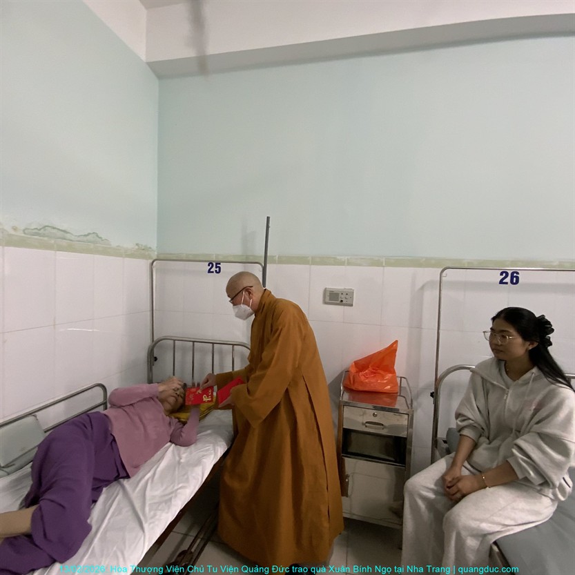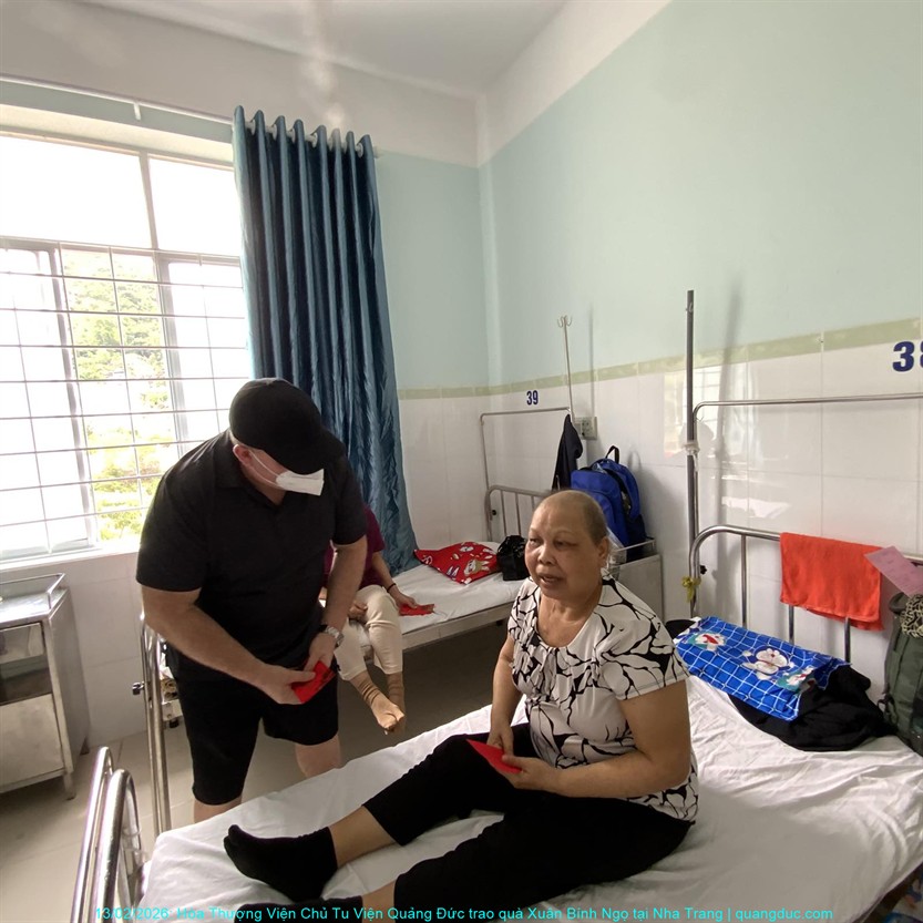 Hôm nay, ngày 26 tháng Tết (13/2/2026), Hòa Thượng Viện Chủ Tu Viện Quảng Đức, Hòa Thượng Thích Thông Mẫn, đã thân lâm Bệnh viện Ung Bướu tỉnh Khánh Hòa để thăm hỏi và trao tặng 100 phần quà Xuân đến các bệnh nhân cùng thân nhân đang ngày đêm túc trực chăm sóc. Mỗi phần quà tuy đơn sơ gồm bánh và 200.000 đồng tiền mặt, nhưng chất chứa trong đó là tấm lòng sẻ chia và lời chúc an lành đầu năm mới. Giữa những ngày giáp Tết, khi nỗi lo bệnh tật còn nặng trĩu, sự hiện diện ân cần của Hòa Thượng cùng những món quà nghĩa tình đã phần nào sưởi ấm lòng người, mang đến niềm động viên và hy vọng.
