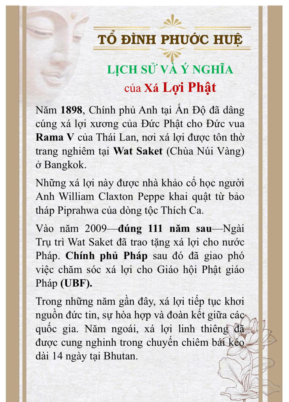 Kính mong quý vị hoan hỷ loan tải thông báo này, để người con Phật và quý vị hữu duyên có cơ hội đến chiêm bái Xá Lợi Đức Phật, gieo duyên lành, tăng trưởng tín tâm và tạo phước báu.