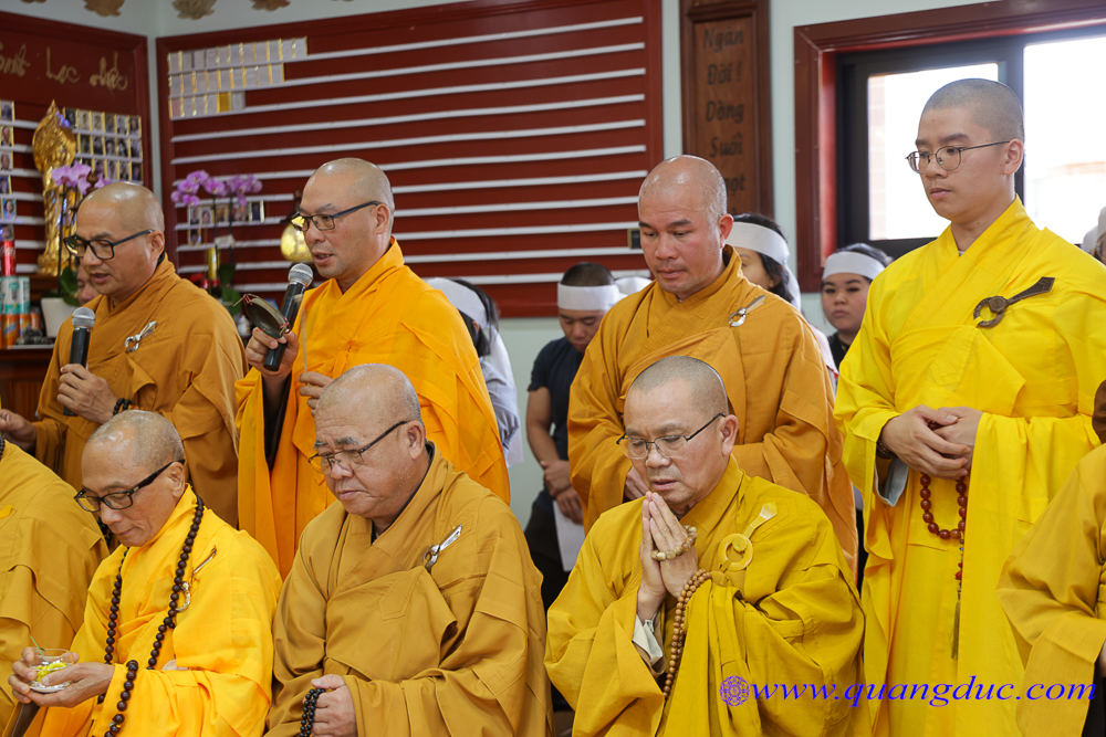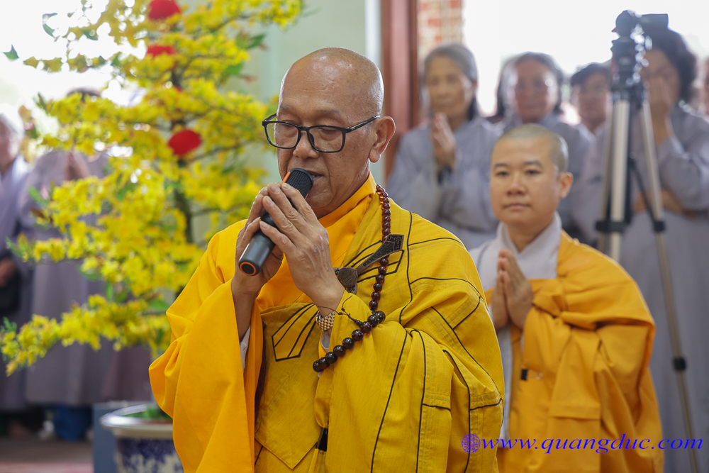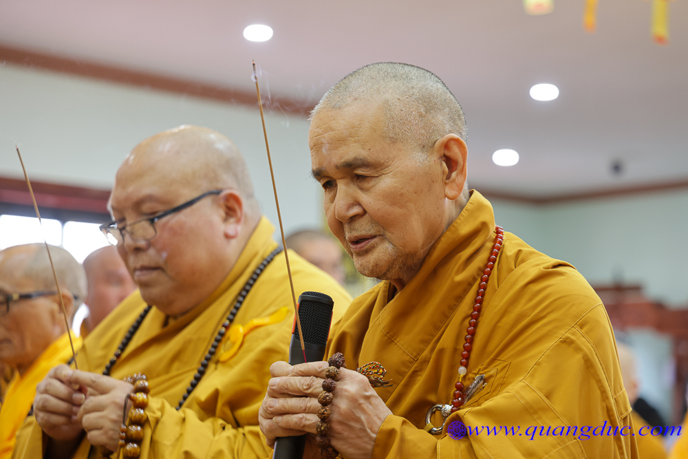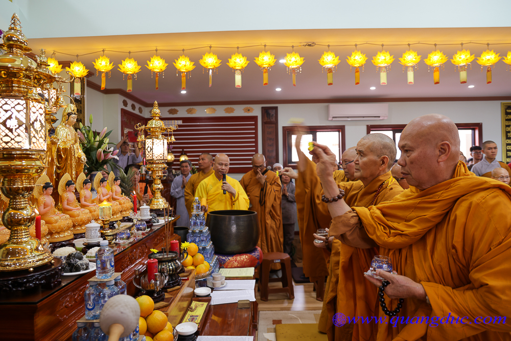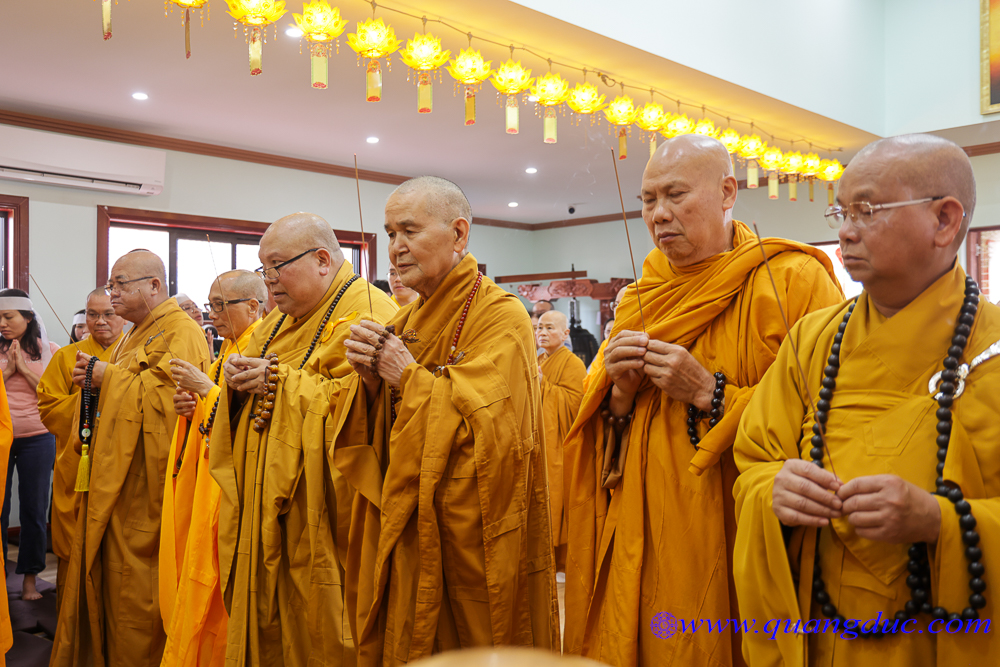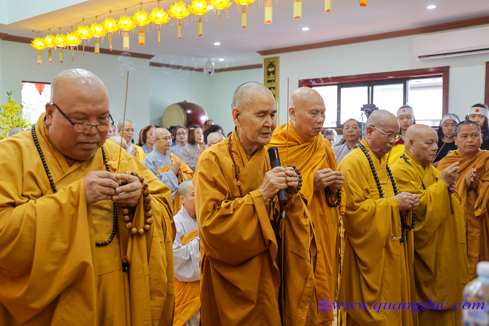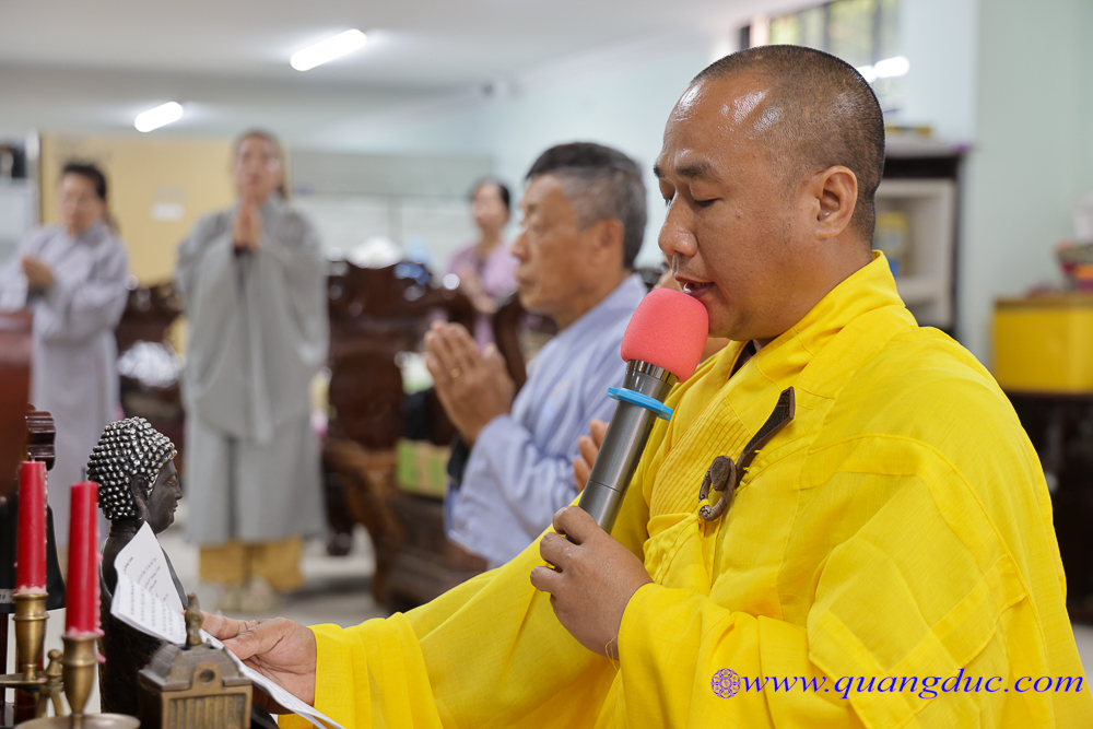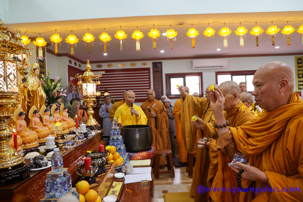 Tiếp đó, chư Tôn Hòa Thượng chứng minh đã trang nghiêm niệm hương bạch Phật an vị, cử hành nghi thức sái tịnh, thanh tịnh đạo tràng. Thượng Tọa Trụ Trì, đồng thời đảm nhiệm Sám Chủ, thành kính thỉnh Tam Bảo Từ Tôn an vị, dẫn đại chúng tụng bài Sám Nguyện Phật Thành Đạo (do Đức Lão Hòa Thượng Thích Huyền Quang biên soạn), tiếp đến là cúng Ngọ Phật và cúng tiến chư Hương Linh, trong không khí trang nghiêm, nhất tâm và thấm đượm đạo tình.