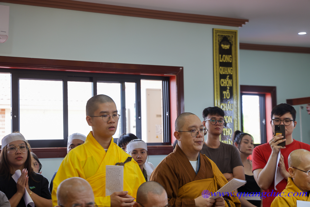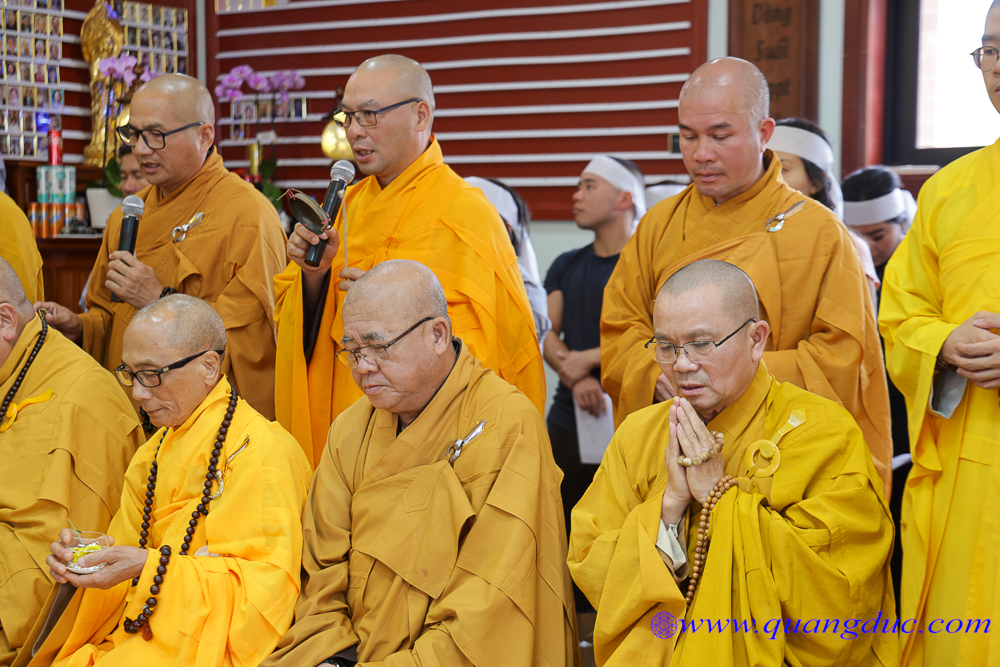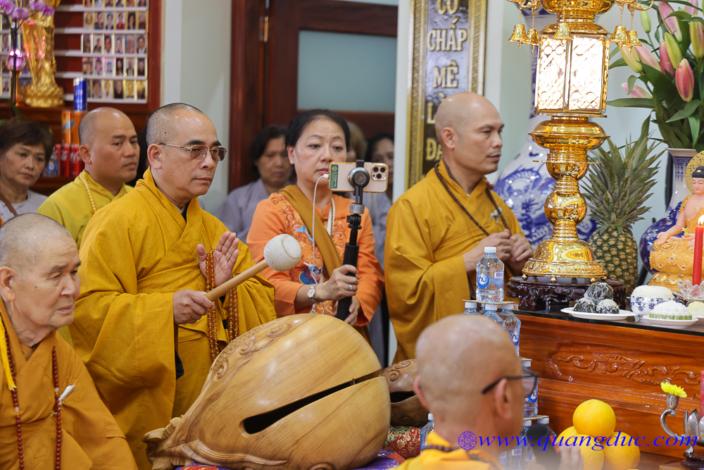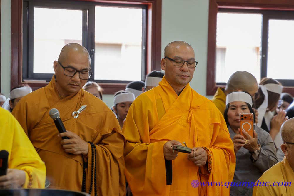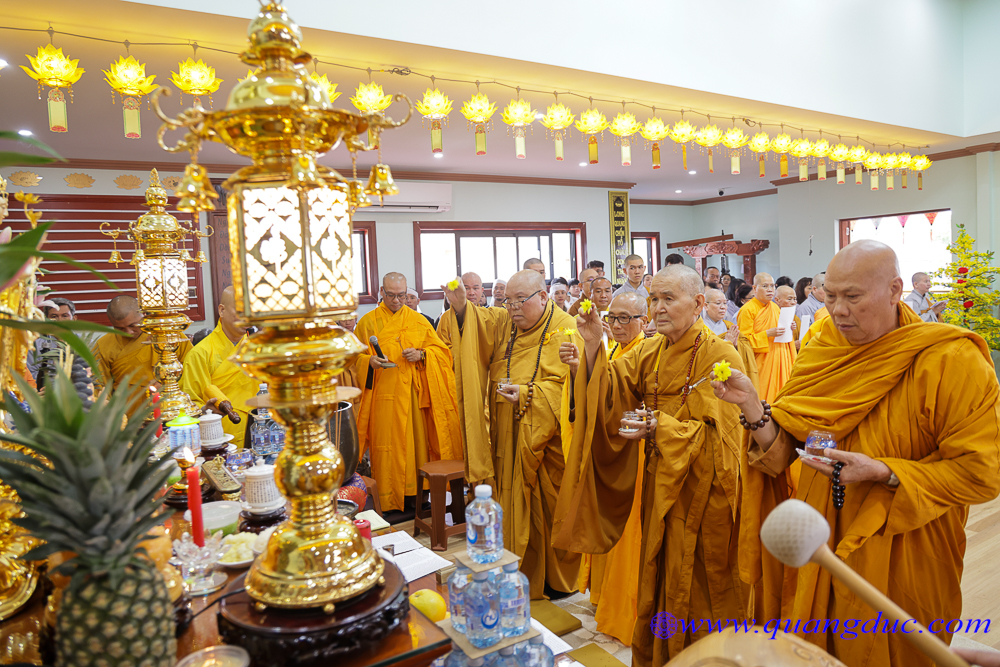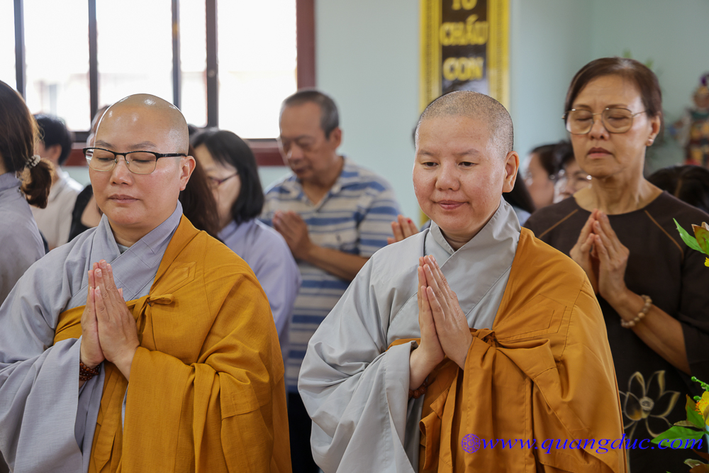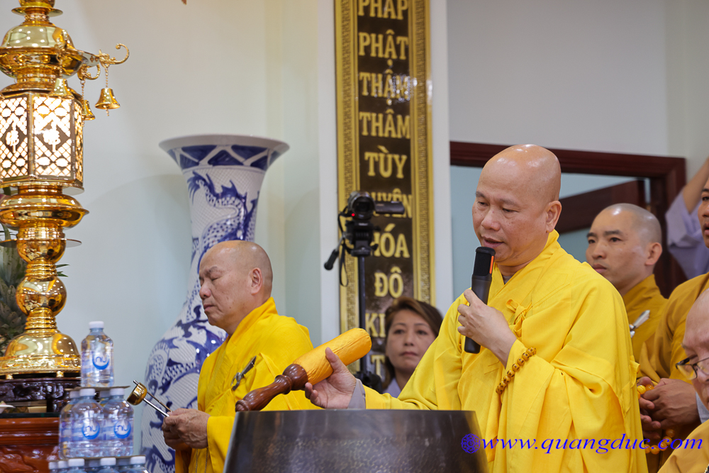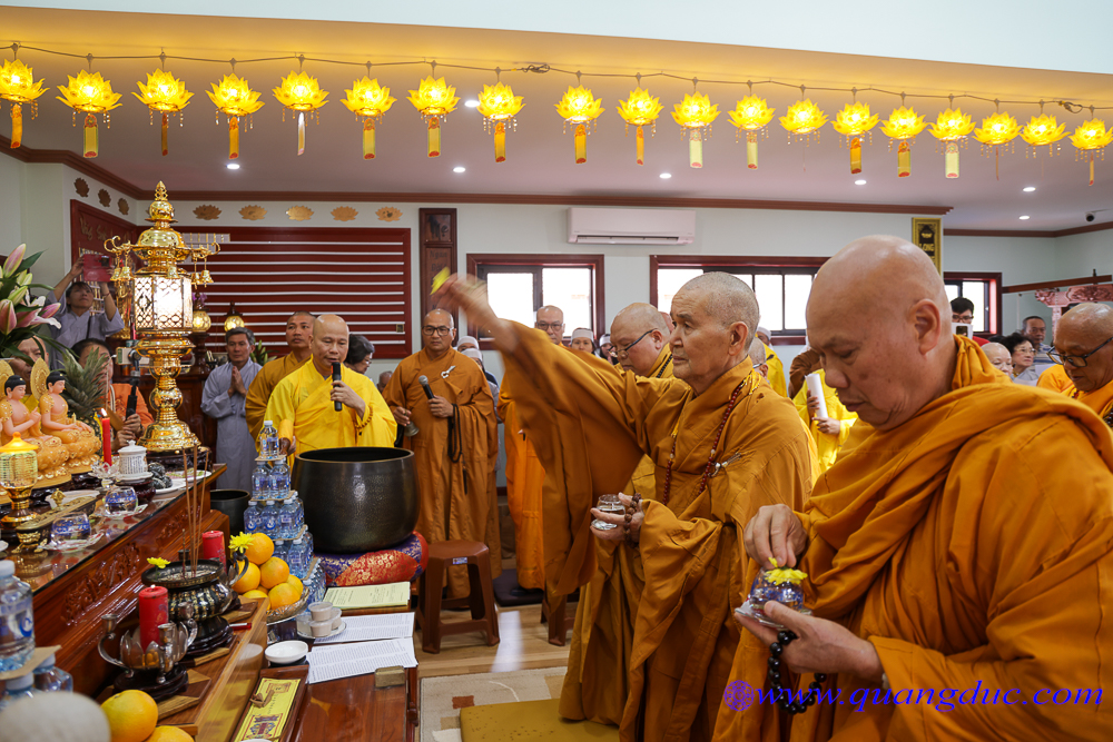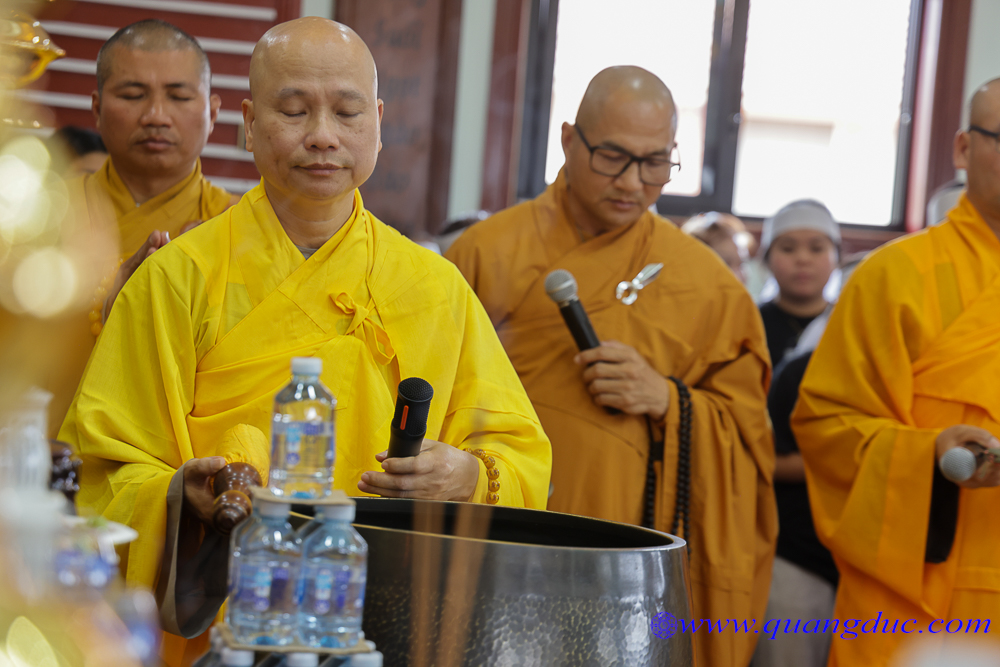 Tiếp đó, chư Tôn Hòa Thượng chứng minh đã trang nghiêm niệm hương bạch Phật an vị, cử hành nghi thức sái tịnh, thanh tịnh đạo tràng. Thượng Tọa Trụ Trì, đồng thời đảm nhiệm Sám Chủ, thành kính thỉnh Tam Bảo Từ Tôn an vị, dẫn đại chúng tụng bài Sám Nguyện Phật Thành Đạo (do Đức Lão Hòa Thượng Thích Huyền Quang biên soạn), tiếp đến là cúng Ngọ Phật và cúng tiến chư Hương Linh, trong không khí trang nghiêm, nhất tâm và thấm đượm đạo tình.