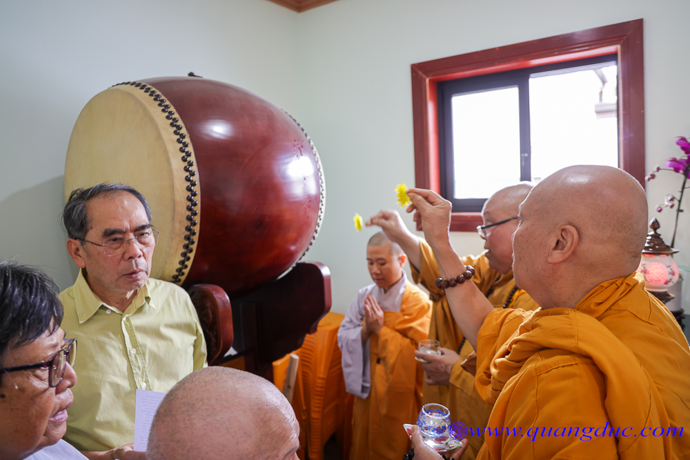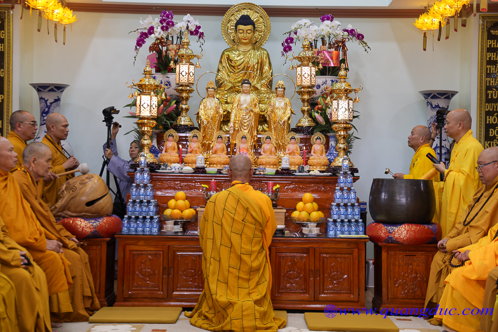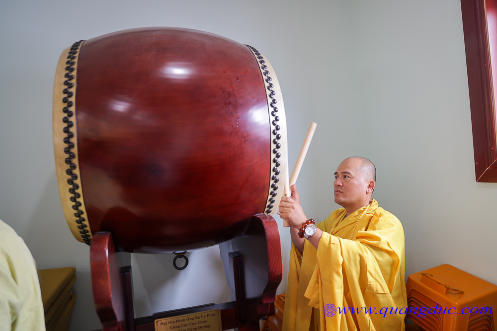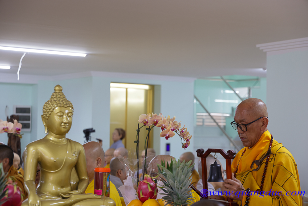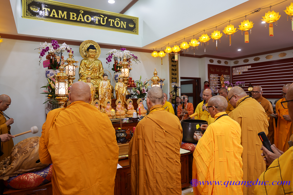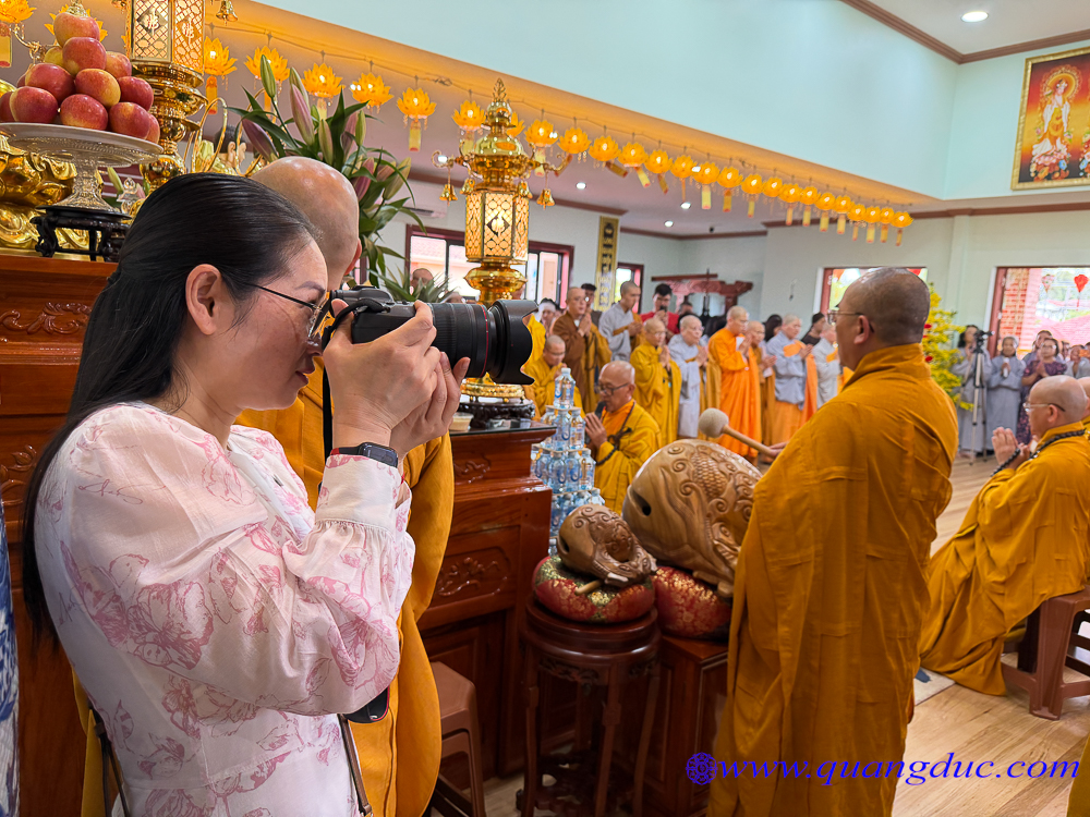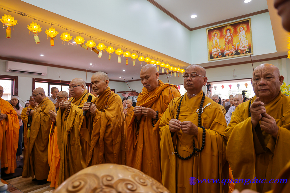 Đại Đức  Quảng Trung và Sư Cô Tịnh Hiển là bào đệ và bào muội của Thượng Tọa Trụ Trì Thích Phổ Hương đã trang nghiêm tác bạch cung an Chức Sự Lễ An Vị Phật và cung nghinh chư Tôn Thiền Đức quang lâm Chánh điện. Thanh âm trầm hùng của những hồi chuông trống Bát Nhã hòa quyện làn khói hương trầm  lan tỏa, cùng sự lắng động nhất tâm cầu nguyện của tứ chúng đã tạo nên một bầu không khí linh thiêng.