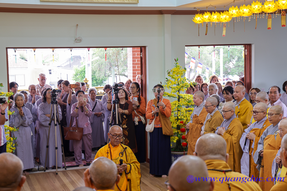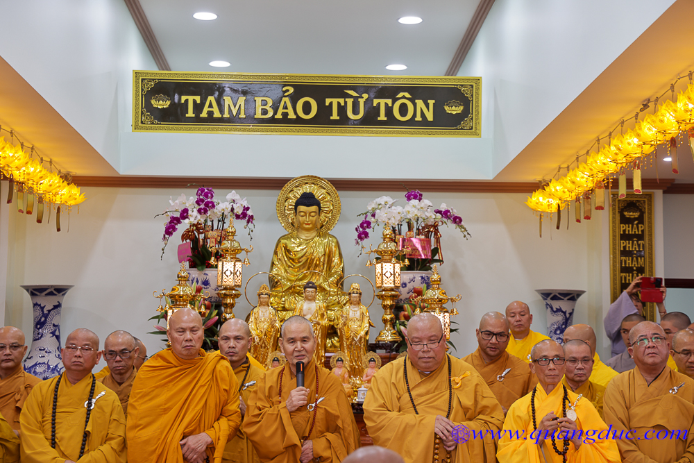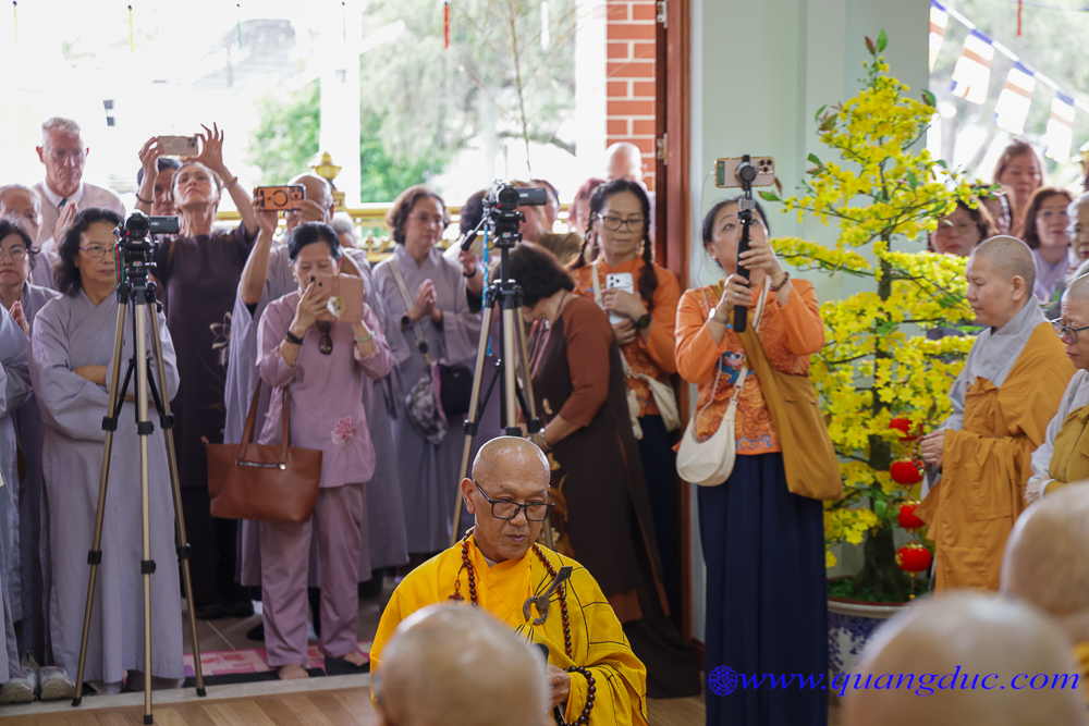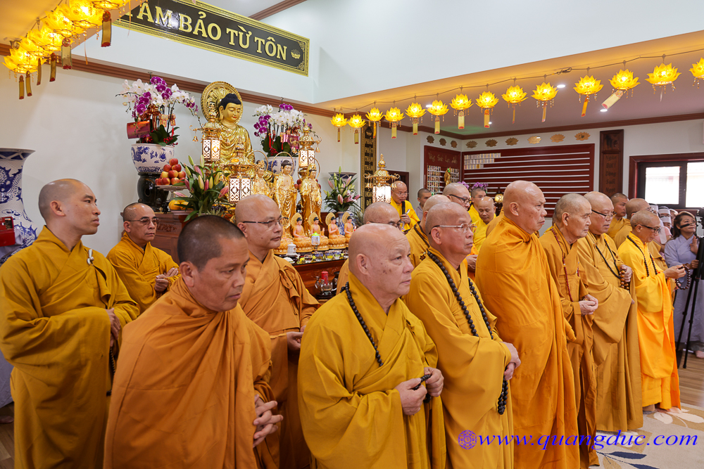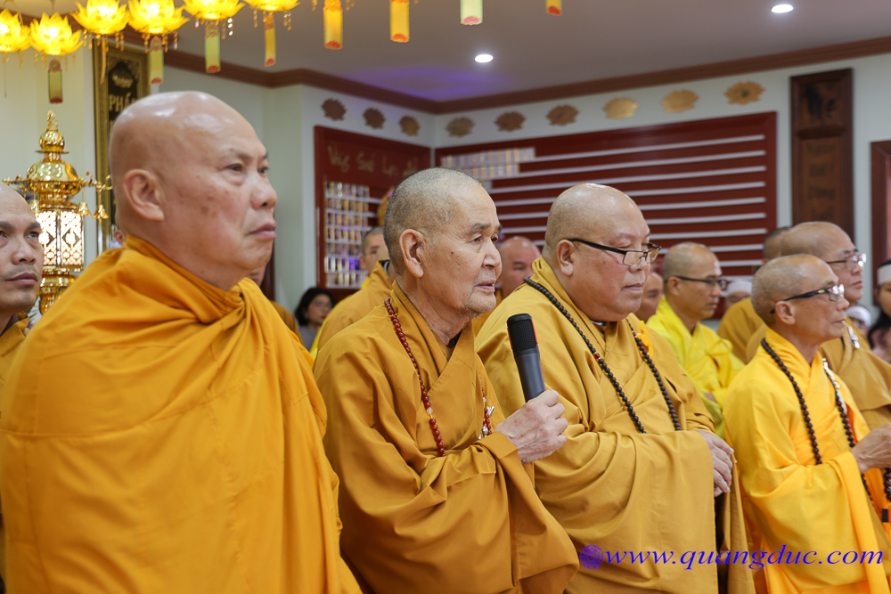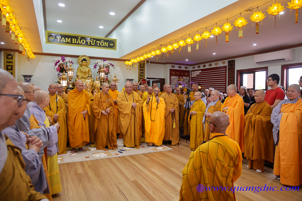 Tiếp đó, Đức Trưởng Lão Hòa Thượng Thích Bảo Lạc đã từ hòa ban lời đạo từ tán dương và sách tấn đầy đạo tình. Ngài tán thán công đức của Thượng Tọa Trụ Trì đã chọn ngày Vía Phật Thành Đạo để cử hành Lễ An Vị, một sự chọn lựa hội đủ thiên thời, địa lợi và nhân hòa, lấy ngày Giác Ngộ của Đức Thế Tôn làm nền tảng cho sự an trú lâu dài của đạo tràng. Ngài cũng nhấn mạnh rằng, xây dựng cơ sở chỉ mới là bước khởi đầu; điều quan trọng và bền vững hơn chính là xây dựng con người, nuôi dưỡng Tăng tài, tiếp Tăng độ chúng, để đạo mạch được tiếp nối lâu dài nơi xứ người.