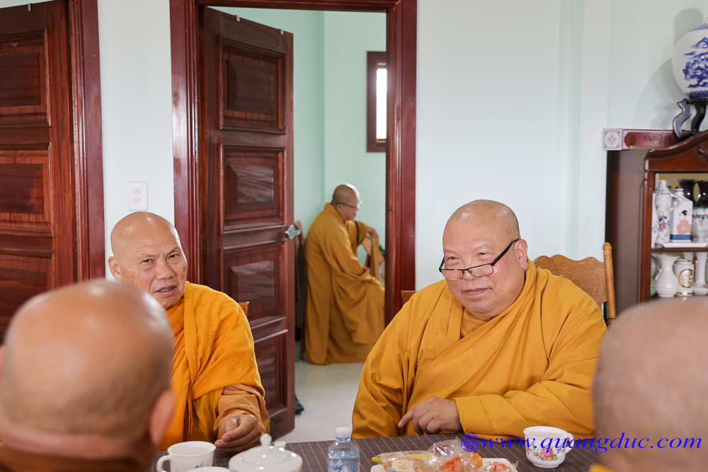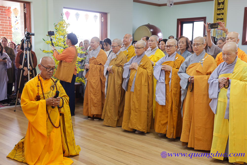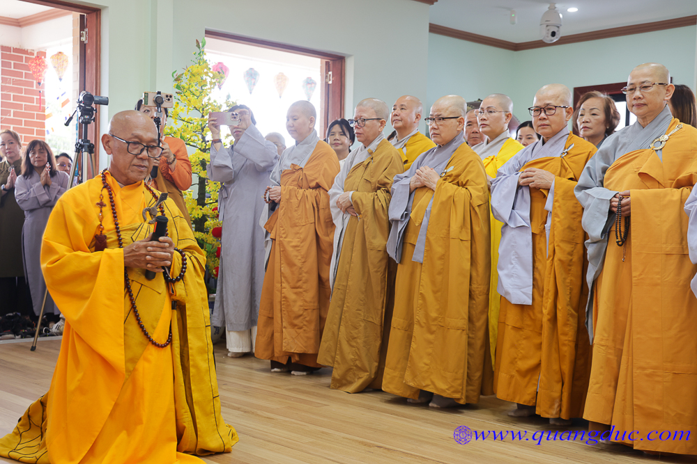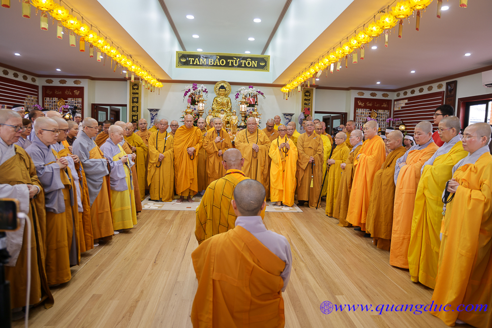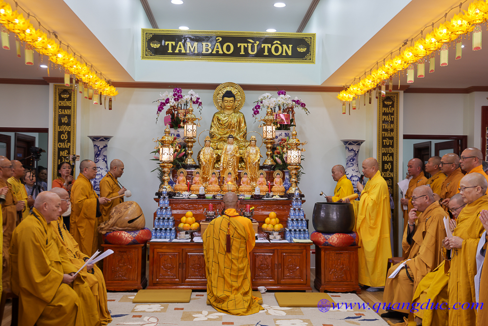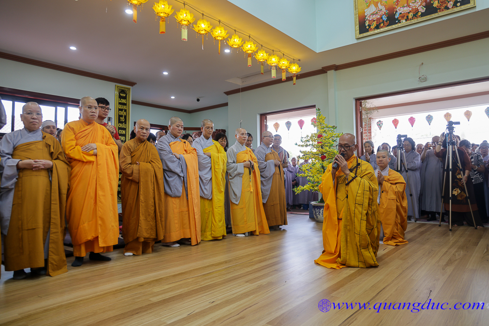Tiếp đó, Đức Trưởng Lão Hòa Thượng Thích Bảo Lạc đã từ hòa ban lời đạo từ tán dương và sách tấn đầy đạo tình. Ngài tán thán công đức của Thượng Tọa Trụ Trì đã chọn ngày Vía Phật Thành Đạo để cử hành Lễ An Vị, một sự chọn lựa hội đủ thiên thời, địa lợi và nhân hòa, lấy ngày Giác Ngộ của Đức Thế Tôn làm nền tảng cho sự an trú lâu dài của đạo tràng. Ngài cũng nhấn mạnh rằng, xây dựng cơ sở chỉ mới là bước khởi đầu; điều quan trọng và bền vững hơn chính là xây dựng con người, nuôi dưỡng Tăng tài, tiếp Tăng độ chúng, để đạo mạch được tiếp nối lâu dài nơi xứ người.