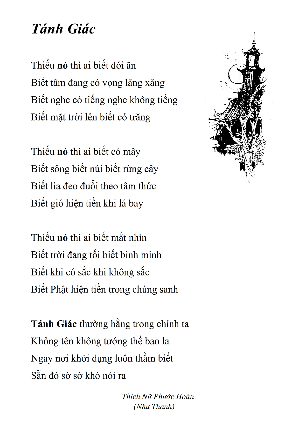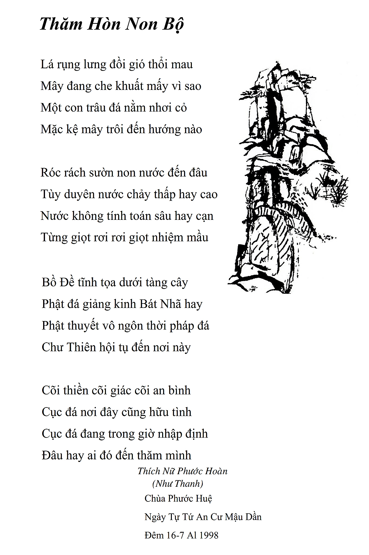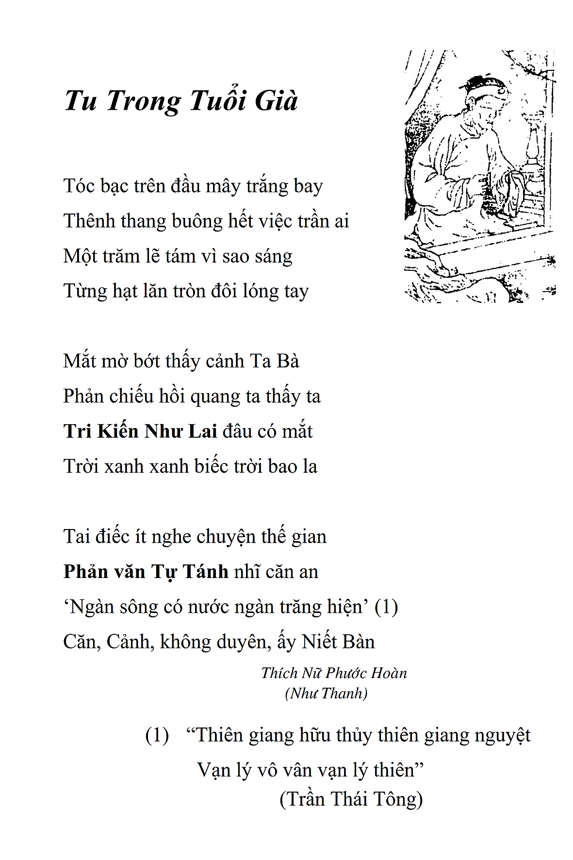 Tôi có thói quen, sau khi tụng kinh buổi sáng xong, thường ngồi uống một ly trà trước khi dùng điểm tâm. Vừa uống trà, tôi vừa lướt qua trang Thắng Hoan Thi Tập và tình cờ đọc được bài thơ Thiền Trà của Hòa thượng. Tôi cảm thấy thú vị và bỗng dưng nhớ Hòa thượng. Tôi nhớ không phải vì sự bịn rịn của thế gian, mà nhớ cái đức, cái tài và cái tính hào sảng của Ngài.