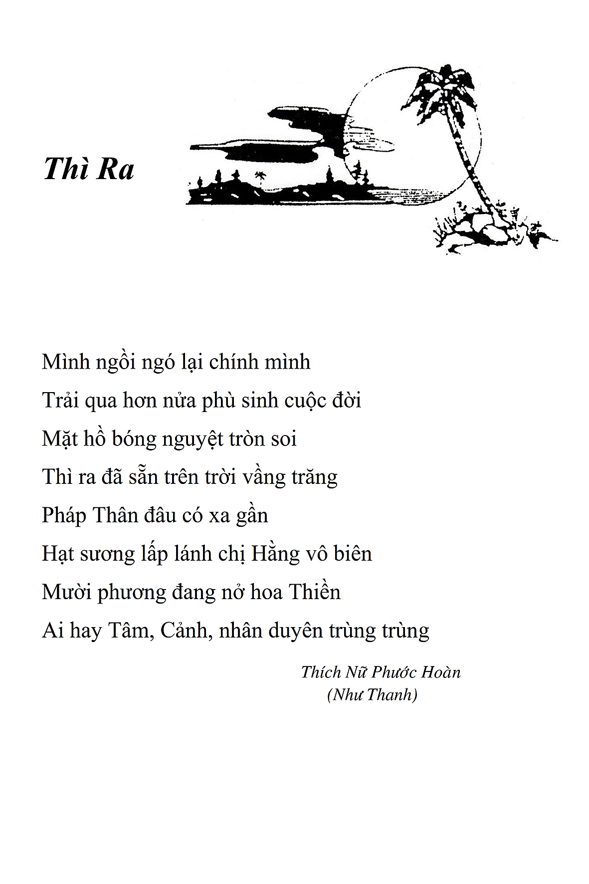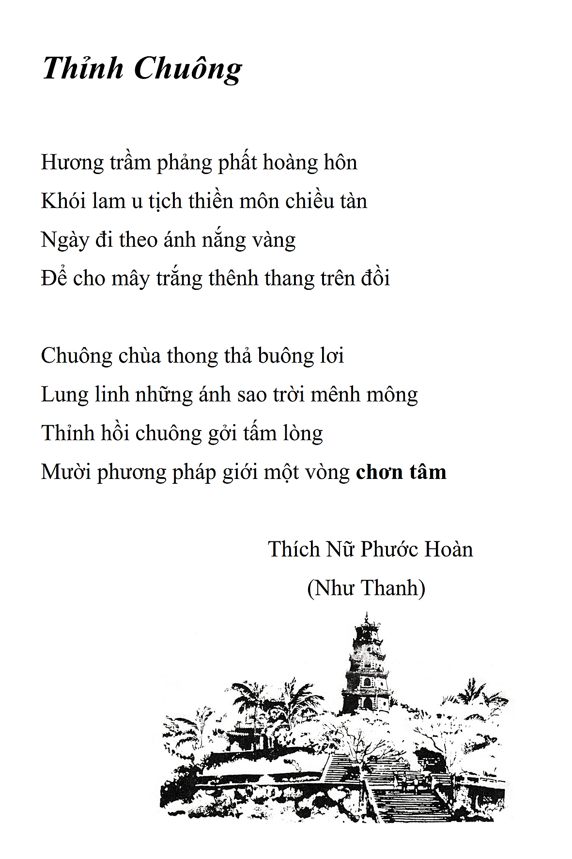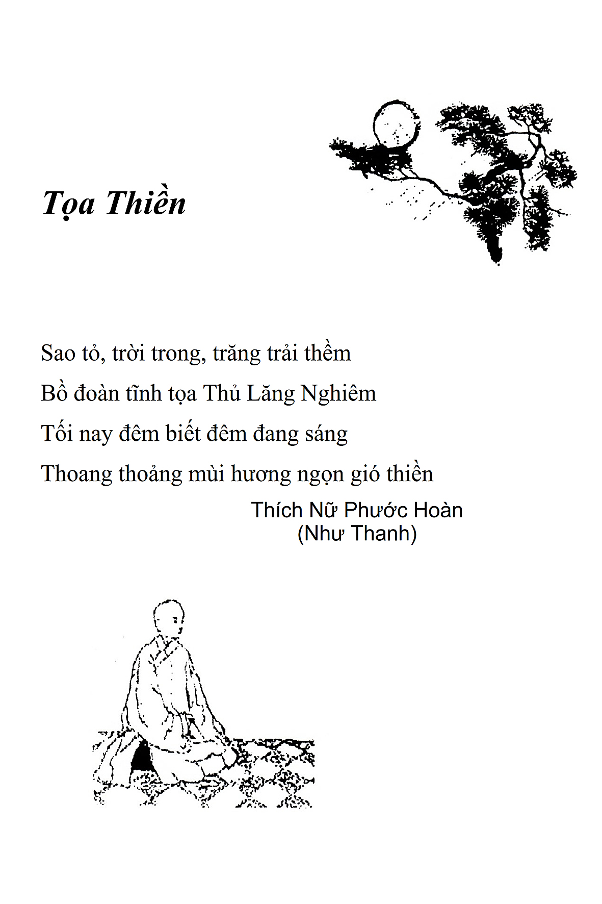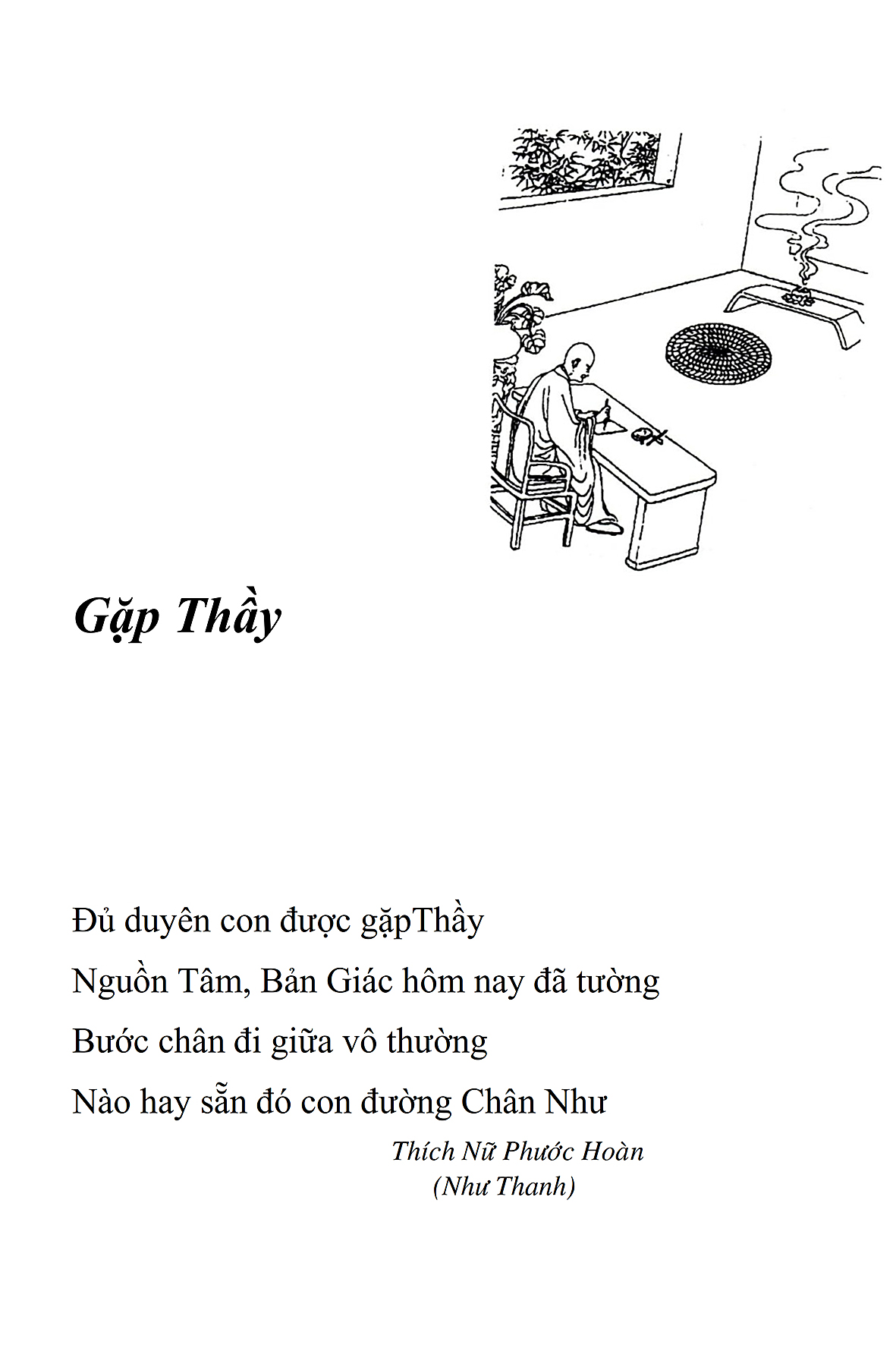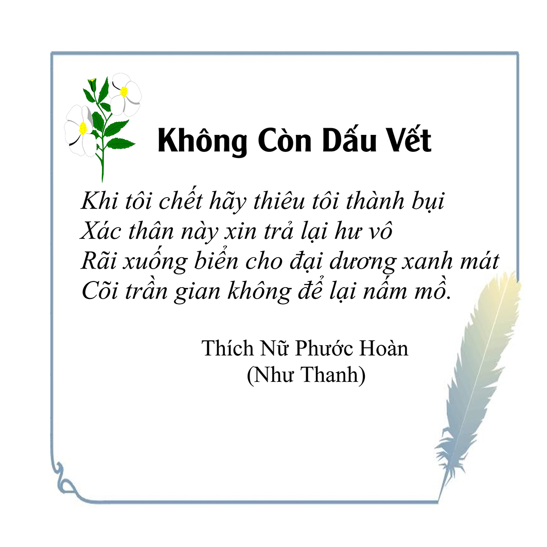 Là một nữ tu sĩ chân yếu tay mềm, Phật sự đa đoan, lòng tôi vẫn cảm thấy tràn đầy nguồn an ủi vô biên trong những lúc mệt nhọc. Những ngày gần đây, các bài thơ trong tập thơ Hoa Thiền, mang tâm ý Phật Pháp, được Cô Đặng Lan và các thi sĩ ngâm vịnh, được Phật tử Tâm Nghiêm đọc vào đĩa, được Nhạc sĩ Nguyễn Nhật Tân phổ nhạc… với những niềm khích lệ đó, khiến tôi cố gắng sáng tác thêm những vần thơ mới. Và hôm nay, tập thơ Hoa Thiền tái bản, mang vóc dáng trang trọng, gói trọn một nội dung hồn thơ và ý nhạc, khiến cho lời thơ nhẹ nhàng bay vút khắp nơi và tuôn chảy vào tận cõi lòng người. Tôi xin chân thành cảm nhận tất cả và trân trọng khắc ghi vào lòng một kỷ niệm đẹp trong suốt hành trình dấn thân vì Đạo.