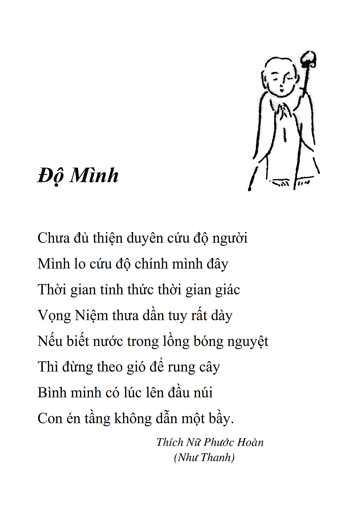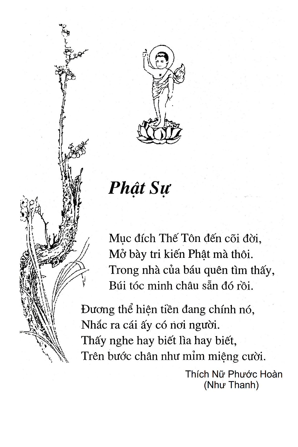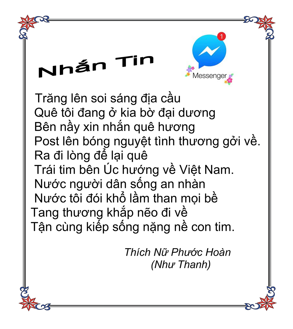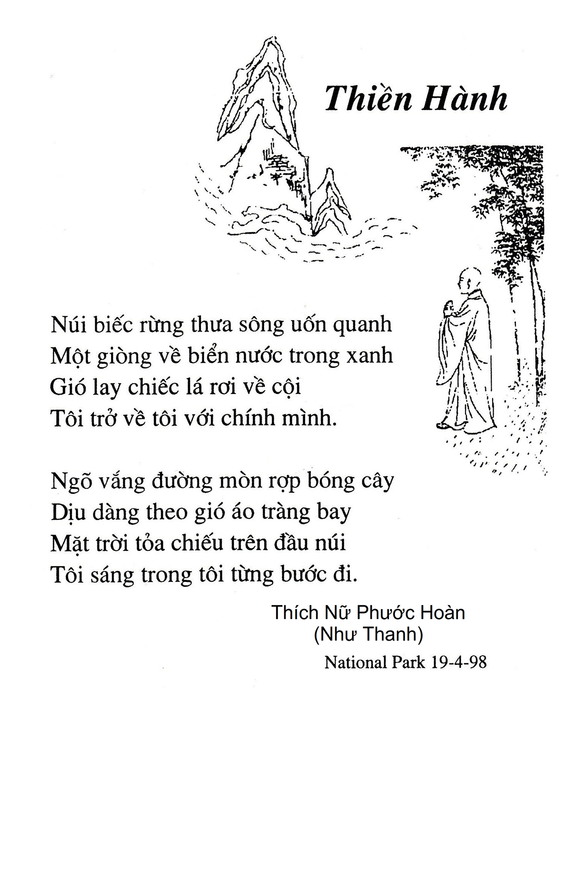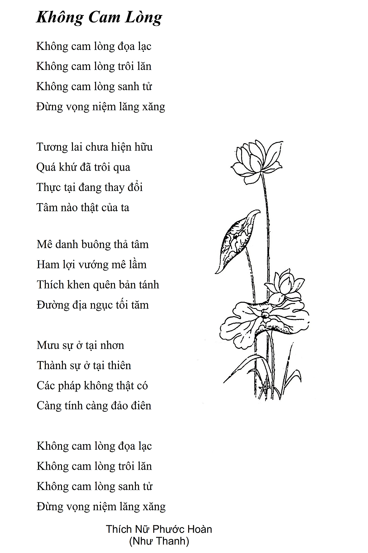 Là một nữ tu sĩ chân yếu tay mềm, Phật sự đa đoan, lòng tôi vẫn cảm thấy tràn đầy nguồn an ủi vô biên trong những lúc mệt nhọc. Những ngày gần đây, các bài thơ trong tập thơ Hoa Thiền, mang tâm ý Phật Pháp, được Cô Đặng Lan và các thi sĩ ngâm vịnh, được Phật tử Tâm Nghiêm đọc vào đĩa, được Nhạc sĩ Nguyễn Nhật Tân phổ nhạc… với những niềm khích lệ đó, khiến tôi cố gắng sáng tác thêm những vần thơ mới. Và hôm nay, tập thơ Hoa Thiền tái bản, mang vóc dáng trang trọng, gói trọn một nội dung hồn thơ và ý nhạc, khiến cho lời thơ nhẹ nhàng bay vút khắp nơi và tuôn chảy vào tận cõi lòng người. Tôi xin chân thành cảm nhận tất cả và trân trọng khắc ghi vào lòng một kỷ niệm đẹp trong suốt hành trình dấn thân vì Đạo.