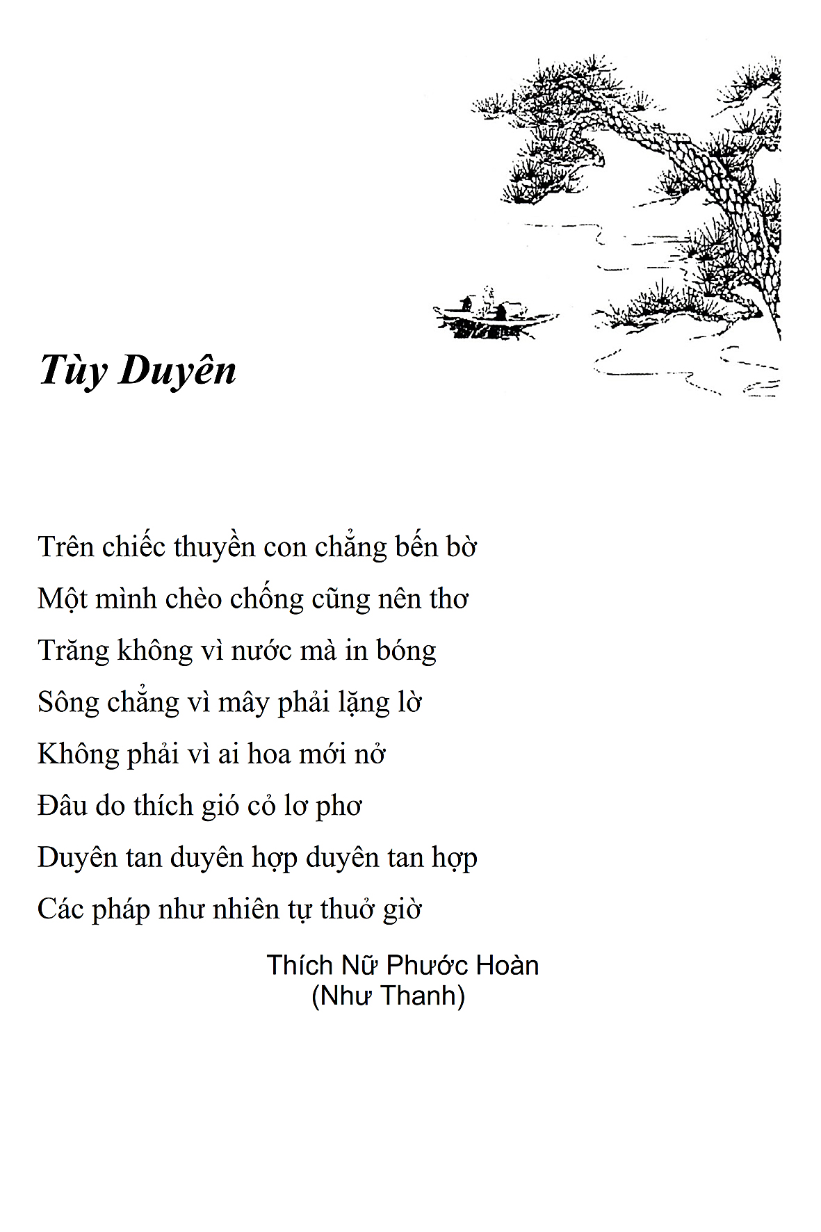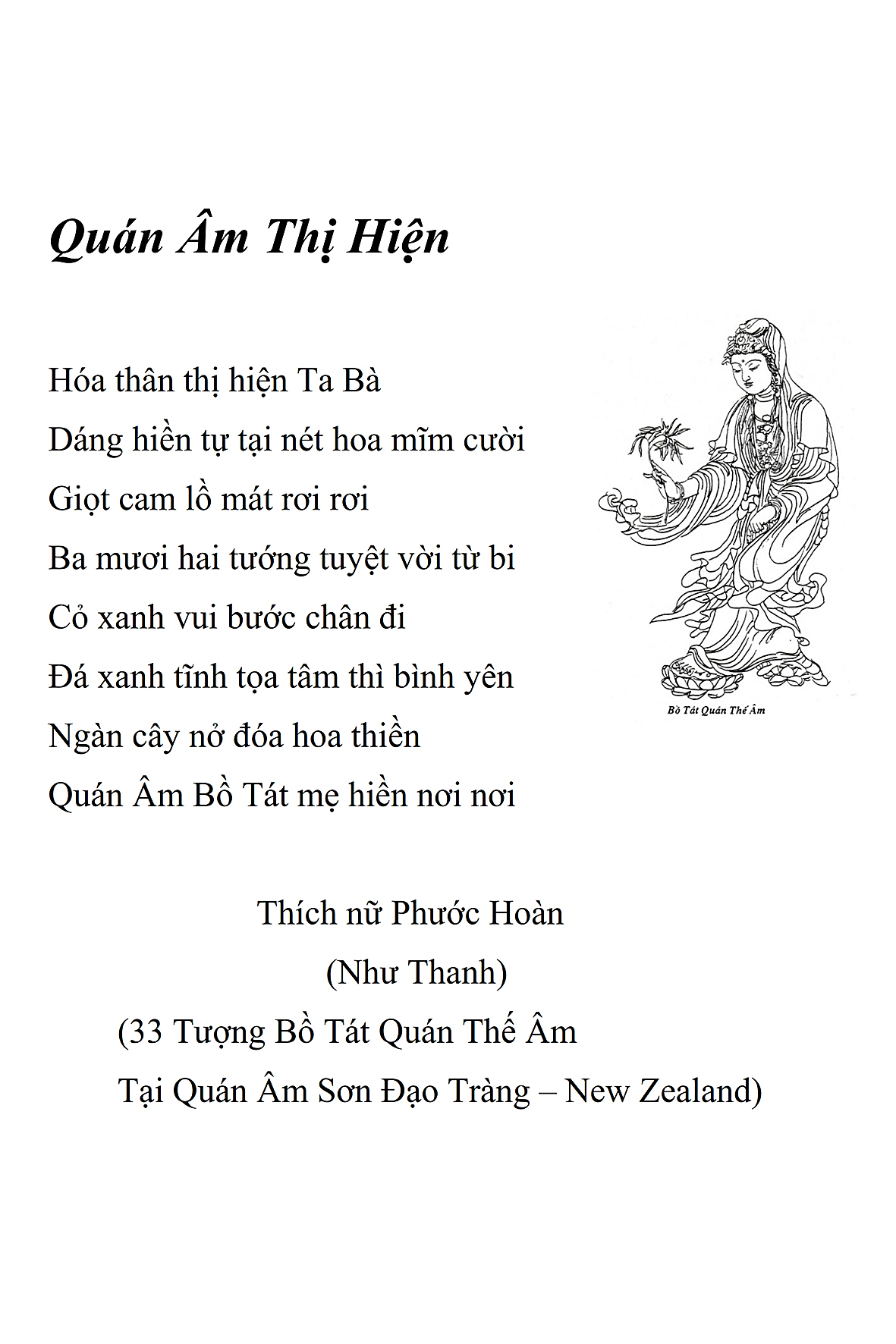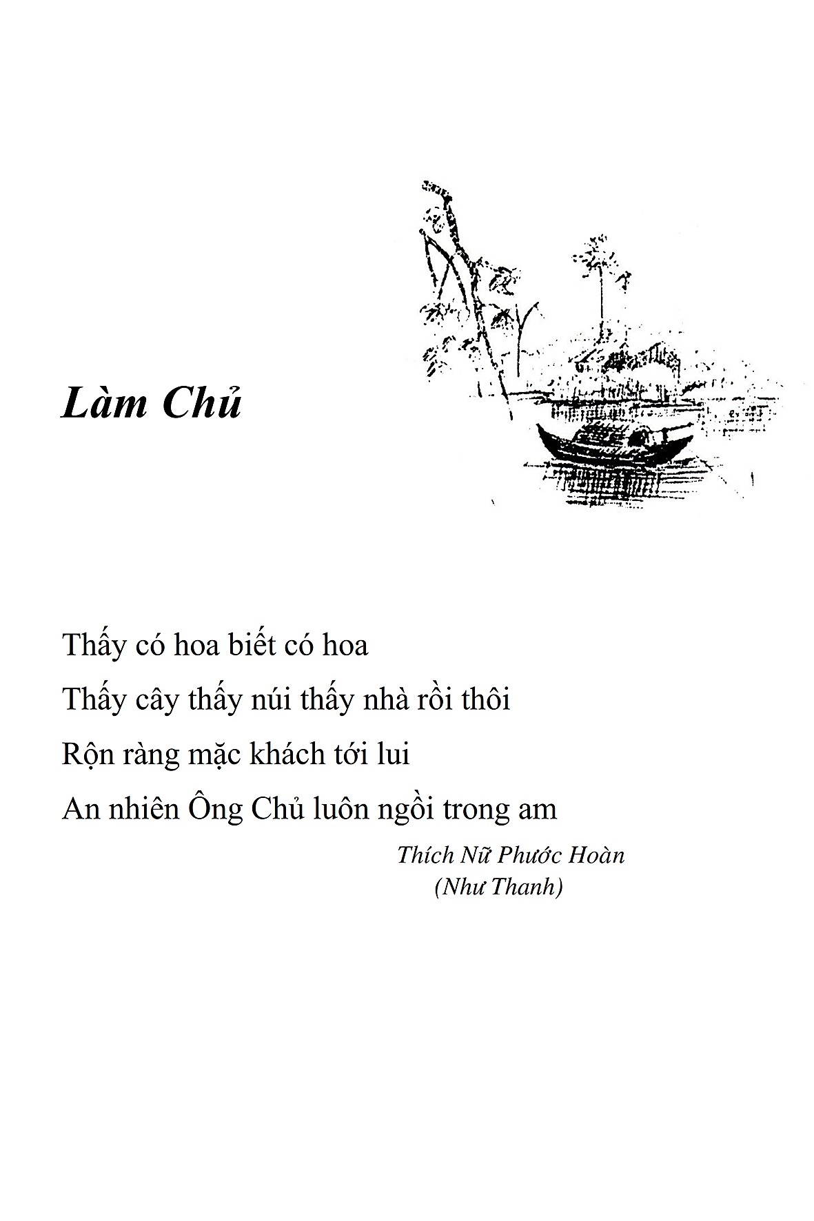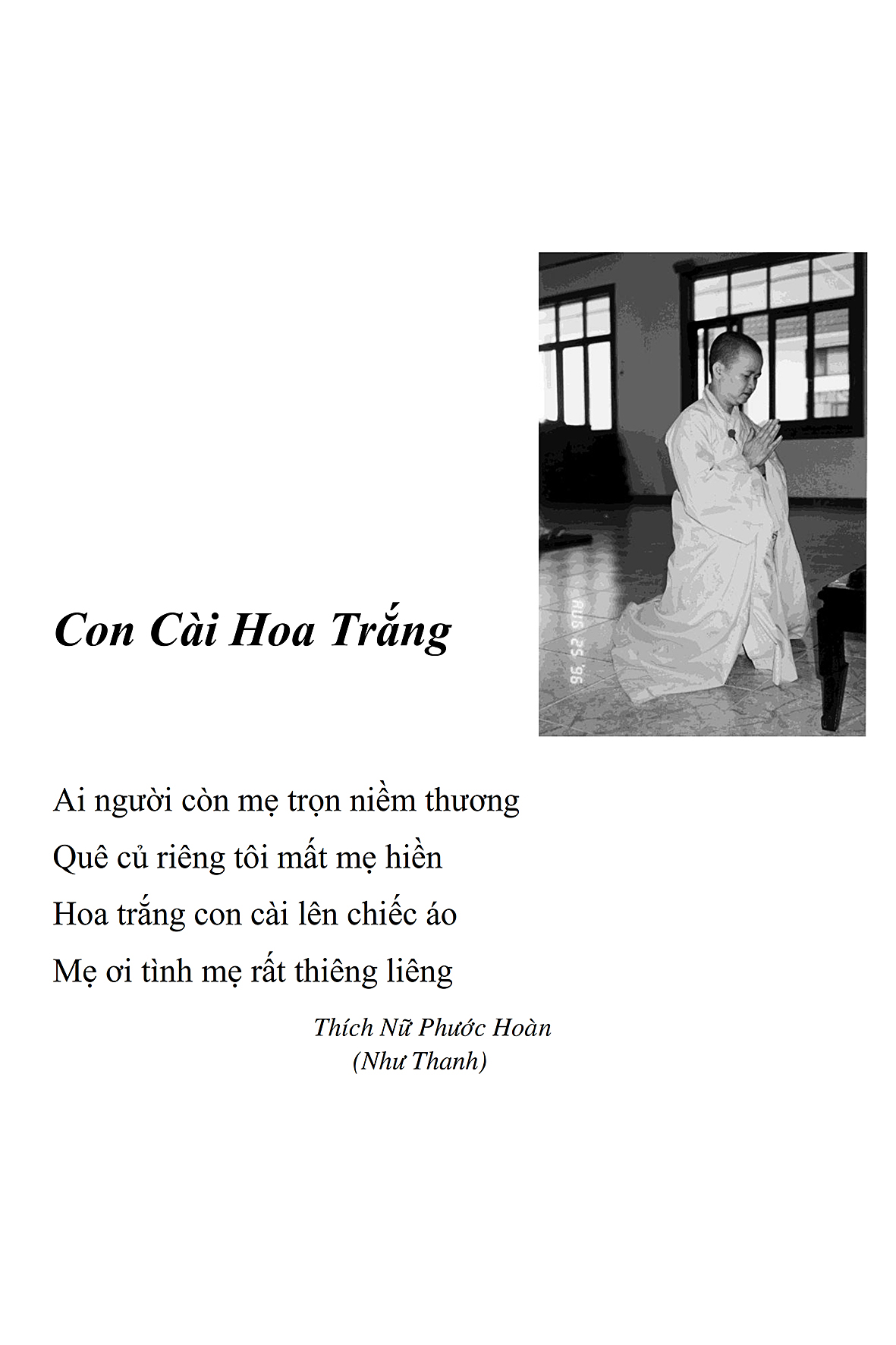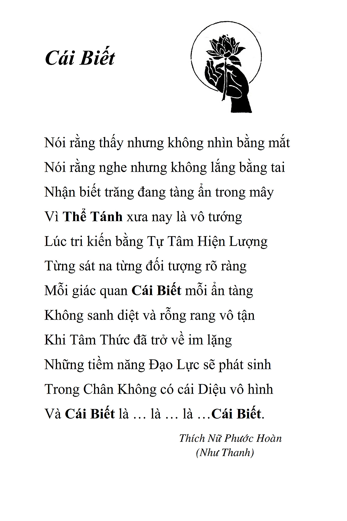 Là một nữ tu sĩ chân yếu tay mềm, Phật sự đa đoan, lòng tôi vẫn cảm thấy tràn đầy nguồn an ủi vô biên trong những lúc mệt nhọc. Những ngày gần đây, các bài thơ trong tập thơ Hoa Thiền, mang tâm ý Phật Pháp, được Cô Đặng Lan và các thi sĩ ngâm vịnh, được Phật tử Tâm Nghiêm đọc vào đĩa, được Nhạc sĩ Nguyễn Nhật Tân phổ nhạc… với những niềm khích lệ đó, khiến tôi cố gắng sáng tác thêm những vần thơ mới. Và hôm nay, tập thơ Hoa Thiền tái bản, mang vóc dáng trang trọng, gói trọn một nội dung hồn thơ và ý nhạc, khiến cho lời thơ nhẹ nhàng bay vút khắp nơi và tuôn chảy vào tận cõi lòng người. Tôi xin chân thành cảm nhận tất cả và trân trọng khắc ghi vào lòng một kỷ niệm đẹp trong suốt hành trình dấn thân vì Đạo.