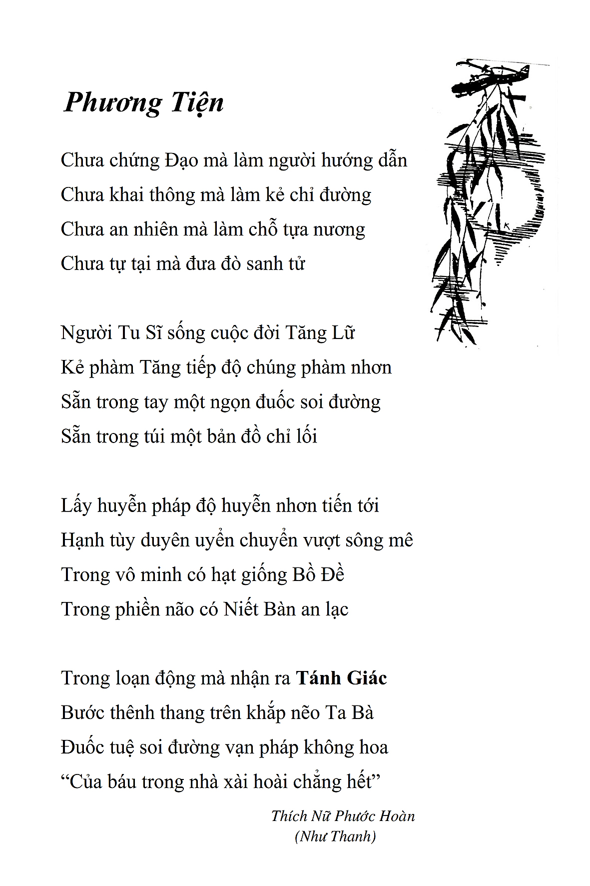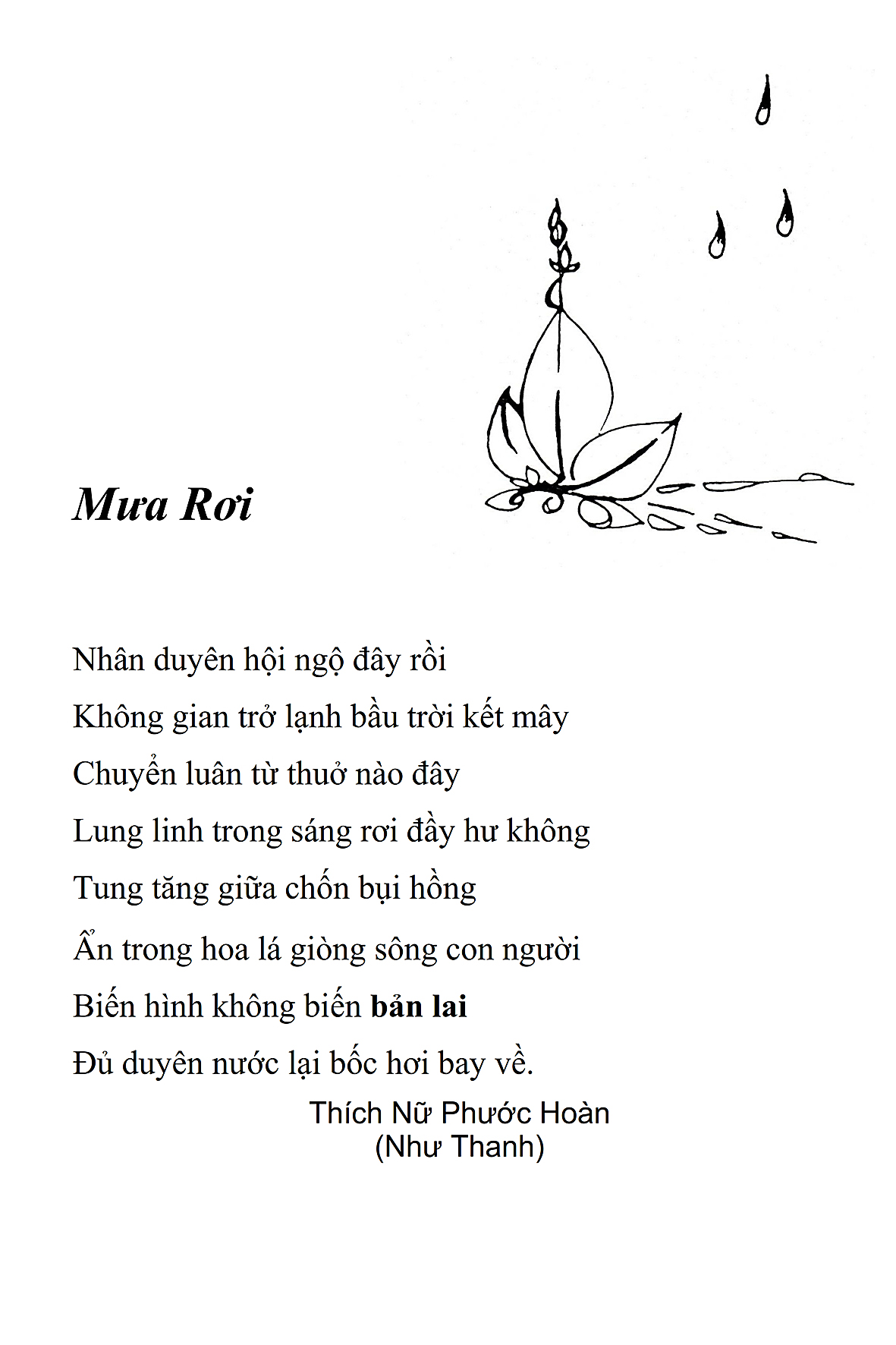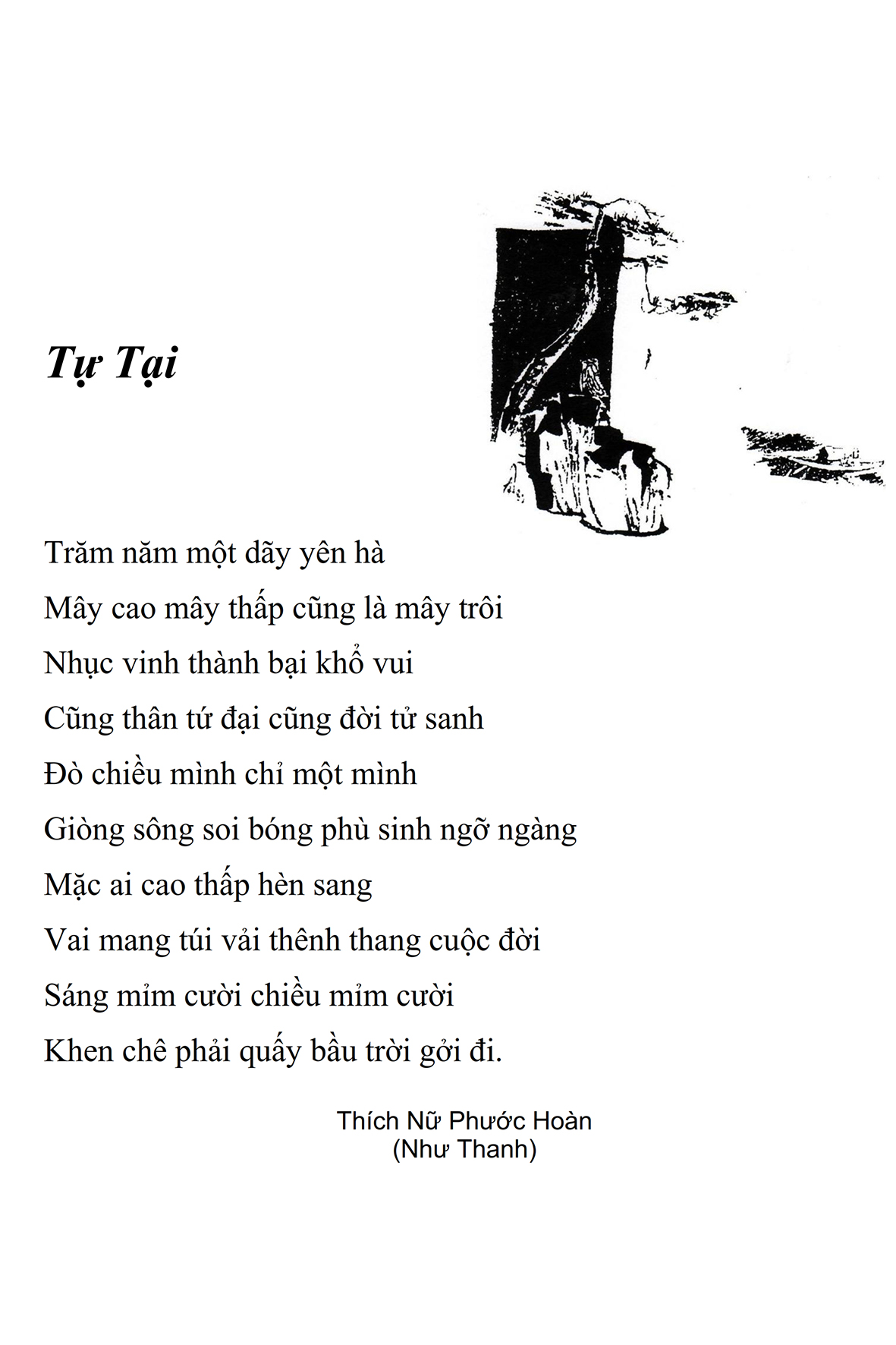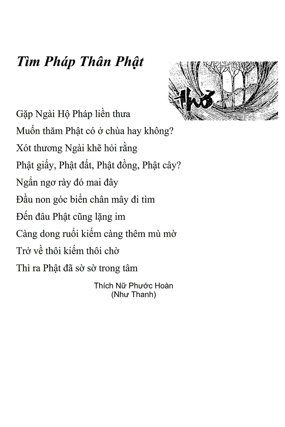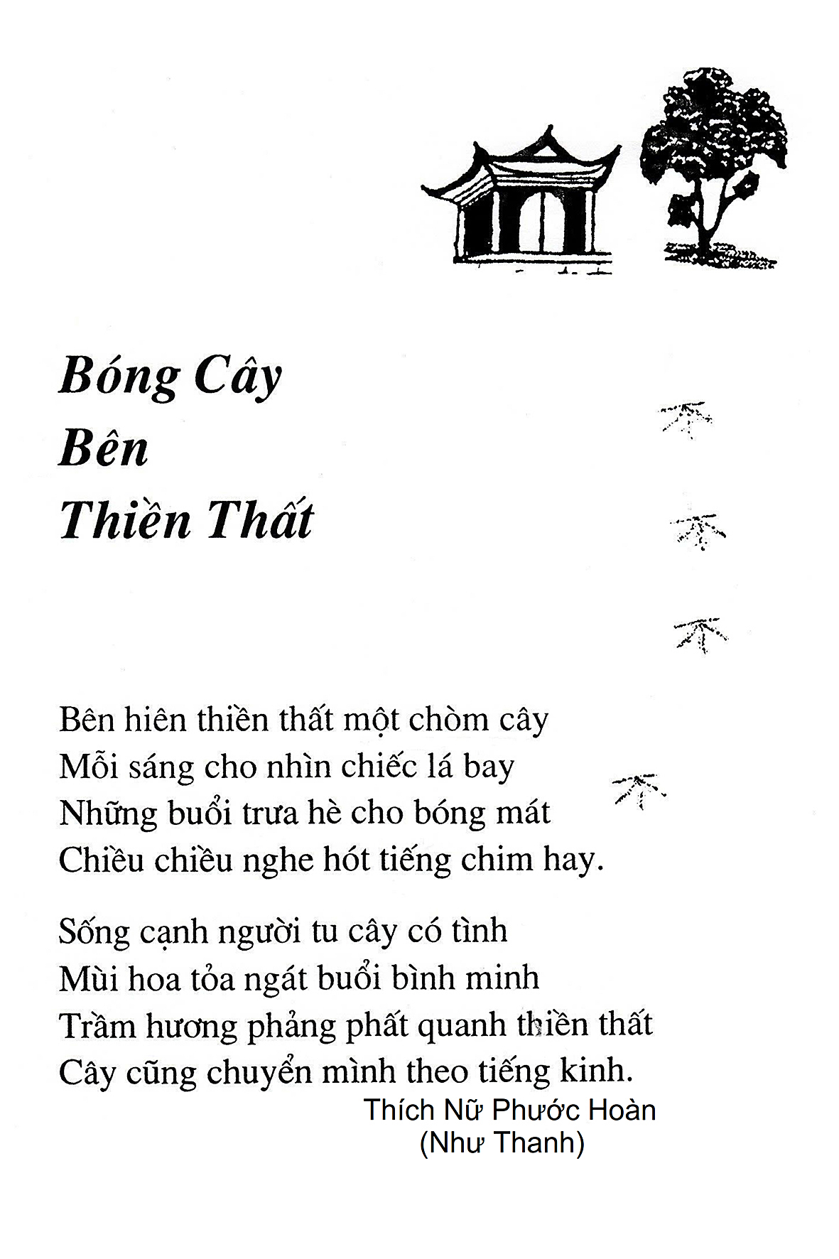 Là một nữ tu sĩ chân yếu tay mềm, Phật sự đa đoan, lòng tôi vẫn cảm thấy tràn đầy nguồn an ủi vô biên trong những lúc mệt nhọc. Những ngày gần đây, các bài thơ trong tập thơ Hoa Thiền, mang tâm ý Phật Pháp, được Cô Đặng Lan và các thi sĩ ngâm vịnh, được Phật tử Tâm Nghiêm đọc vào đĩa, được Nhạc sĩ Nguyễn Nhật Tân phổ nhạc… với những niềm khích lệ đó, khiến tôi cố gắng sáng tác thêm những vần thơ mới. Và hôm nay, tập thơ Hoa Thiền tái bản, mang vóc dáng trang trọng, gói trọn một nội dung hồn thơ và ý nhạc, khiến cho lời thơ nhẹ nhàng bay vút khắp nơi và tuôn chảy vào tận cõi lòng người. Tôi xin chân thành cảm nhận tất cả và trân trọng khắc ghi vào lòng một kỷ niệm đẹp trong suốt hành trình dấn thân vì Đạo.
