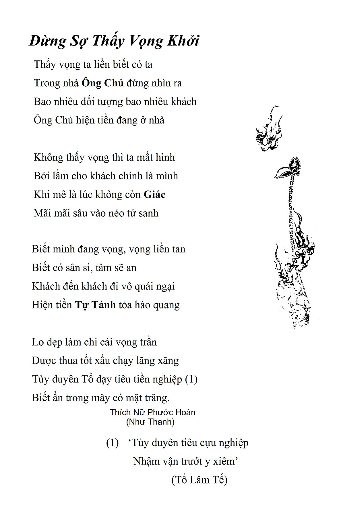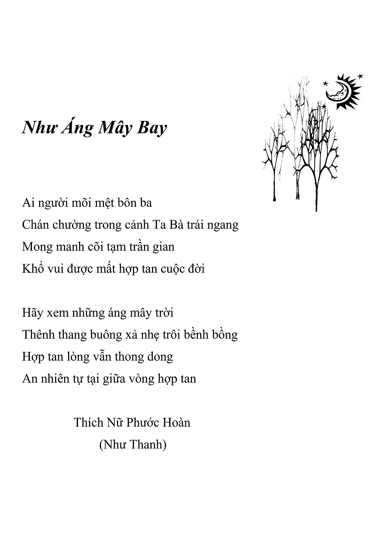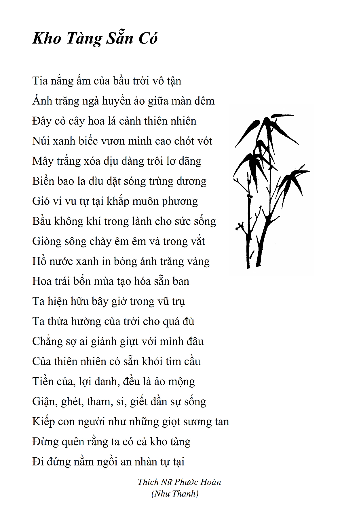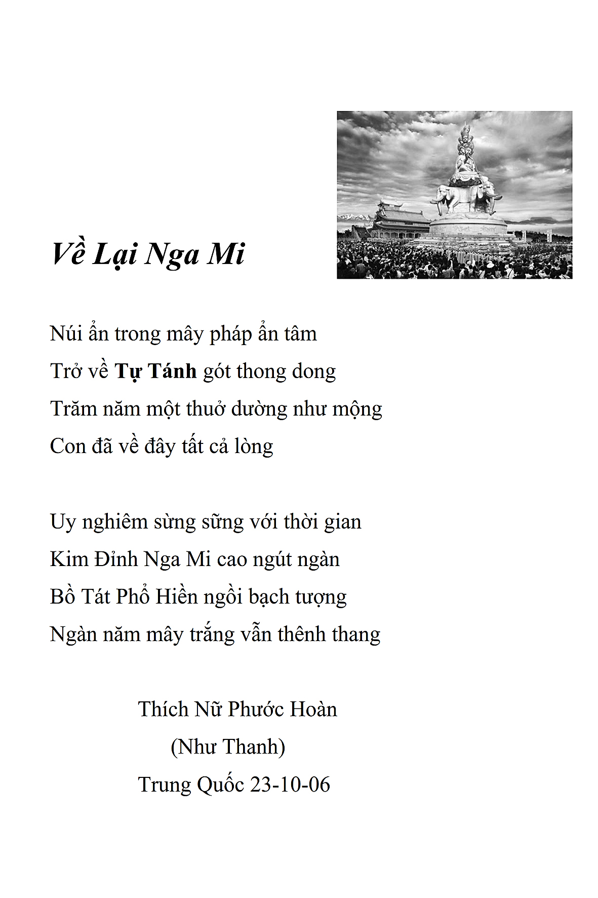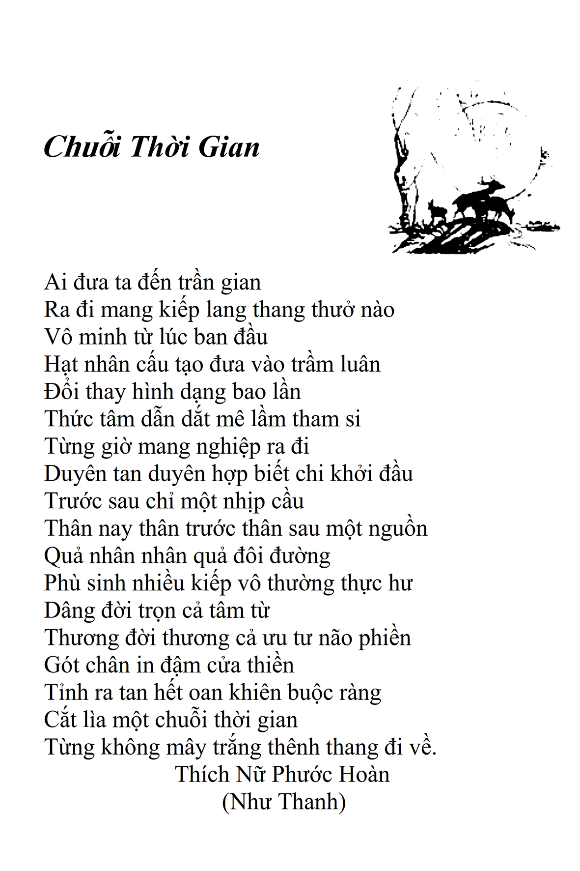 Là một nữ tu sĩ chân yếu tay mềm, Phật sự đa đoan, lòng tôi vẫn cảm thấy tràn đầy nguồn an ủi vô biên trong những lúc mệt nhọc. Những ngày gần đây, các bài thơ trong tập thơ Hoa Thiền, mang tâm ý Phật Pháp, được Cô Đặng Lan và các thi sĩ ngâm vịnh, được Phật tử Tâm Nghiêm đọc vào đĩa, được Nhạc sĩ Nguyễn Nhật Tân phổ nhạc… với những niềm khích lệ đó, khiến tôi cố gắng sáng tác thêm những vần thơ mới. Và hôm nay, tập thơ Hoa Thiền tái bản, mang vóc dáng trang trọng, gói trọn một nội dung hồn thơ và ý nhạc, khiến cho lời thơ nhẹ nhàng bay vút khắp nơi và tuôn chảy vào tận cõi lòng người. Tôi xin chân thành cảm nhận tất cả và trân trọng khắc ghi vào lòng một kỷ niệm đẹp trong suốt hành trình dấn thân vì Đạo.