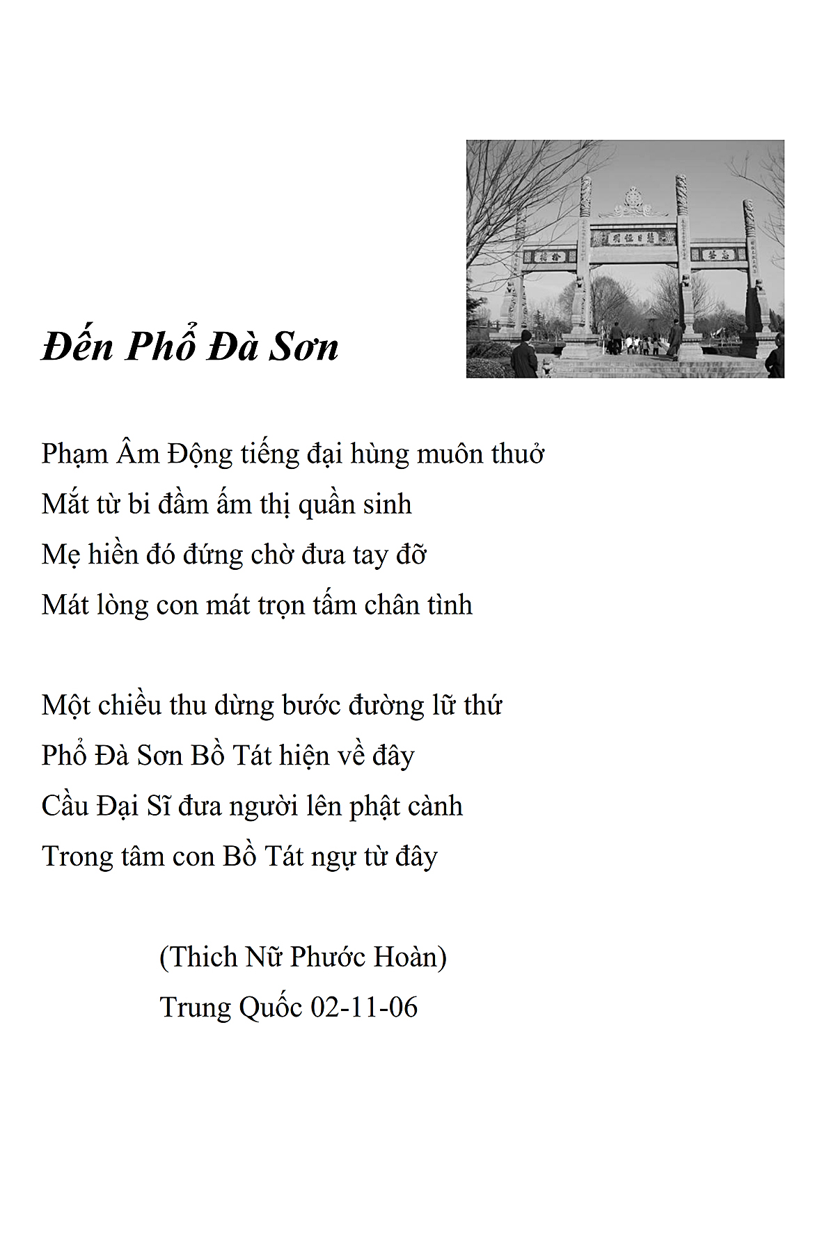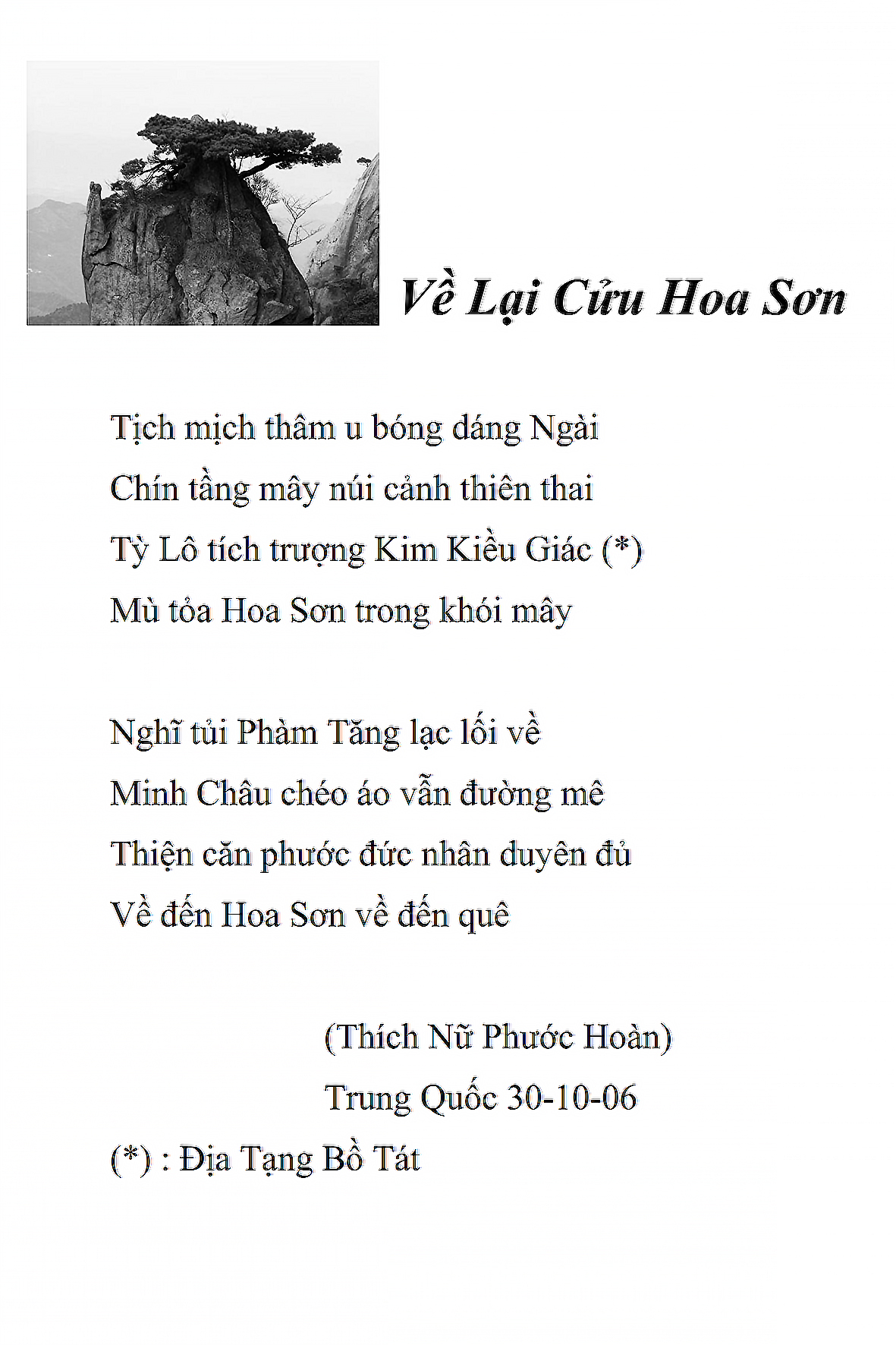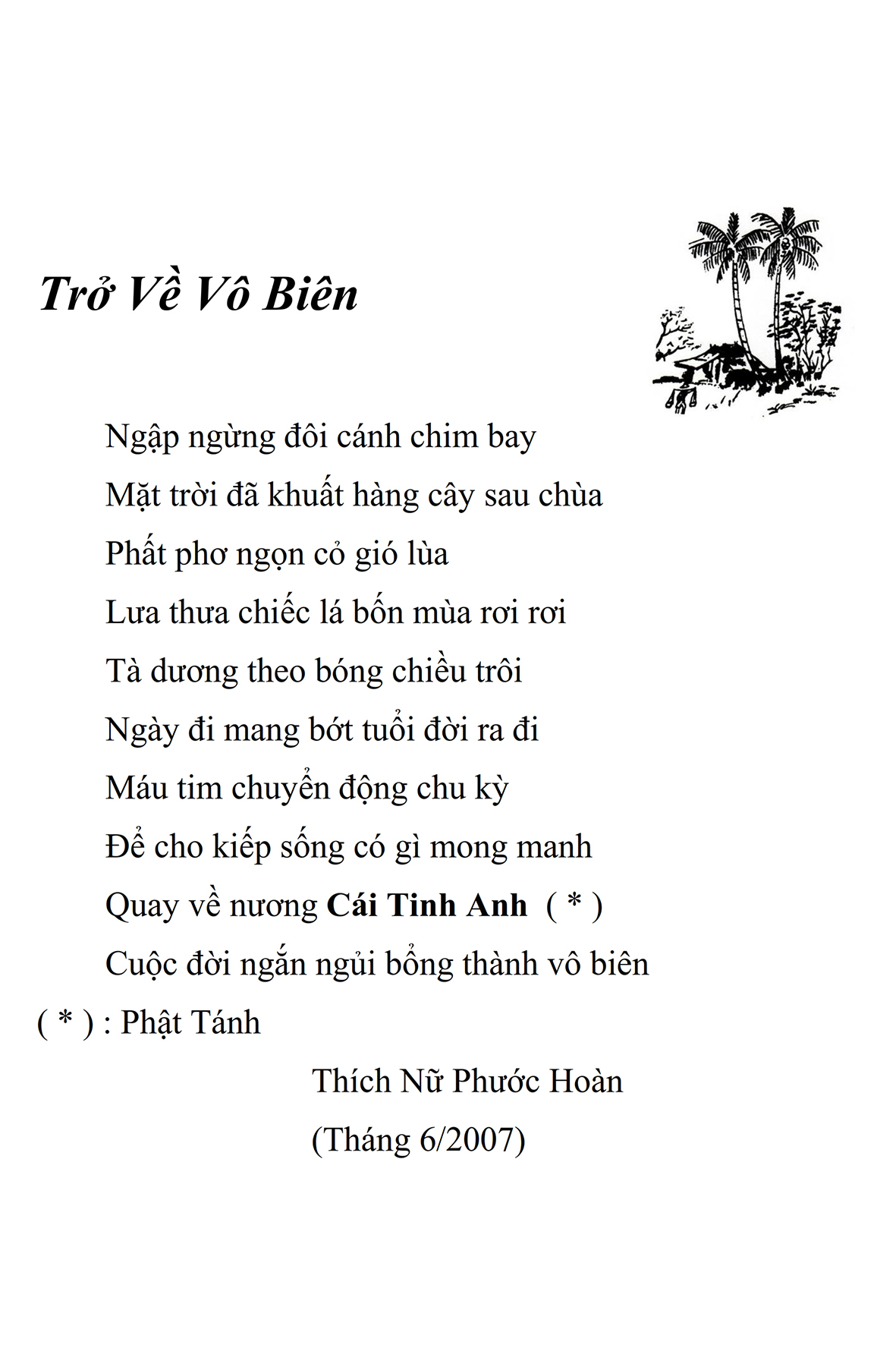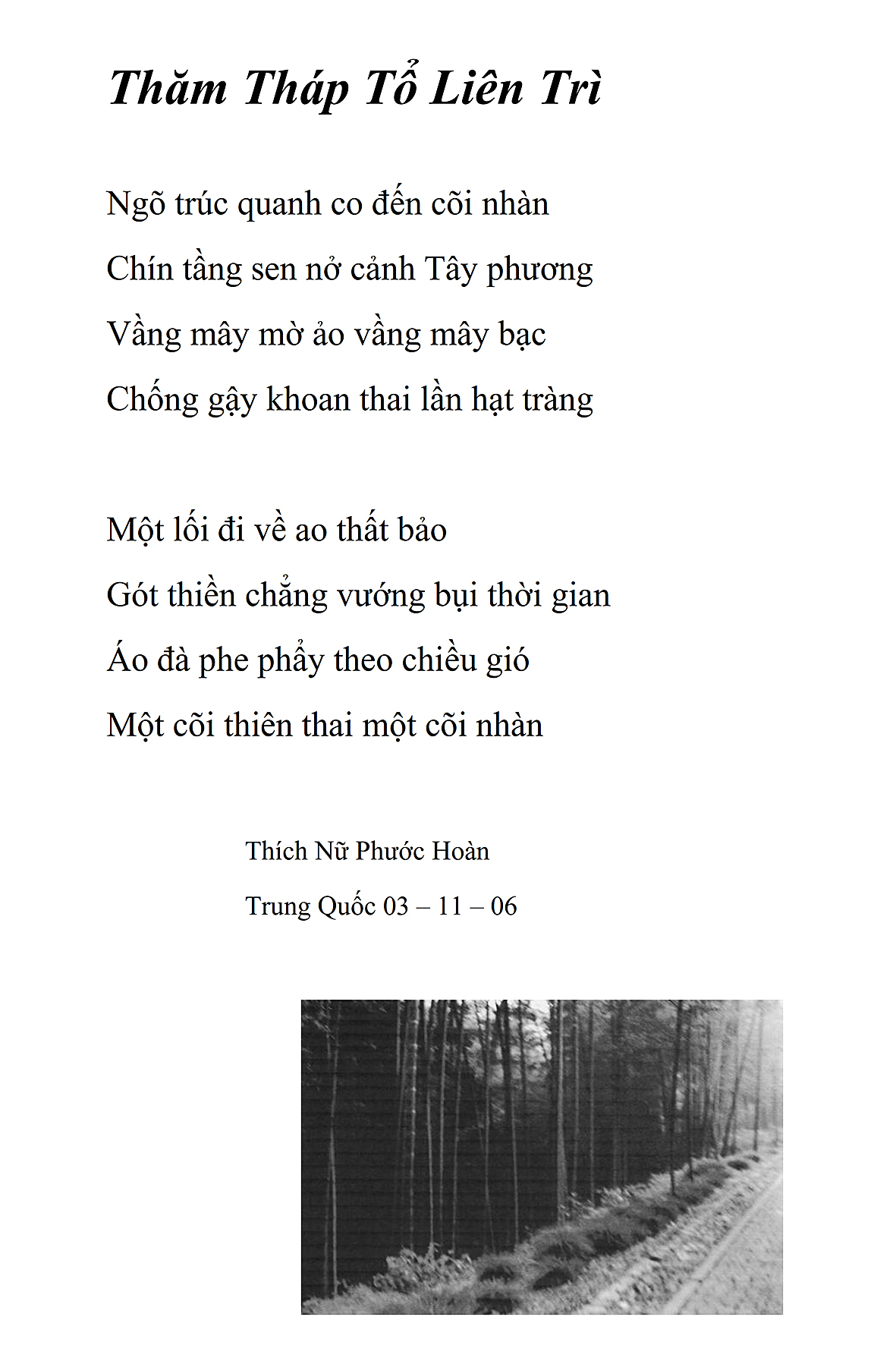 Là một nữ tu sĩ chân yếu tay mềm, Phật sự đa đoan, lòng tôi vẫn cảm thấy tràn đầy nguồn an ủi vô biên trong những lúc mệt nhọc. Những ngày gần đây, các bài thơ trong tập thơ Hoa Thiền, mang tâm ý Phật Pháp, được Cô Đặng Lan và các thi sĩ ngâm vịnh, được Phật tử Tâm Nghiêm đọc vào đĩa, được Nhạc sĩ Nguyễn Nhật Tân phổ nhạc… với những niềm khích lệ đó, khiến tôi cố gắng sáng tác thêm những vần thơ mới. Và hôm nay, tập thơ Hoa Thiền tái bản, mang vóc dáng trang trọng, gói trọn một nội dung hồn thơ và ý nhạc, khiến cho lời thơ nhẹ nhàng bay vút khắp nơi và tuôn chảy vào tận cõi lòng người. Tôi xin chân thành cảm nhận tất cả và trân trọng khắc ghi vào lòng một kỷ niệm đẹp trong suốt hành trình dấn thân vì Đạo.