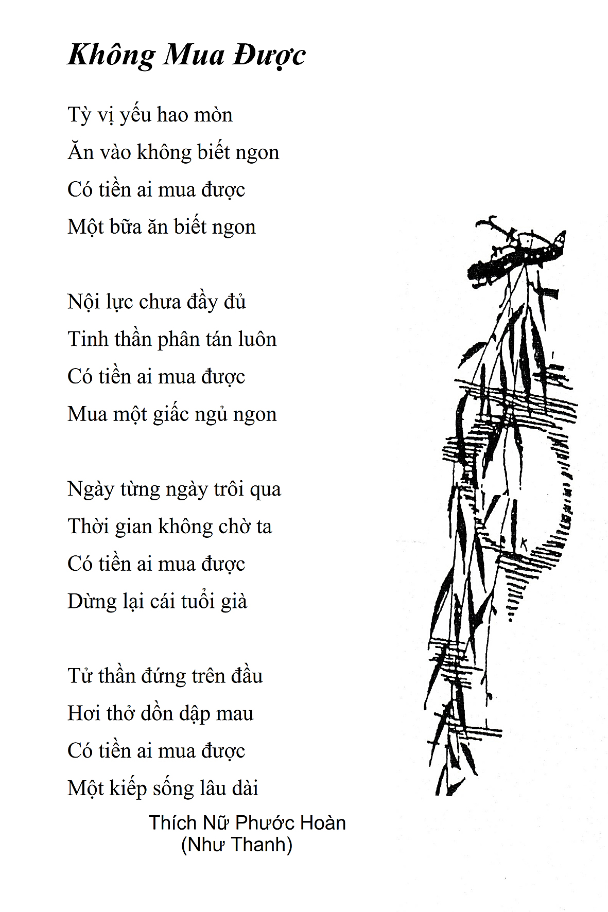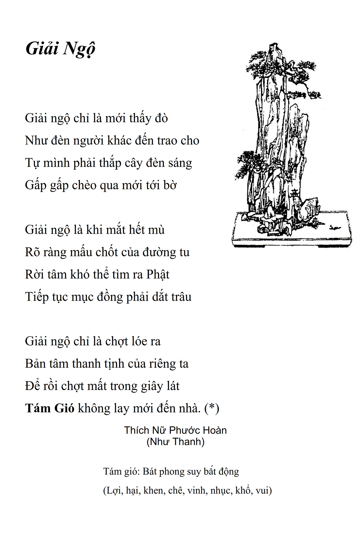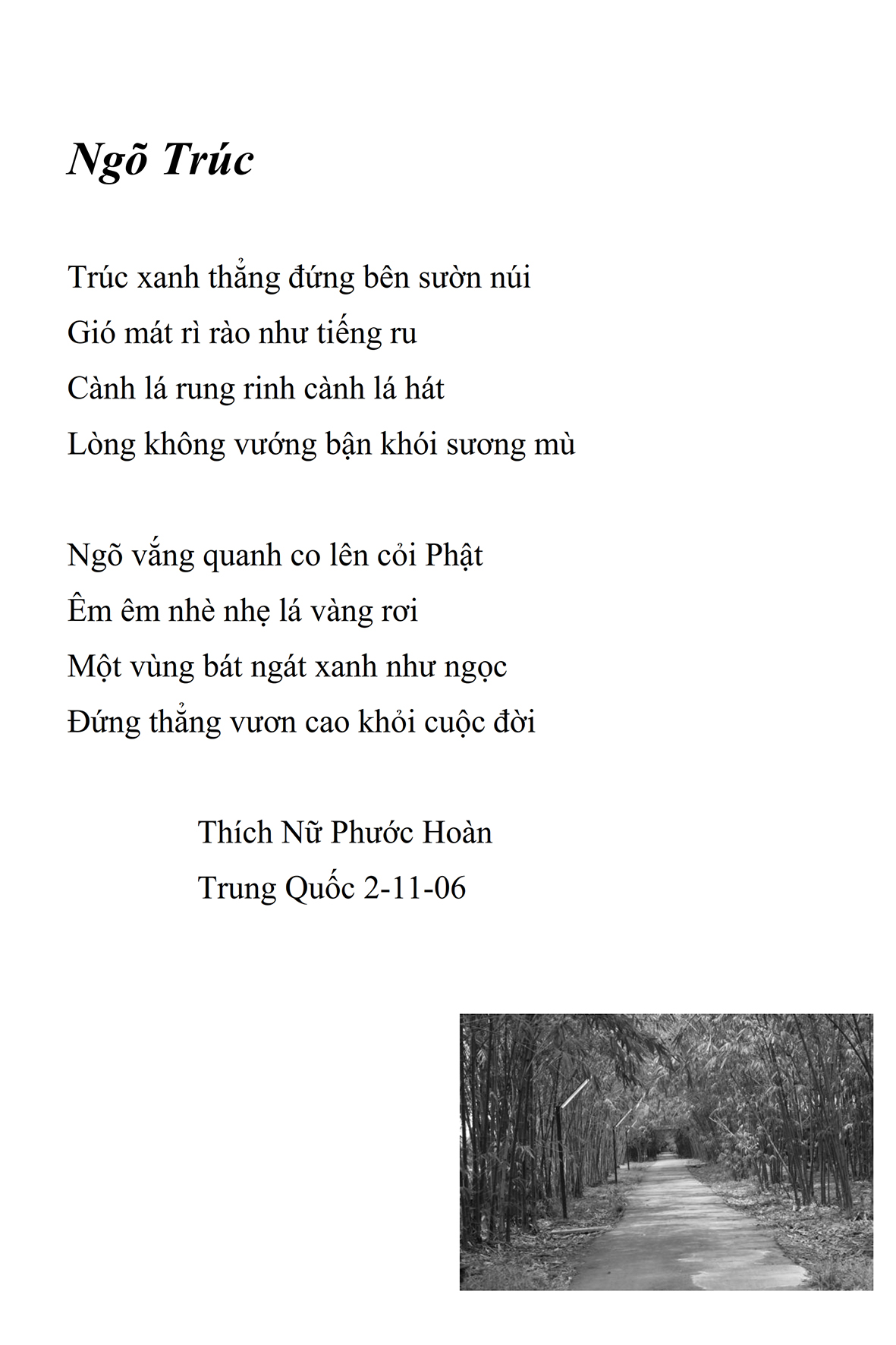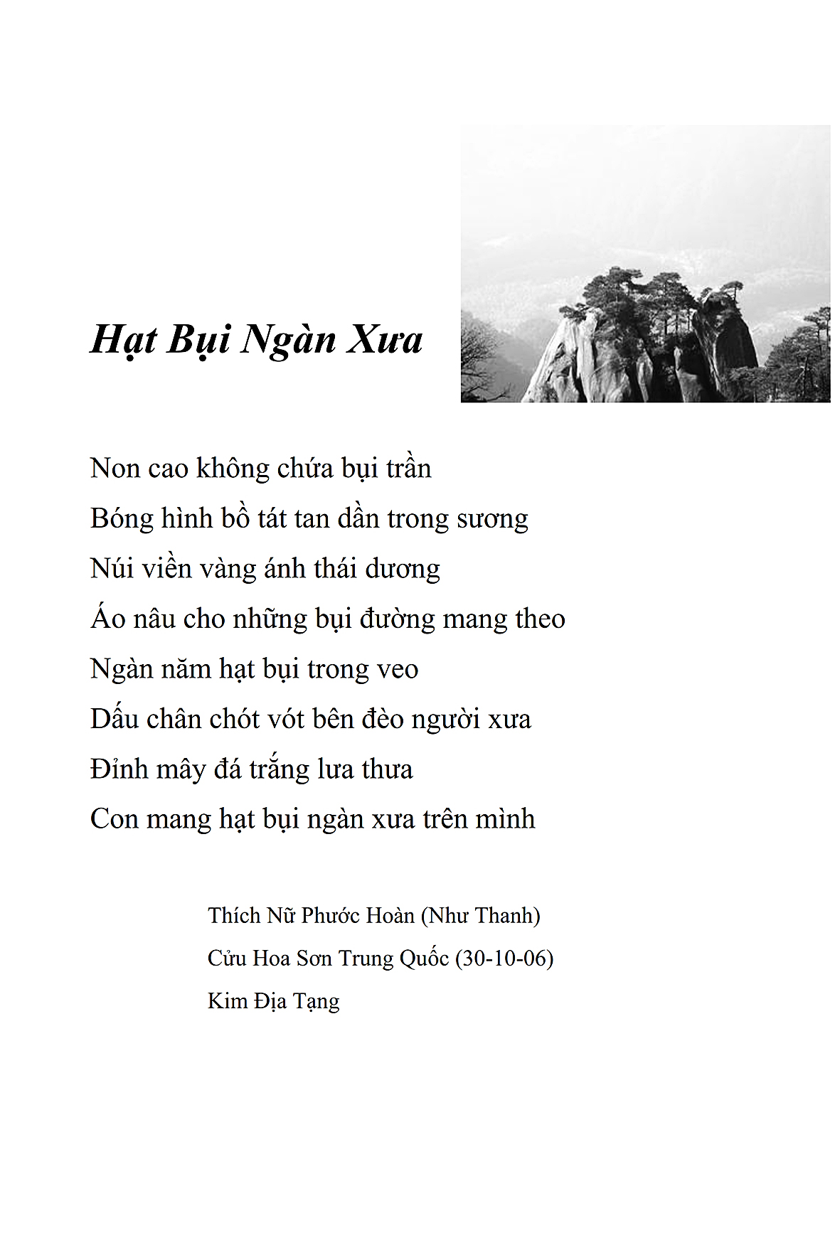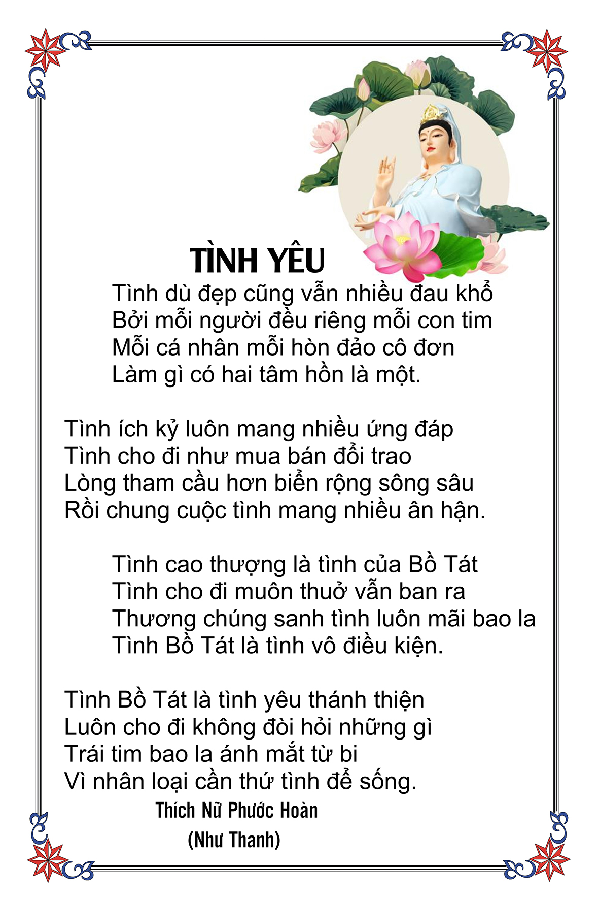 Là một nữ tu sĩ chân yếu tay mềm, Phật sự đa đoan, lòng tôi vẫn cảm thấy tràn đầy nguồn an ủi vô biên trong những lúc mệt nhọc. Những ngày gần đây, các bài thơ trong tập thơ Hoa Thiền, mang tâm ý Phật Pháp, được Cô Đặng Lan và các thi sĩ ngâm vịnh, được Phật tử Tâm Nghiêm đọc vào đĩa, được Nhạc sĩ Nguyễn Nhật Tân phổ nhạc… với những niềm khích lệ đó, khiến tôi cố gắng sáng tác thêm những vần thơ mới. Và hôm nay, tập thơ Hoa Thiền tái bản, mang vóc dáng trang trọng, gói trọn một nội dung hồn thơ và ý nhạc, khiến cho lời thơ nhẹ nhàng bay vút khắp nơi và tuôn chảy vào tận cõi lòng người. Tôi xin chân thành cảm nhận tất cả và trân trọng khắc ghi vào lòng một kỷ niệm đẹp trong suốt hành trình dấn thân vì Đạo.