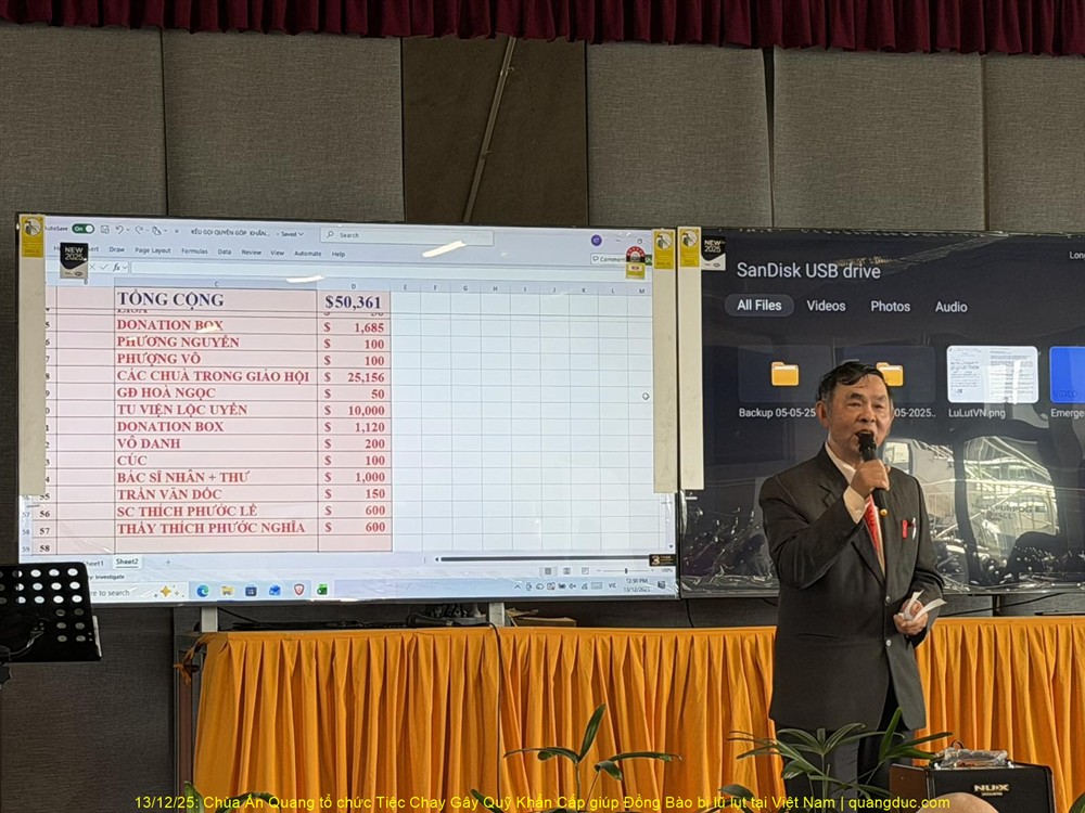 Mở đầu chương trình, Hòa Thượng Thích Thiện Tâm, Chủ Tịch Giáo Hội Phật Giáo Việt Nam Thống Nhất, Viện Chủ Chùa Ấn Quang, đã có lời khai mạc và cảm tạ quý đồng hương, Phật tử đã hoan hỷ về tham dự, cùng chung tay phát tâm cứu trợ.