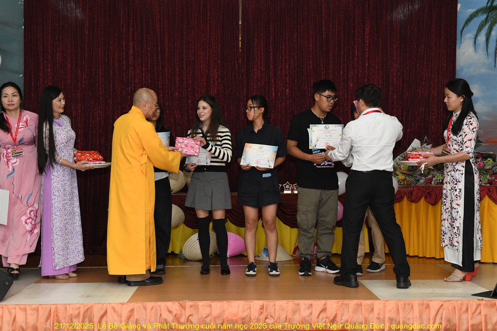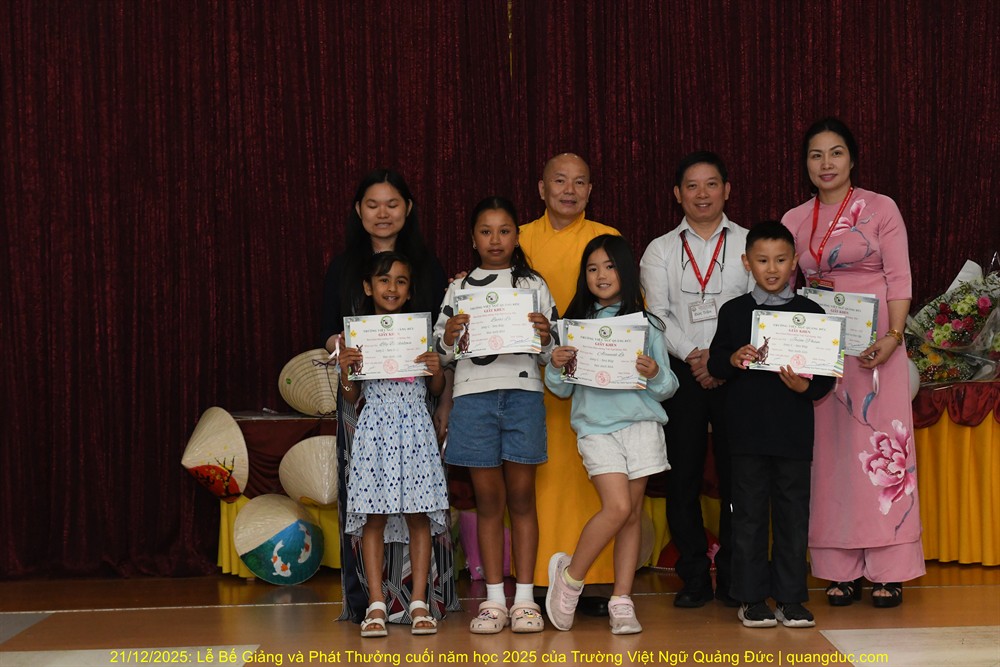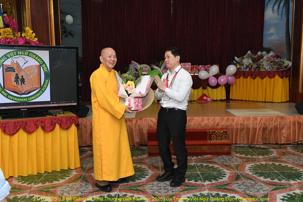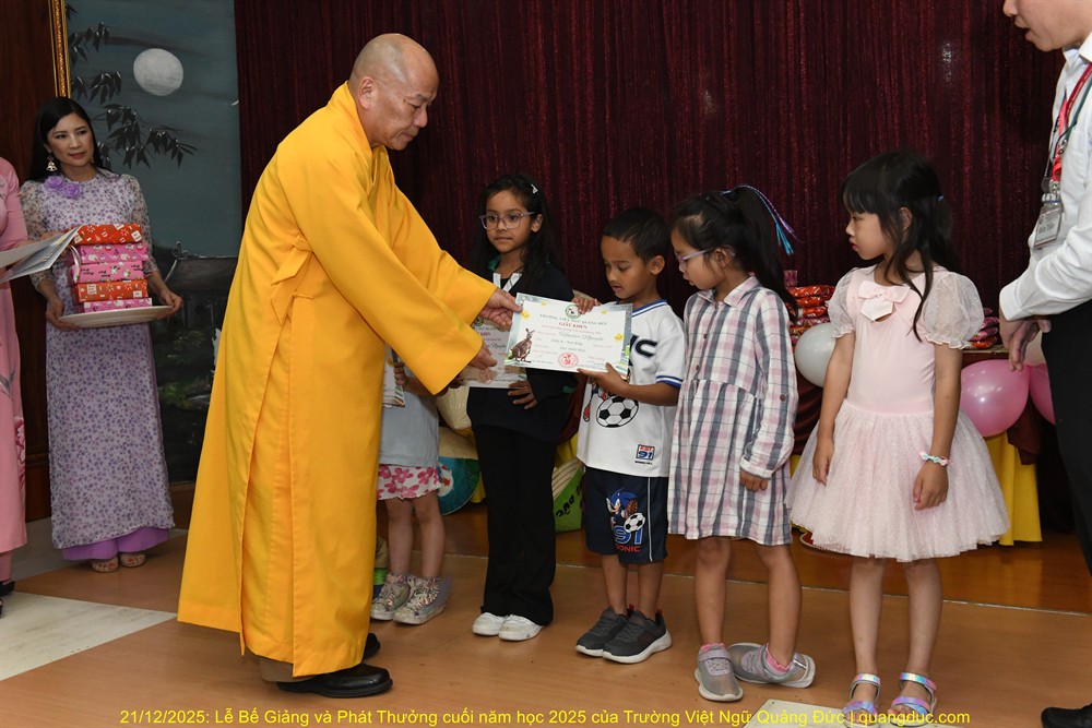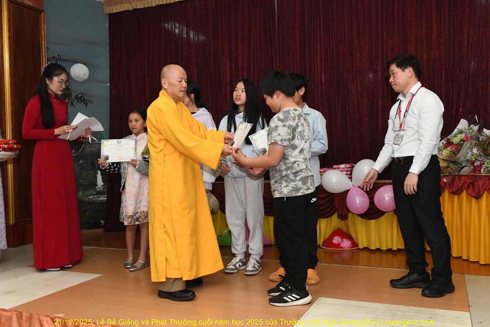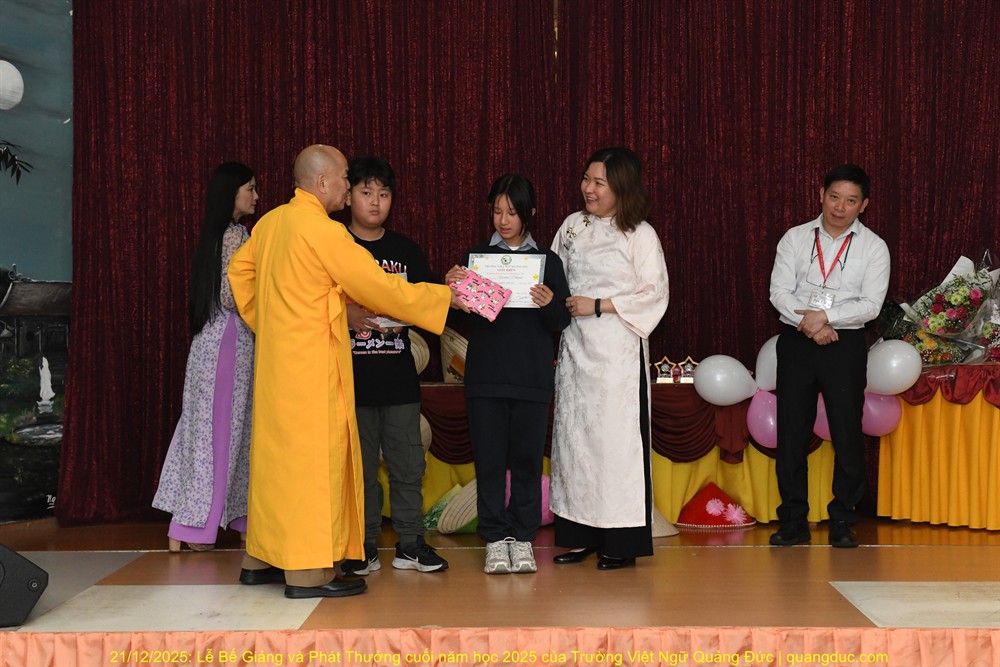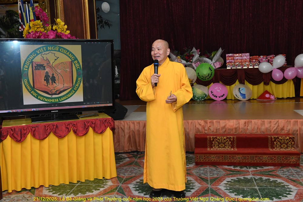 Tiếp theo chương trình là lời phát biểu của Thầy Hiệu Trưởng Thích Nguyên Tạng. Trước hết, Ngài thay mặt Ôn Viện Chủ Tu Viện Quảng Đức ngỏ lời tri ân sâu sắc đến toàn thể quý thầy cô giáo, những người đã âm thầm hy sinh thời gian, công sức, không quản ngại đường xa, dạy học bằng tâm nguyện phụng sự và tình thương. Dạy tiếng Việt nơi hải ngoại không chỉ là dạy chữ, mà là gieo hạt giống văn hoá, đạo đức và cội nguồn vào tâm hồn các em. Công đức ấy thật đáng trân quý. Thầy Hiệu Trưởng đã kể một mẫu chuyện vui về trẻ em người Việt sinh ra ở Úc nói tiếng Việt. Có một người cậu ghé thăm nhà em gái. Cậu hỏi cháu nhỏ: “Mẹ con đang làm gì vậy?”. Em bé hồn nhiên trả lời: “Nó đang giặt đầu.” Cả nhà bật cười, thay vì nói đúng là “Mẹ con đang gội đầu”, em bé đã dùng cách diễn đạt… rất “sáng tạo”, phản ánh lối suy nghĩ và ảnh hưởng trực tiếp từ tiếng Anh “She is washing her hair” sang tiếng Việt. Qua câu chuyện dí dỏm ấy, Thầy Hiệu Trưởng nhẹ nhàng nhắn nhủ rằng: nếu chúng ta không kiên trì dạy và sửa tiếng Việt cho các em từ sớm, thì các em vẫn nói được tiếng Việt, nhưng sẽ nói theo kiểu “dịch từng chữ”, dần dần làm mất đi sự trong sáng và tinh tế của tiếng mẹ đẻ. Chính vì vậy, việc duy trì các lớp Việt ngữ nơi hải ngoại không chỉ là dạy chữ, mà còn là giữ gìn cách nói, cách nghĩ và hồn cốt văn hóa Việt cho thế hệ mai sau.Thầy Hiệu Trưởng cũng xin chân thành cảm ơn quý vị phụ huynh. Giữa nhịp sống bận rộn của xã hội Úc Châu, việc đều đặn đưa con em đến Tu Viện Quảng Đức mỗi tuần là cả một sự kiên trì và hy sinh thầm lặng. Chính sự đồng hành của quý vị đã giúp nhà trường duy trì và phát triển, để các em có môi trường học tập lành mạnh, gắn bó với tiếng Việt và văn hóa dân tộc. Thầy Hiệu Trưởng cũng chúc mừng các em được lên sân khấu nhận phần thưởng không chỉ vì điểm số hay thành tích, mà vì sự cố gắng, chăm chỉ và tinh thần học hỏi suốt một năm qua. Mỗi chữ tiếng Việt các em học được là một sợi dây nối các em với ông bà, cha mẹ và quê hương Việt Nam. Thầy mong rằng, dù sinh ra và lớn lên tại Úc, các em vẫn luôn tự hào khi nói tiếng Việt, và xem đó là một phần quý giá trong hành trang cuộc đời mình. Trường Việt Ngữ Quảng Đức không chỉ là nơi học chữ, mà còn là một mái nhà chung, nơi các em được sinh hoạt, vui chơi, học hỏi về đạo đức, văn hóa, lịch sử và tình thương. Những hoạt động như Tết Trung Thu, Tết Nguyên Đán, Lễ Vu Lan hay các sinh hoạt cộng đồng chính là cơ hội để các em nuôi dưỡng lòng biết ơn và tinh thần gắn kết. Cuối cùng, Thầy Hiệu Trưởng chúc các em học sinh nghỉ hè vui khỏe, ngoan ngoãn, hiếu thảo, và hẹn gặp lại các em trong năm học mới với thật nhiều niềm vui và tiến bộ.