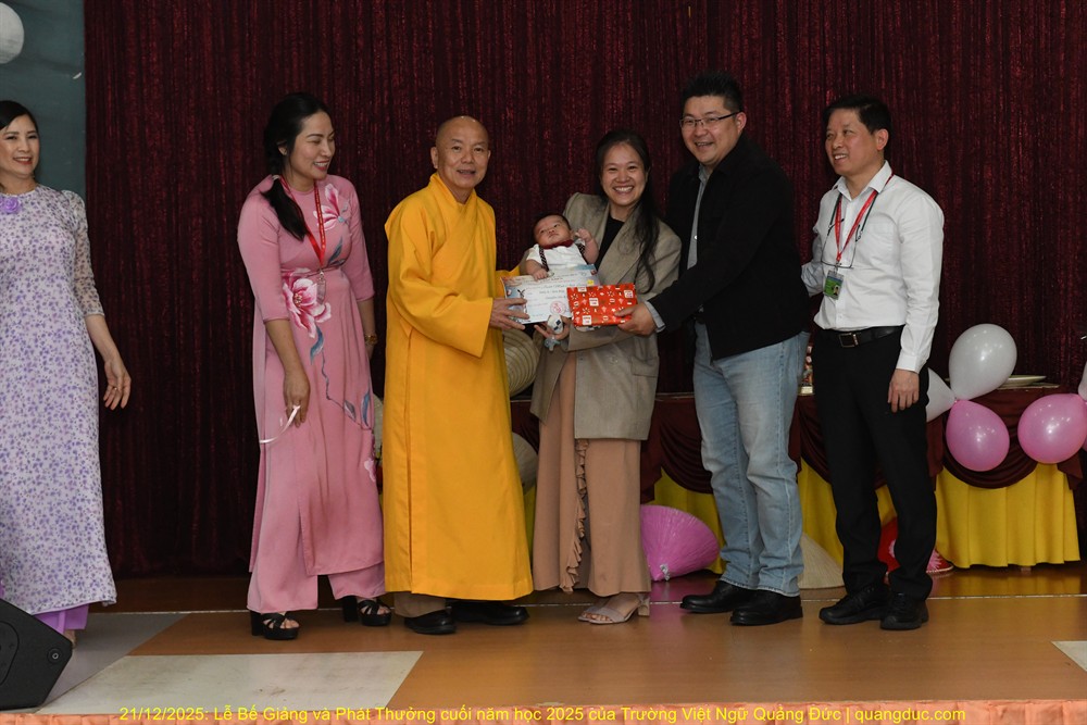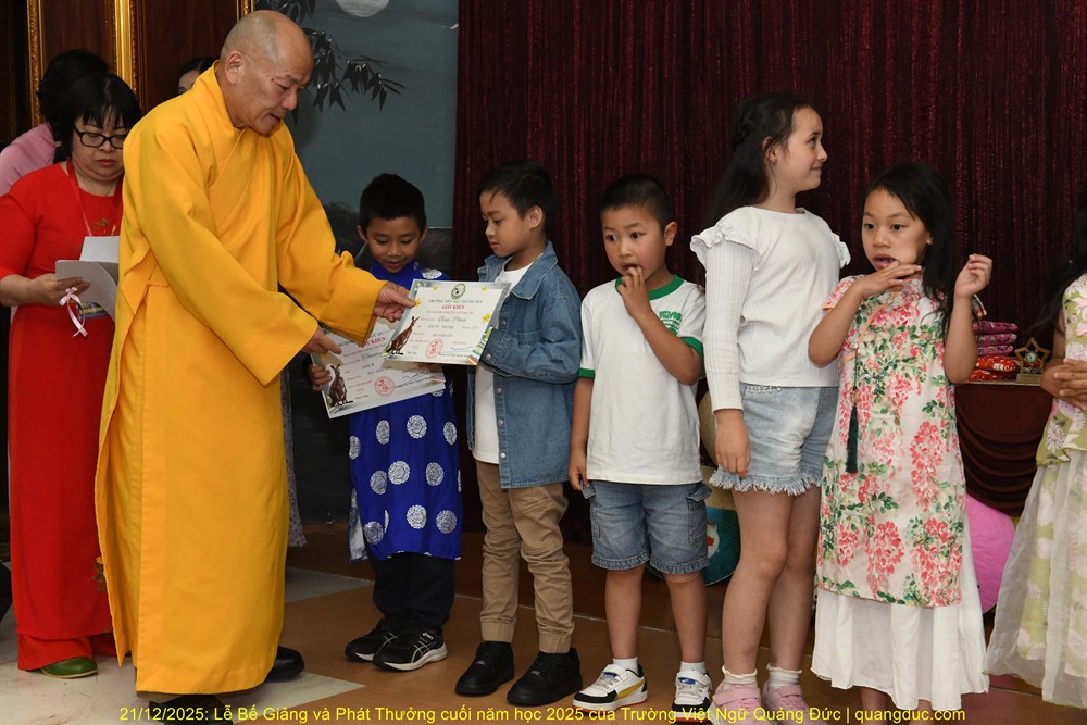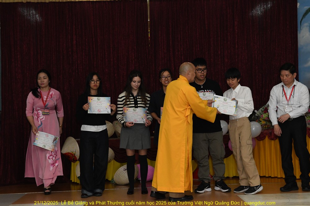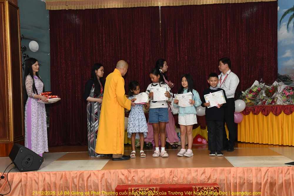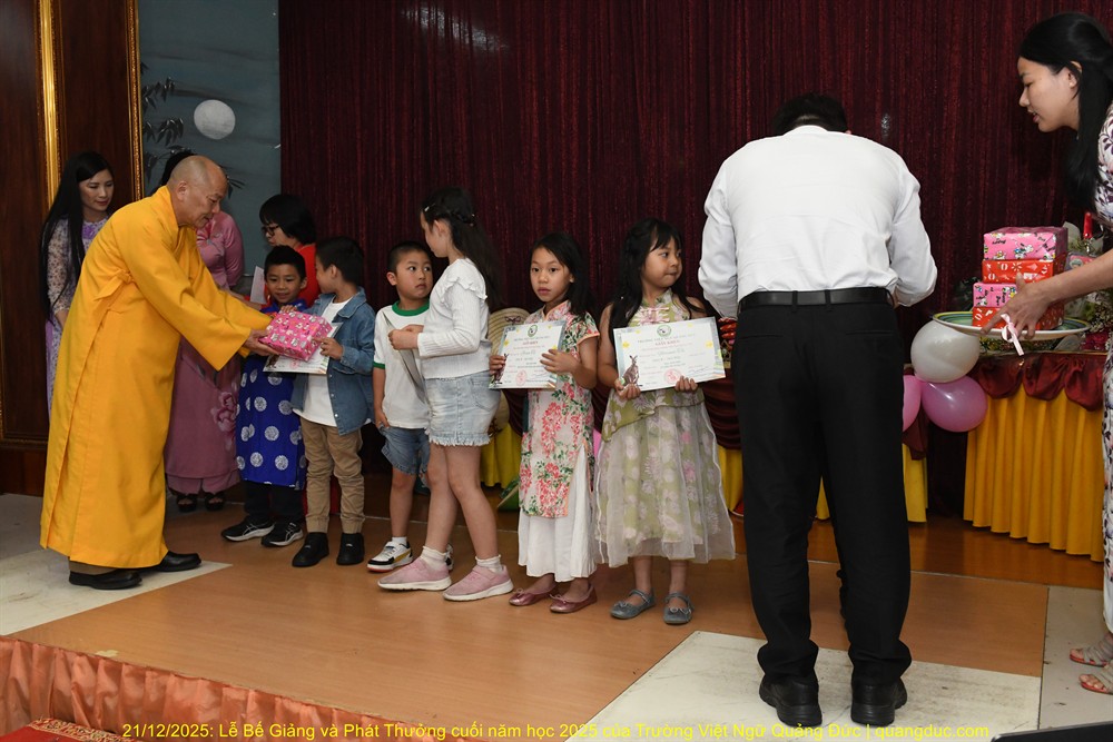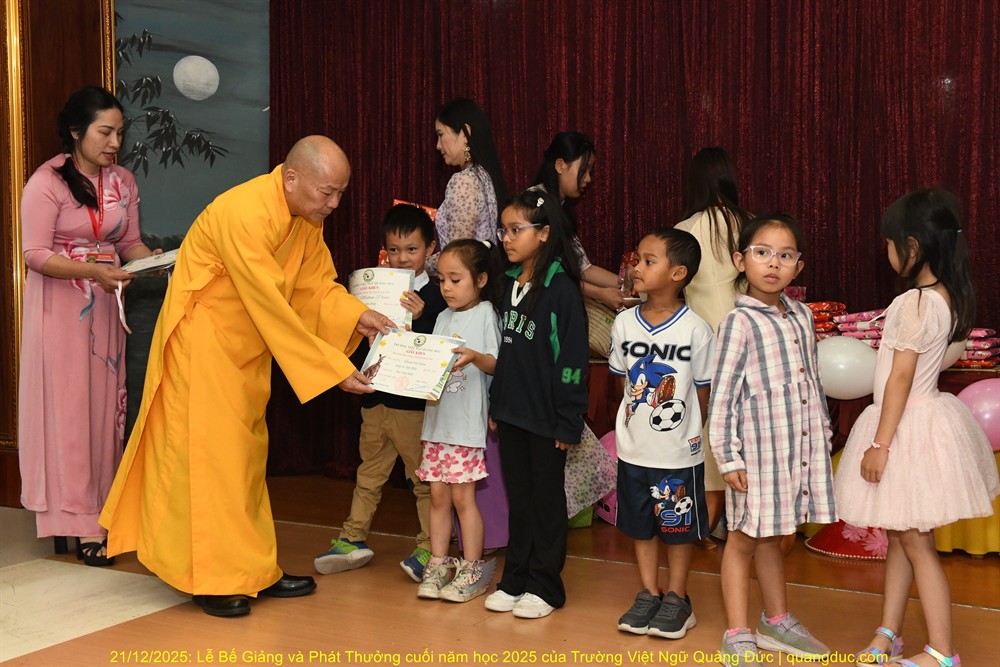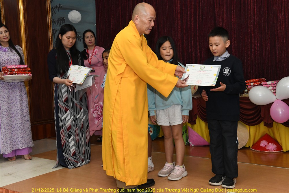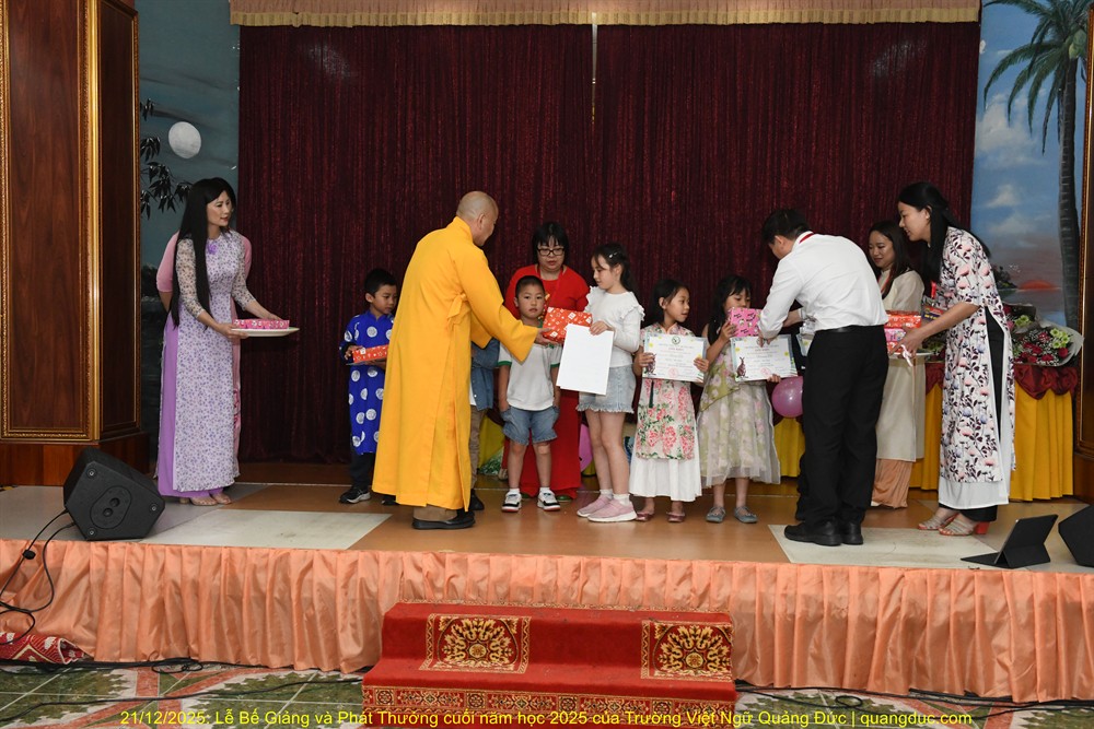 Tiếp theo chương trình là lời phát biểu của Thầy Hiệu Trưởng Thích Nguyên Tạng. Trước hết, Ngài thay mặt Ôn Viện Chủ Tu Viện Quảng Đức ngỏ lời tri ân sâu sắc đến toàn thể quý thầy cô giáo, những người đã âm thầm hy sinh thời gian, công sức, không quản ngại đường xa, dạy học bằng tâm nguyện phụng sự và tình thương. Dạy tiếng Việt nơi hải ngoại không chỉ là dạy chữ, mà là gieo hạt giống văn hoá, đạo đức và cội nguồn vào tâm hồn các em. Công đức ấy thật đáng trân quý. Thầy Hiệu Trưởng đã kể một mẫu chuyện vui về trẻ em người Việt sinh ra ở Úc nói tiếng Việt. Có một người cậu ghé thăm nhà em gái. Cậu hỏi cháu nhỏ: “Mẹ con đang làm gì vậy?”. Em bé hồn nhiên trả lời: “Nó đang giặt đầu.” Cả nhà bật cười, thay vì nói đúng là “Mẹ con đang gội đầu”, em bé đã dùng cách diễn đạt… rất “sáng tạo”, phản ánh lối suy nghĩ và ảnh hưởng trực tiếp từ tiếng Anh “She is washing her hair” sang tiếng Việt. Qua câu chuyện dí dỏm ấy, Thầy Hiệu Trưởng nhẹ nhàng nhắn nhủ rằng: nếu chúng ta không kiên trì dạy và sửa tiếng Việt cho các em từ sớm, thì các em vẫn nói được tiếng Việt, nhưng sẽ nói theo kiểu “dịch từng chữ”, dần dần làm mất đi sự trong sáng và tinh tế của tiếng mẹ đẻ. Chính vì vậy, việc duy trì các lớp Việt ngữ nơi hải ngoại không chỉ là dạy chữ, mà còn là giữ gìn cách nói, cách nghĩ và hồn cốt văn hóa Việt cho thế hệ mai sau.Thầy Hiệu Trưởng cũng xin chân thành cảm ơn quý vị phụ huynh. Giữa nhịp sống bận rộn của xã hội Úc Châu, việc đều đặn đưa con em đến Tu Viện Quảng Đức mỗi tuần là cả một sự kiên trì và hy sinh thầm lặng. Chính sự đồng hành của quý vị đã giúp nhà trường duy trì và phát triển, để các em có môi trường học tập lành mạnh, gắn bó với tiếng Việt và văn hóa dân tộc. Thầy Hiệu Trưởng cũng chúc mừng các em được lên sân khấu nhận phần thưởng không chỉ vì điểm số hay thành tích, mà vì sự cố gắng, chăm chỉ và tinh thần học hỏi suốt một năm qua. Mỗi chữ tiếng Việt các em học được là một sợi dây nối các em với ông bà, cha mẹ và quê hương Việt Nam. Thầy mong rằng, dù sinh ra và lớn lên tại Úc, các em vẫn luôn tự hào khi nói tiếng Việt, và xem đó là một phần quý giá trong hành trang cuộc đời mình. Trường Việt Ngữ Quảng Đức không chỉ là nơi học chữ, mà còn là một mái nhà chung, nơi các em được sinh hoạt, vui chơi, học hỏi về đạo đức, văn hóa, lịch sử và tình thương. Những hoạt động như Tết Trung Thu, Tết Nguyên Đán, Lễ Vu Lan hay các sinh hoạt cộng đồng chính là cơ hội để các em nuôi dưỡng lòng biết ơn và tinh thần gắn kết. Cuối cùng, Thầy Hiệu Trưởng chúc các em học sinh nghỉ hè vui khỏe, ngoan ngoãn, hiếu thảo, và hẹn gặp lại các em trong năm học mới với thật nhiều niềm vui và tiến bộ.