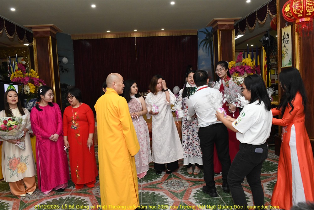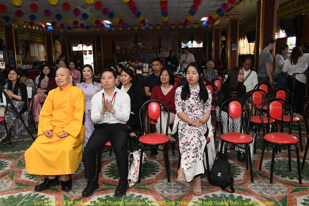 Tiếp theo chương trình, Thầy Trần Đức, pháp danh Nguyên Tâm, Giám Đốc Điều Hành Trường Việt Ngữ Quảng Đức, đã có đôi lời phát biểu chân thành và đầy xúc động. Thầy Đức đã bày tỏ lòng tri ân sâu sắc đến toàn thể quý thầy cô giáo của trường, những người đã tận tụy, hy sinh thời gian và công sức để giảng dạy thiện nguyện, góp phần nuôi dưỡng tiếng Việt và văn hóa cội nguồn cho thế hệ trẻ nơi hải ngoại. Thầy Đức cũng đặc biệt gửi lời cảm ơn đến quý vị phụ huynh học sinh, không chỉ vì sự kiên trì đưa đón con em đến chùa học tiếng Việt mỗi tuần, mà còn vì tinh thần phụng sự âm thầm trong suốt thời gian qua. Trong khi các em học tập, nhiều phụ huynh đã tranh thủ làm công quả tại Tu Viện, chung tay gìn giữ môi trường sinh hoạt chung cho nhà trường. Đặc biệt, Thầy xúc động nhắc đến sự đóng góp thầm lặng nhưng vô cùng quý báu của quý phụ huynh trong việc lo liệu các bữa ăn trưa cho học sinh suốt năm qua. Những bữa cơm chay tuy giản dị nhưng chan chứa tình thương ấy đã giúp các em có thêm năng lượng học tập, đồng thời gieo vào lòng các em bài học sống động về tình người, sự sẻ chia và tinh thần cộng đồng. Khép lại lời phát biểu, Thầy Đức bày tỏ mong muốn tiếp tục nhận được sự đồng hành và yểm trợ của quý thầy cô, quý phụ huynh và Phật tử, để Trường Việt Ngữ Quảng Đức ngày càng phát triển bền vững, trở thành mái nhà chung nuôi dưỡng tiếng Việt và đạo đức cho các em trong những năm học sắp tới.