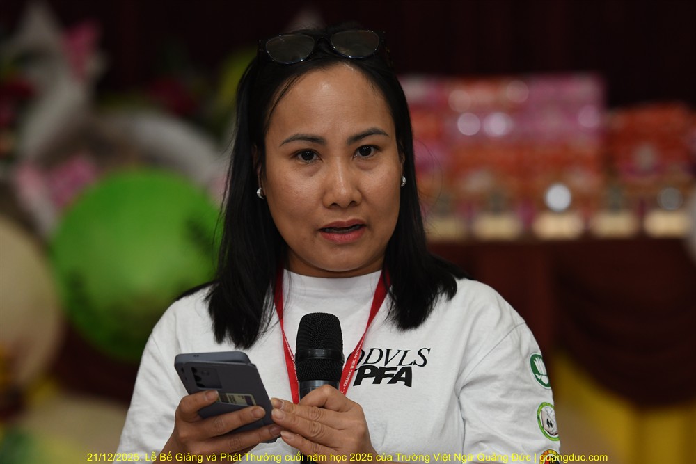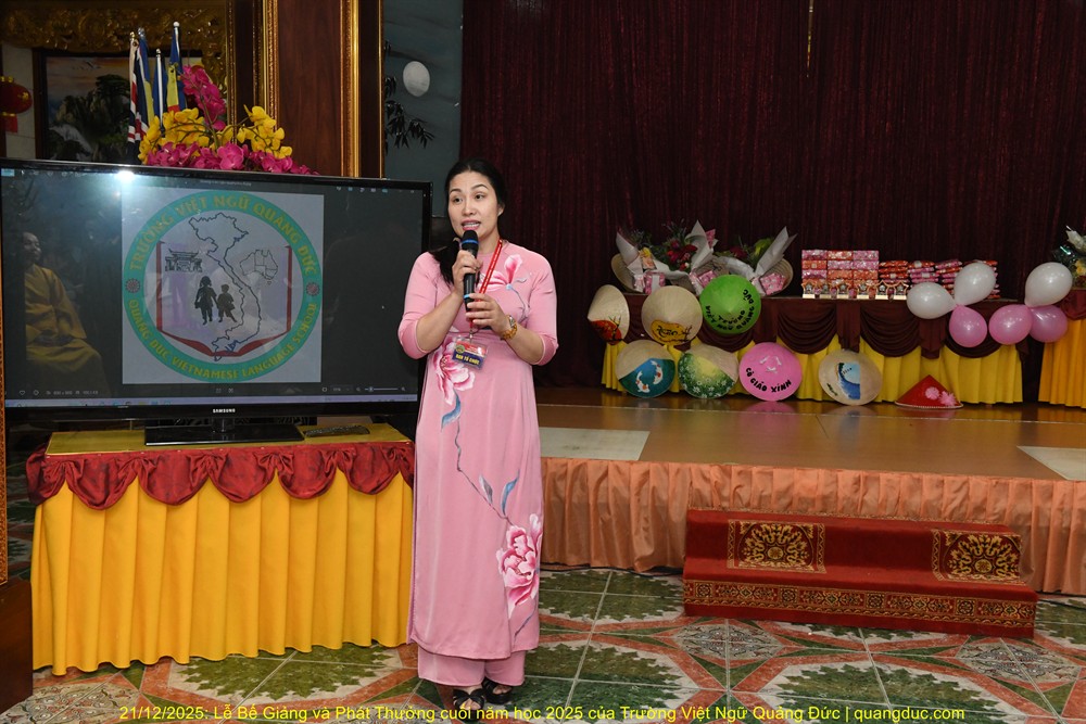 Theo sau là đại diện Ban Giáo Viên, cô Thu Hà (pháp danh Nguyên Quảng Hằng), Trưởng Ban Giáo Viên Trường Việt Ngữ Quảng Đức, đã trình bày báo cáo tổng kết năm học 2025 trong sự lắng nghe chăm chú của toàn thể hội trường. Cô Thu Hà cho biết những ngày khai giảng đầu tiên trường chỉ có vài em học sinh, song nhờ sự tin tưởng và đồng hành của quý phụ huynh, số lượng học sinh tăng dần theo từng tuần, đến nay đã có gần 40 em theo học thường xuyên. Cùng với đó, đội ngũ giáo viên cũng không ngừng phát triển, từ 5 cô giáo ban đầu lên 12 cô, tất cả đều chung một tấm lòng tận tụy và yêu nghề. Cô Thu Hà thẳng thắn nhìn nhận những khó khăn trong quá trình giảng dạy, như sự chênh lệch trình độ giữa các em, việc học chưa đều đặn và điều kiện giảng dạy còn hạn chế. Tuy nhiên, bằng tinh thần kiên trì, đoàn kết và trách nhiệm, tập thể giáo viên đã từng bước vượt qua trở ngại, giúp các em yêu thích, tự tin và tiến bộ trong việc sử dụng tiếng Việt. Khép lại báo cáo, cô bày tỏ lòng tri ân sâu sắc đến quý phụ huynh đã âm thầm hy sinh thời gian và công sức đưa đón con em đến lớp mỗi tuần, góp phần nuôi dưỡng tình yêu tiếng mẹ đẻ và gìn giữ bản sắc văn hóa Việt nơi hải ngoại. Năm học 2025 khép lại với nhiều tín hiệu đáng mừng, đồng thời mở ra những định hướng tích cực cho năm học 2026, tiếp tục nâng cao chất lượng giảng dạy và củng cố nền tảng tiếng Việt cho thế hệ trẻ.
