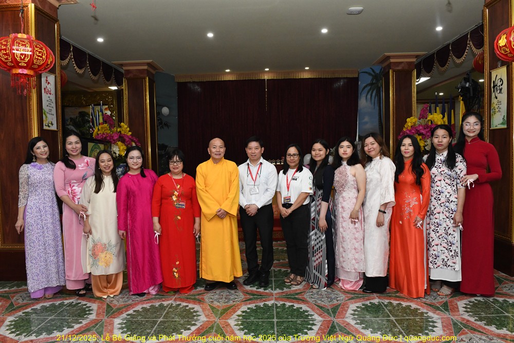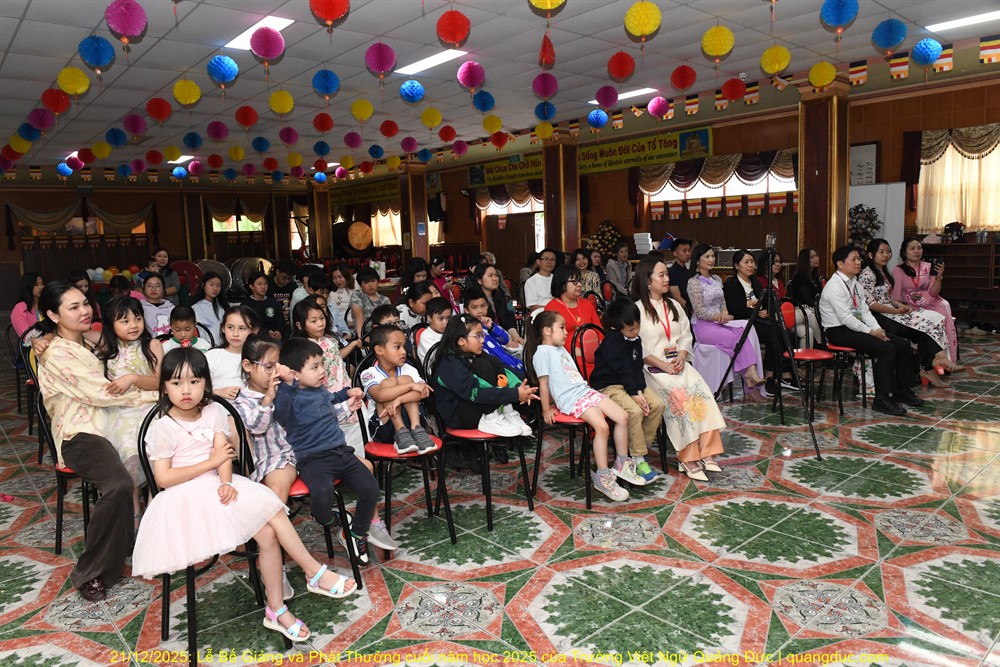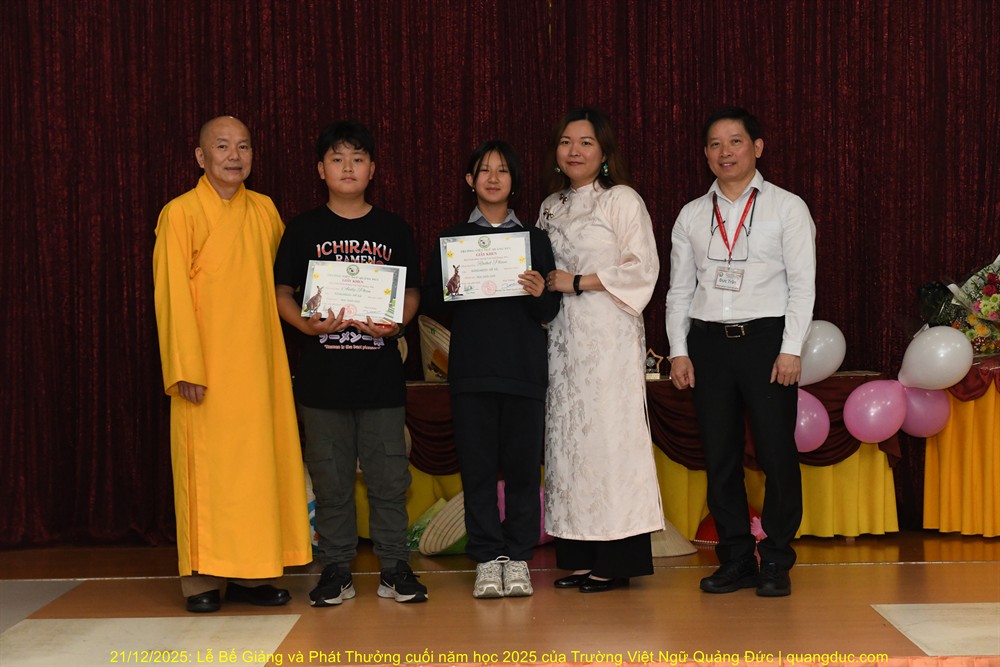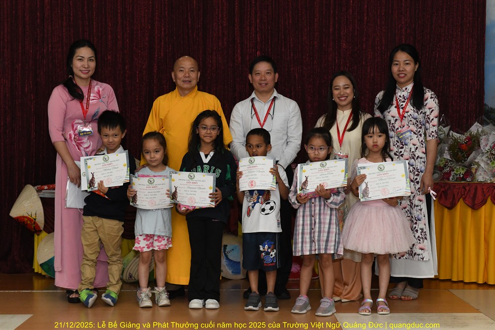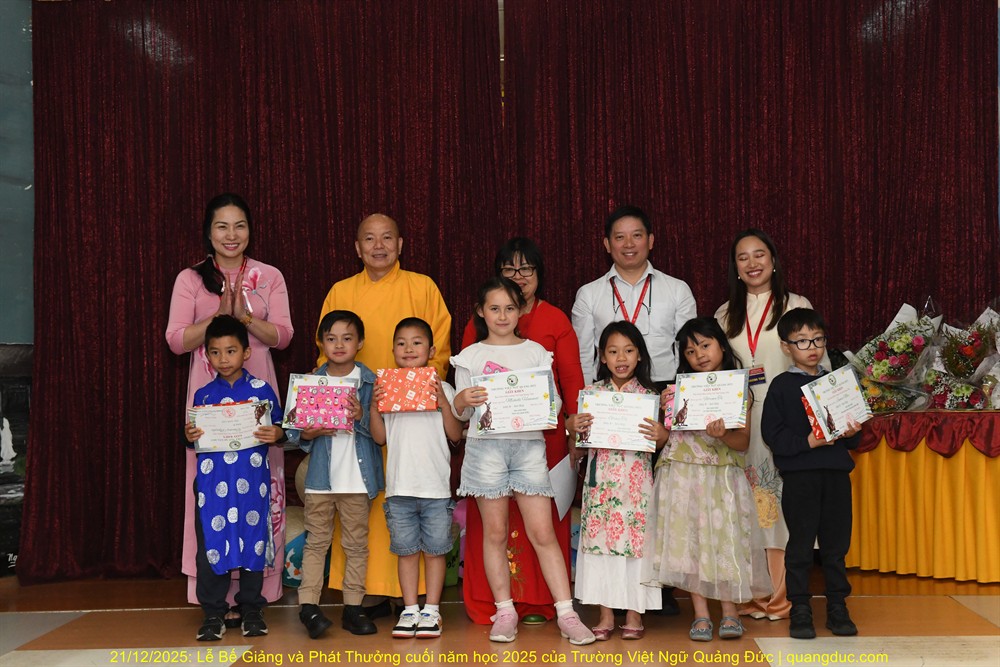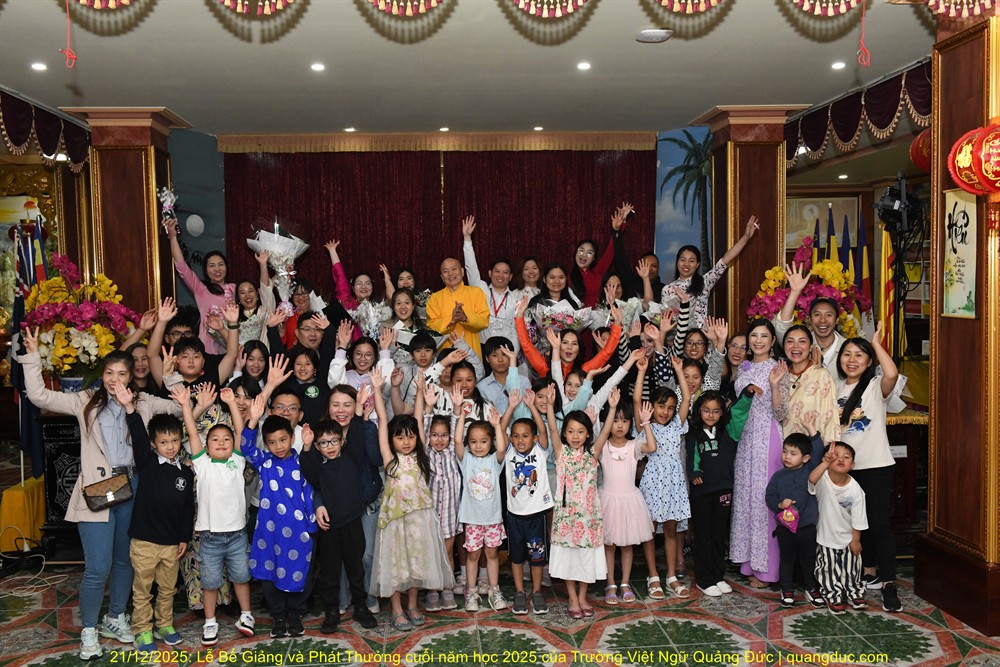 Trưa nay, Chủ nhật ngày 21/12/2025, trong không khí hân hoan và ấm áp của những ngày hè nước Úc, Trường Việt Ngữ Quảng Đức đã long trọng tổ chức Lễ Tổng Kết & Phát Thưởng Năm Học 2025 tại Tu Viện Quảng Đức. Buổi lễ diễn ra từ 10:30 đến 13:30, với sự tham dự đông đủ của chư Tôn Đức, Ban Giám Hiệu, quý thầy cô giáo, quý vị phụ huynh và toàn thể các em học sinh.