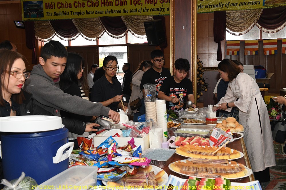 Khép lại lễ tổng kết trong không khí thân mật và hoan hỷ, Ban Giám Hiệu, quý thầy cô giáo cùng toàn thể các em học sinh đã cùng nhau dùng bữa cơm chay trưa tại Tu Viện Quảng Đức. Bữa cơm tuy giản dị nhưng chan chứa nghĩa tình, là dịp để thầy cô, phụ huynh và các em học sinh cùng sẻ chia niềm vui sau một năm học tập và sinh hoạt chung.