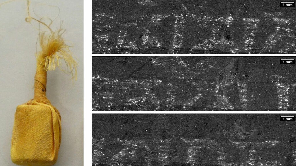 Các nhà nghiên cứu đã mở ảo một cuộn kinh bọc lụa (bên trái), để lộ một dải giấy có dòng chữ “Om mani padme hum” (bên phải)