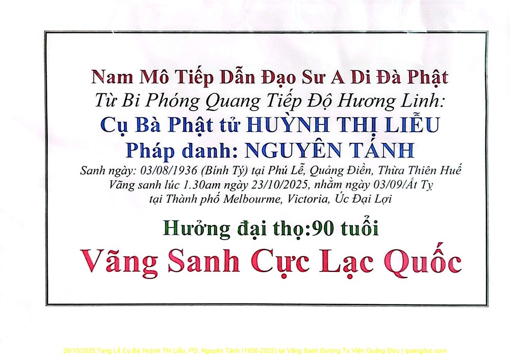 26/10/2025: Lễ Nhập liệm Cụ Bà Huỳnh Thị Liễu, PD: Nguyên Tánh (1936-2025) tại Vãng Sanh Đường Tu Viện Quảng Đức