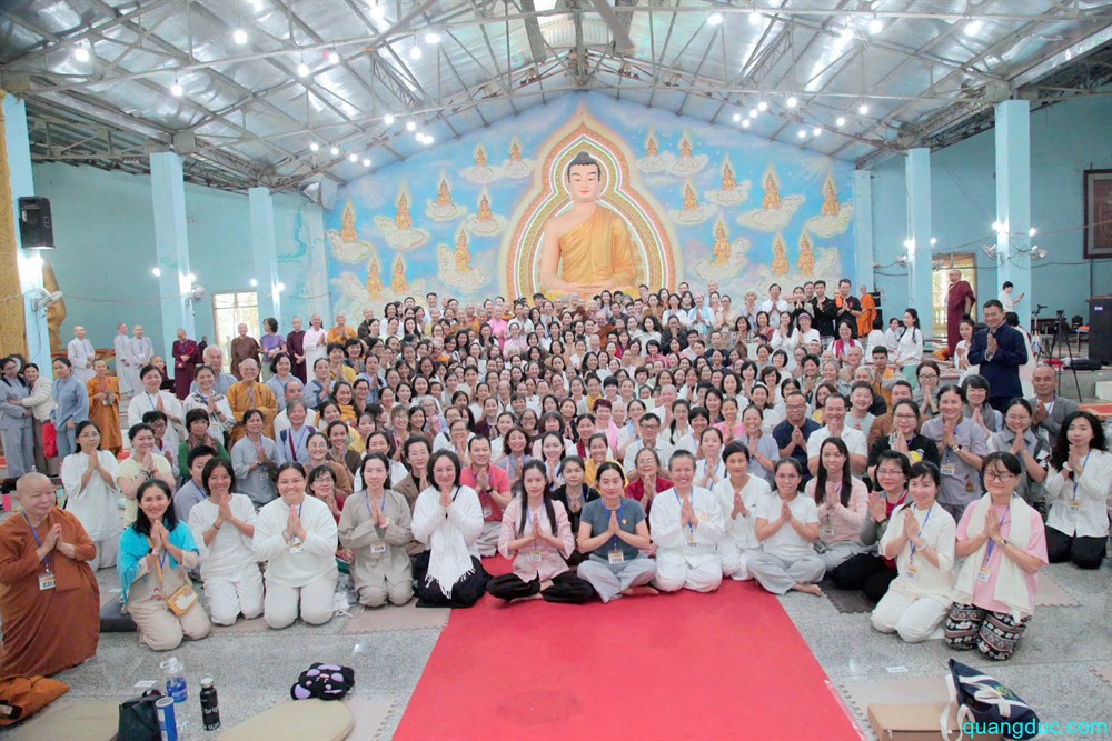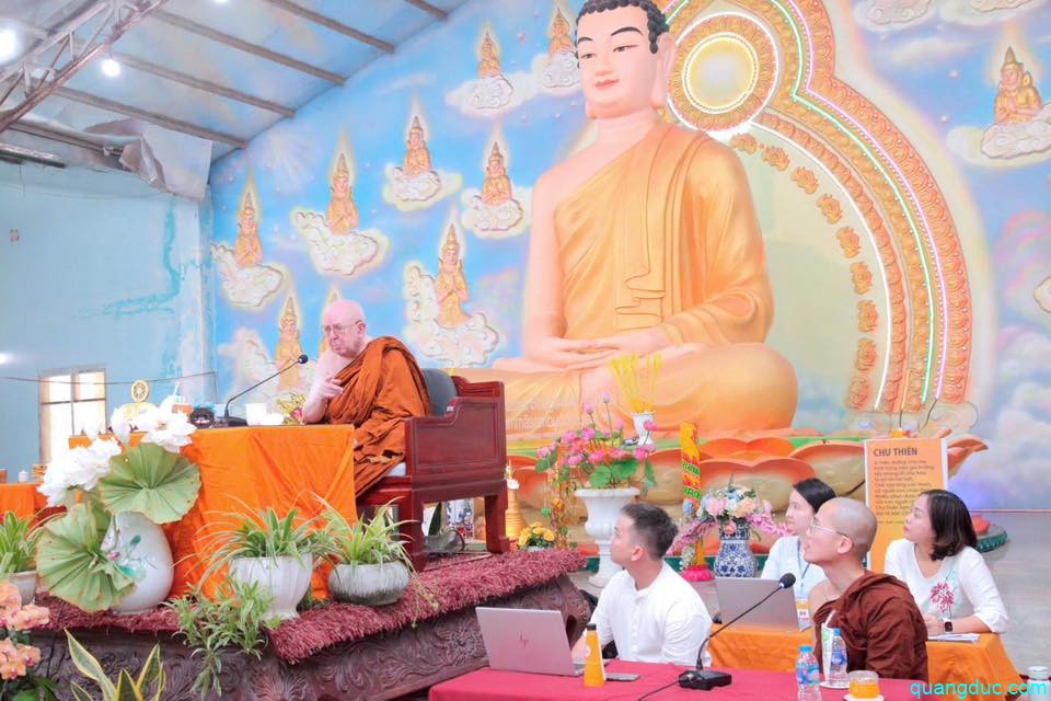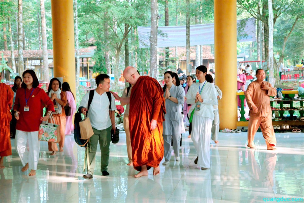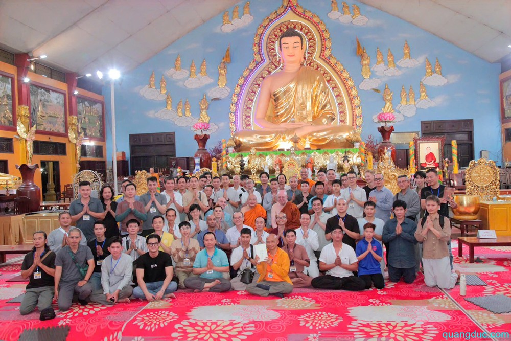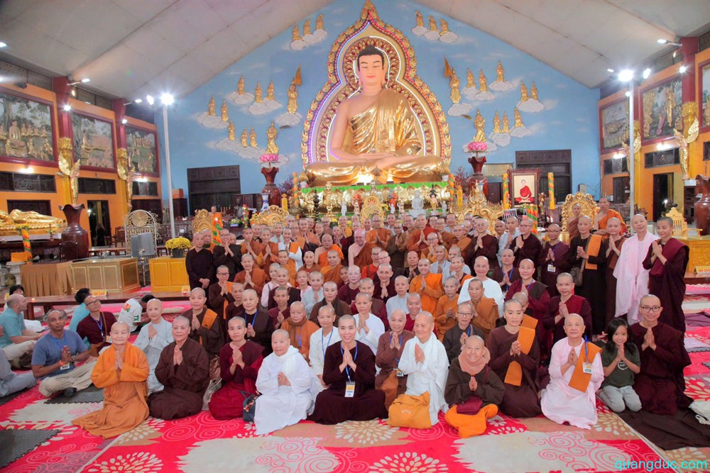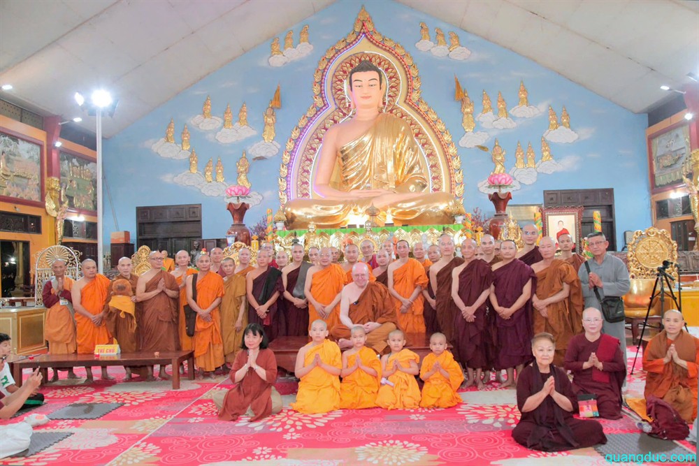 Cả đoàn cầm sách quý “Chánh niệm, Hỷ lạc và Giác ngộ” vừa có chữ ký tươi của Ngài trên tay, quây quần quanh Ngài trong tình Thầy trò Úc – Việt và cùng đồng thanh hô vang từ “tuyệt vời/ lành thay” bằng ngôn ngữ Pali: “Sadhu”