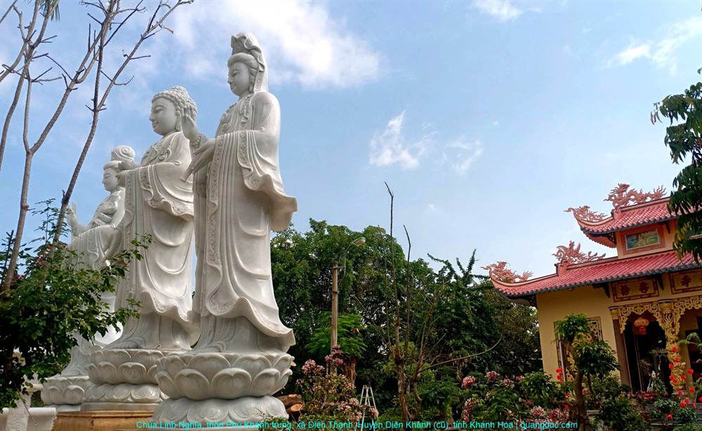 Ngày hôm nay, vùng đất trũng hoang vắng của miền quê ven cổ thành Diên Khánh đã hoàn toàn thay da đổi thịt với thị trấn sầm uất, phố chợ lao xao, nhà cửa chen chúc nhau san sát hai bên những con đường tráng nhựa, trải bê-tông... khi vào đến chùa Linh Nghĩa, ngay phía sau cổng tam quan, án ngữ nơi sân giữa là một thềm cao lát đá thiết đặt bệ đài tôn tượng "Tây Phương Tam Thánh" (còn được gọi là "A Di Đà Tam Tôn") bằng đá trắng thật cao lớn và uy nghi dưới nắng mưa nhật nguyệt.