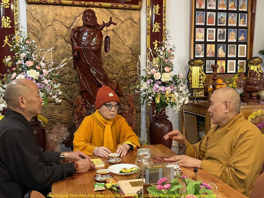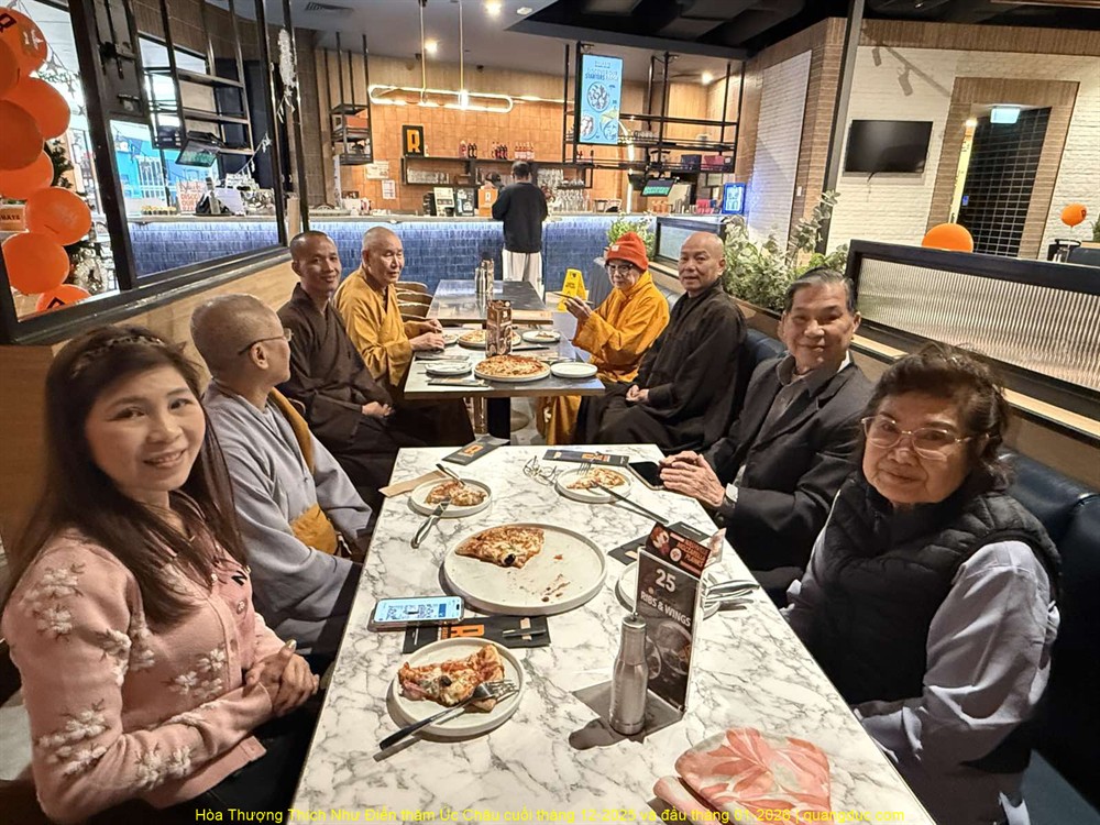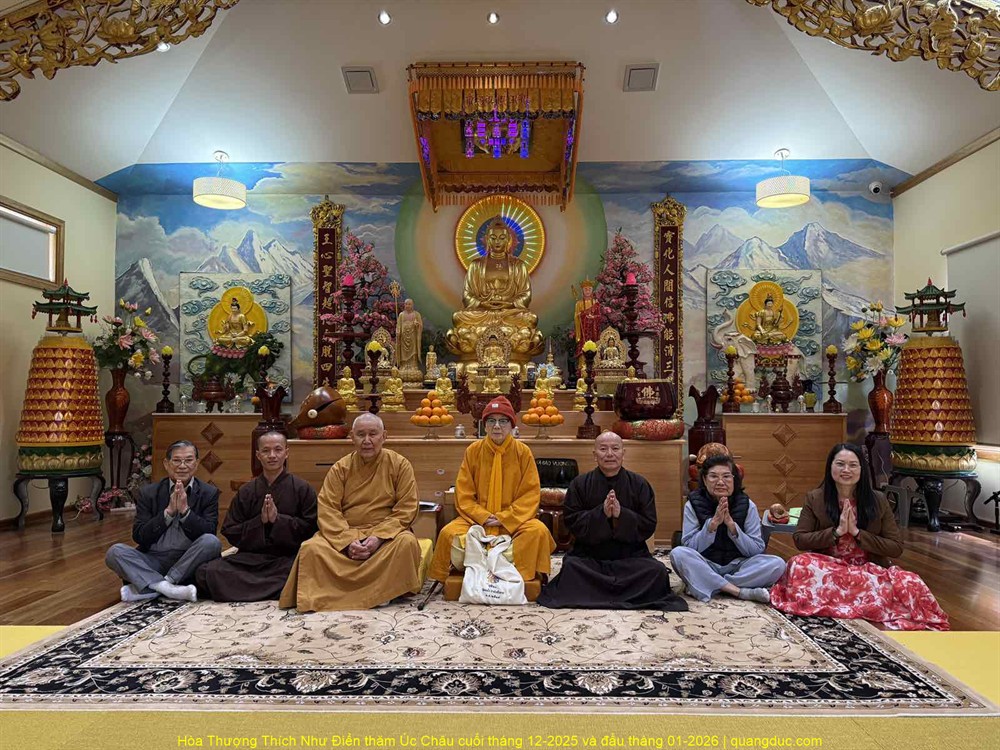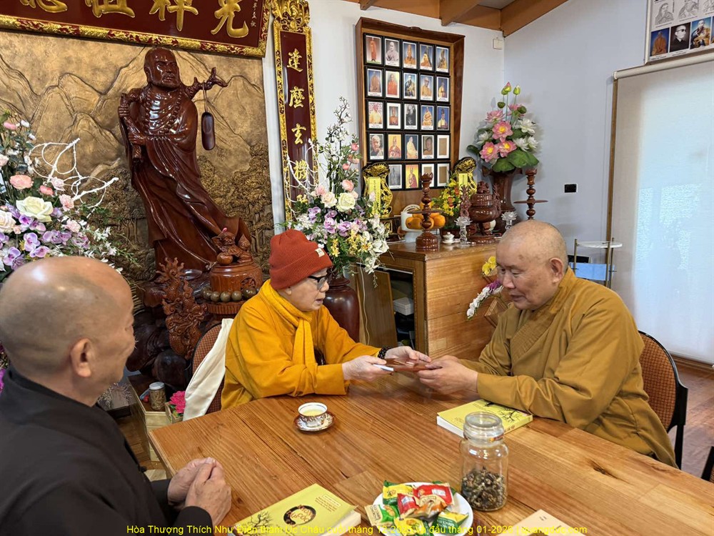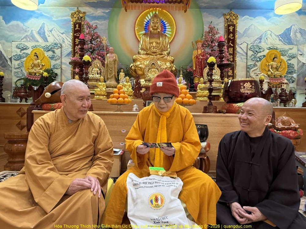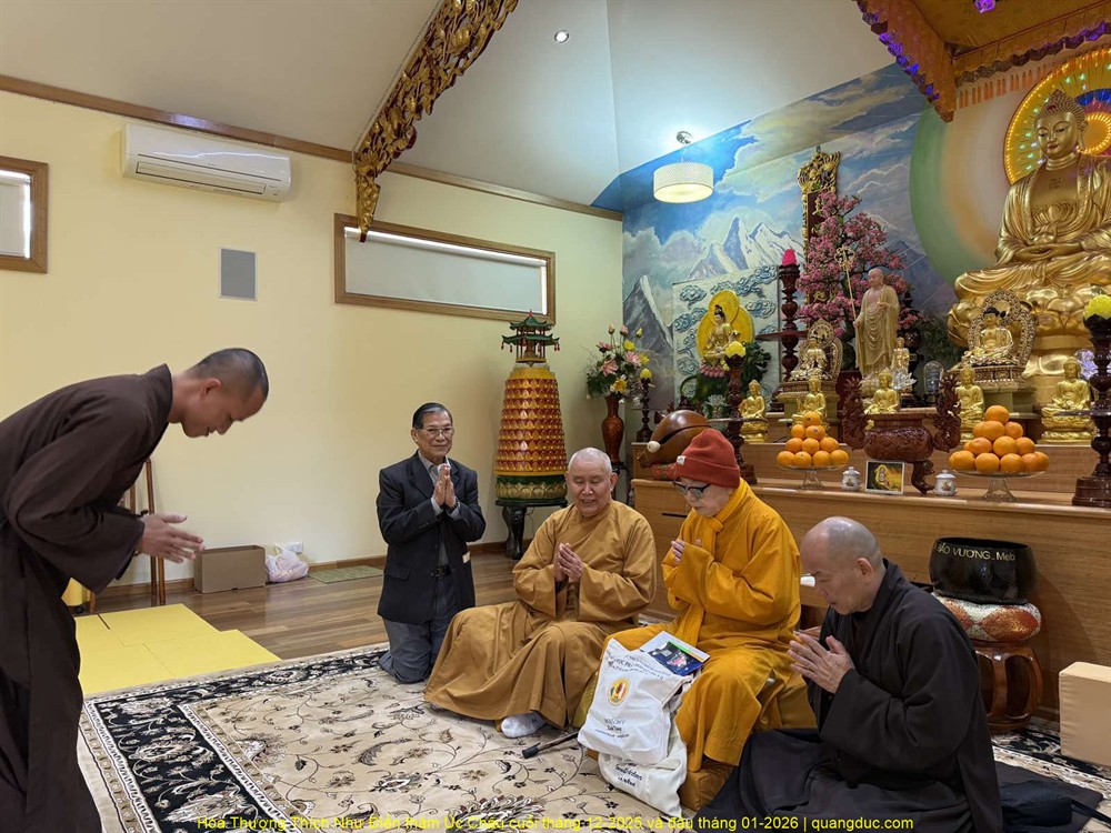 Buổi tối ngày 3.1.2026 Quý Phật Tử Việt Nam và Úc ngồi lại bên nhau để thăm hỏi và trả lời những thắc mắc của các Phật Tử hiện diện dưới sự chứng minh của Hoà Thượng Phương Trượng Thích Như Điển, Hoà Thượng Thích Tịnh Đạo, Thượng Toạ Thích Tịnh Giác, Thượng Toạ Thích Phước Tấn, Đại Đức Thích Tâm Thức. Một vị Đại Đức lái xe, Ni Sư TN Trí Hằng, Sư Cô TN Thanh Chân và ba vị Sư Cô khác đến từ Melbourne. Không khí thật là an vui của những ngày đầu năm mới Dương Lịch 2026. Những quà lưu niệm, bao lì xì, những món chay thanh đạm, nhưng đều thắm đạo tình pháp lữ.