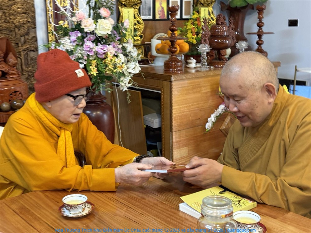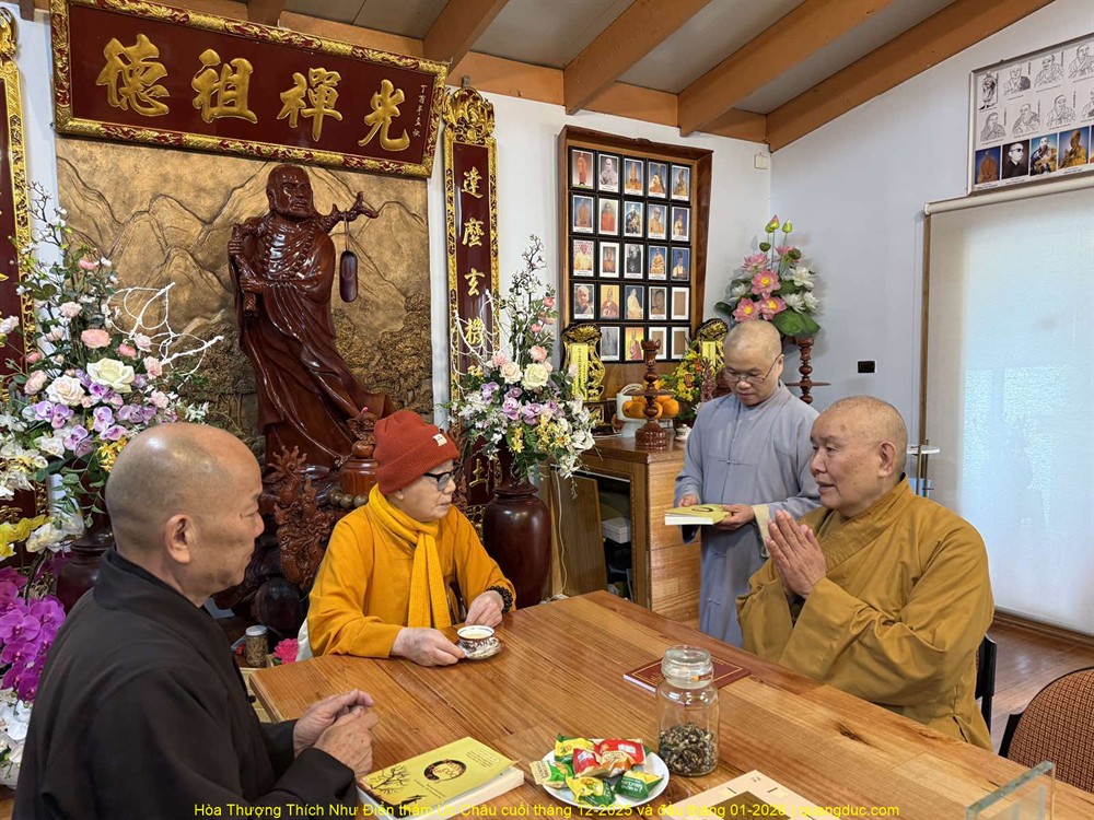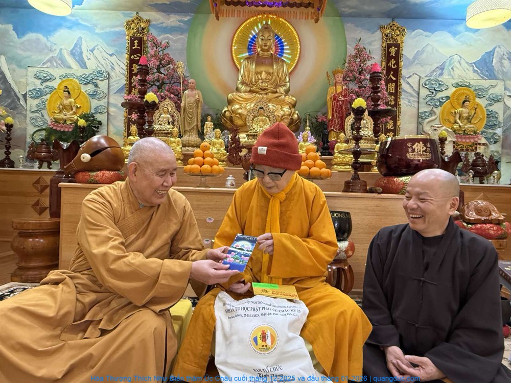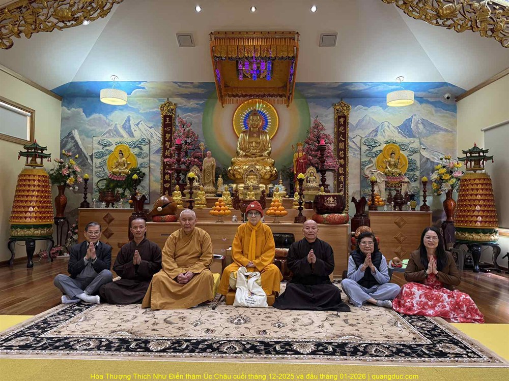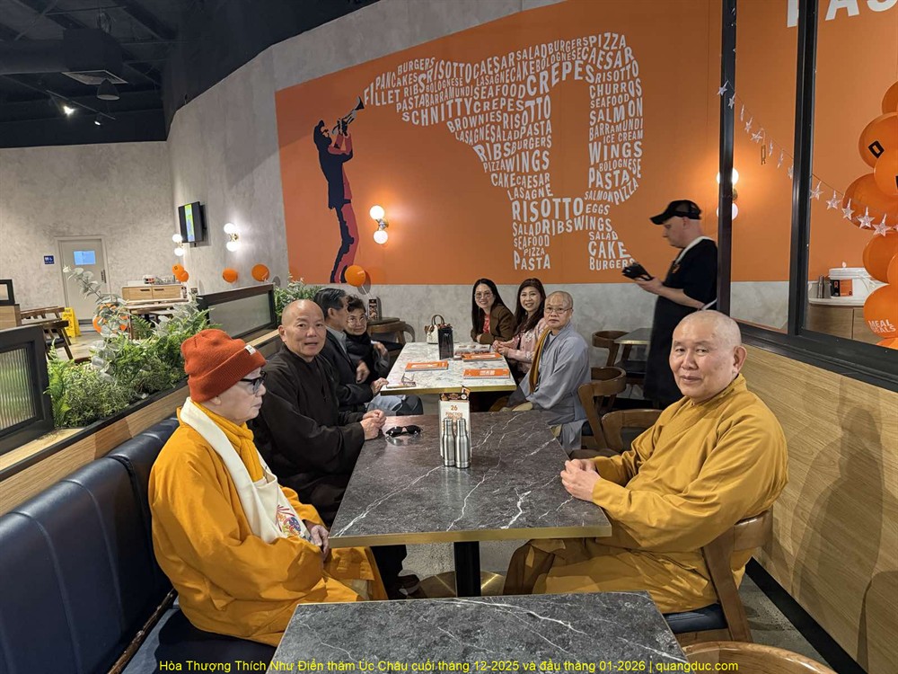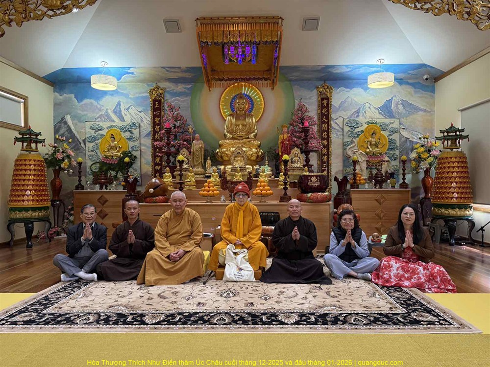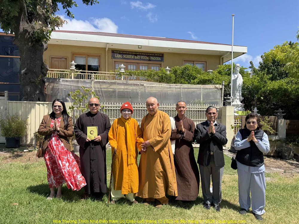 Buổi tối ngày 3.1.2026 Quý Phật Tử Việt Nam và Úc ngồi lại bên nhau để thăm hỏi và trả lời những thắc mắc của các Phật Tử hiện diện dưới sự chứng minh của Hoà Thượng Phương Trượng Thích Như Điển, Hoà Thượng Thích Tịnh Đạo, Thượng Toạ Thích Tịnh Giác, Thượng Toạ Thích Phước Tấn, Đại Đức Thích Tâm Thức. Một vị Đại Đức lái xe, Ni Sư TN Trí Hằng, Sư Cô TN Thanh Chân và ba vị Sư Cô khác đến từ Melbourne. Không khí thật là an vui của những ngày đầu năm mới Dương Lịch 2026. Những quà lưu niệm, bao lì xì, những món chay thanh đạm, nhưng đều thắm đạo tình pháp lữ.